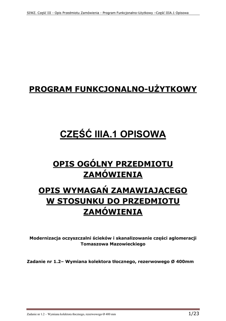 SIWZ. Część III - Opis Przedmiotu Zamówienia - Program Funkcjonalno-Użytkowy –Część IIIA.1 Opisowa PROGRAM FUNKCJONALNO-UŻYTKOWY CZĘŚĆ IIIA.1 OPISOWA OPIS OGÓLNY PRZEDMIOTU ZAMÓWIENIA OPIS WYMAGAŃ ZAMAWIAJĄCEGO W STOSUNKU DO PRZEDMIOTU ZAMÓWIENIA Modernizacja oczyszczalni ścieków i skanalizowanie części aglomeracji Tomaszowa Mazowieckiego Zadanie nr 1.2– Wymiana kolektora tłocznego, rezerwowego Ø 400mm Zadanie nr 1.2 – Wymiana kolektora tłocznego, rezerwowego Ø 400 mm 1/23 SIWZ. Część III - Opis Przedmiotu Zamówienia - Program Funkcjonalno-Użytkowy –Część IIIA.1 Opisowa SPIS TREŚCI 1. Opis 1.1. 1.2. 1.3. ogólny przedmiotu zamówienia ......................................................................... 4 Wstęp ................................................................................................................. 4 Zakres i przedmiot zamówienia .............................................................................. 4 Charakterystyczne parametry określające zakres zamówienia .................................... 5 1.3.1. 1.3.2. 1.3.3. 1.3.4. 1.3.5. 1.3.6. 1.3.7. 1.3.8. 1.3.9. 1.3.10. 1.3.11. 1.3.12. 1.3.13. 1.4. 1.4.1. 1.4.2. 1.4.3. 1.4.4. 1.4.5. 1.4.5.1. 1.4.5.2. 1.4.5.3. Wstęp ...................................................................................... 5 Wymiana kolektora tłocznego rezerwowego .................................. 5 Modernizacja estakady nad rzeką Wolbórką .................................. 6 Wykonanie kanalizacji teletechnicznej i ułożenie światłowodu .......... 7 Modernizacja komór K1,K2,K3 ..................................................... 7 Badania i analizy uzupełniające ................................................... 8 Uzgodnienia i decyzje administracyjne ......................................... 8 Mapy do celów projektowych ....................................................... 8 Nadzory i uzgodnienia stron trzecich ............................................ 8 Wizytacja Terenu Budowy ........................................................... 8 Dostępność terenu budowy ......................................................... 8 Inwentaryzacja stanu istniejącego. .............................................. 8 Zieleń ...................................................................................... 9 Aktualne uwarunkowania wykonania przedmiotu zamówienia ..................................... 9 Cel projektu, wykaz prawomocnych decyzji ................................... 9 Inne dokumenty ........................................................................ 9 Własność .................................................................................. 9 Lokalizacja inwestycji ................................................................. 9 Opis stanu istniejącego ............................................................ 10 Kolektor rezerwowy ........................................................................................... 10 Estakada .......................................................................................................... 10 Komory K1; K2; K3 ........................................................................................... 10 1.4.6. 1.4.7. Warunki gruntowo wodne ......................................................... 10 Ochrona zabytków ................................................................... 10 1.5. 1.6. 2. Opis 2.1. Ogólne właściwości funkcjonalno-użytkowe ............................................................. 11 Szczegółowe właściwości funkcjonalno-użytkowe ..................................................... 11 wymagań zamawiającego w stosunku do przedmiotu zamówienia .................. 11 Wymagania w zakresie projektowania .................................................................... 11 2.1.1. 2.1.2. 2.1.3. Zakres dokumentacji projektowej .............................................. 11 Wykorzystanie materiałów ........................................................ 12 Format dokumentacji ............................................................... 12 2.1.3.1. 2.1.3.2. 2.1.4. 2.2. Wydruki ........................................................................................................... 12 Dokumentacja w formie cyfrowej ........................................................................ 13 Liczba egzemplarzy .................................................................. 13 Wymagania w stosunku do przedmiotu zamówienia ................................................. 13 2.2.1. Wykonanie rezerwowego kolektora tłocznego PEHD ∅ 630 mm i stalowy ∅ 600 mm ................................................................................ 13 2.2.1.1. 2.2.1.2. 2.2.1.3. 2.2.1.4. 2.2.1.5. Wymagania technologiczne ................................................................................. 13 Wymagania konstrukcyjne .................................................................................. 13 Wymagania w zakresie instalacji ......................................................................... 14 Wykończenie .................................................................................................... 14 Zagospodarowanie terenu .................................................................................. 14 2.2.2. Wykonanie połączenia kolektora Ø 400 z kolektorem rezerwowym oraz modernizacja komory K1 ................................................................. 14 2.2.2.1. 2.2.2.2. 2.2.2.3. 2.2.2.4. 2.2.2.5. 2.2.2.6. Wymagania technologiczne ................................................................................. 14 Wymagania architektoniczne............................................................................... 14 Wymagania konstrukcyjne .................................................................................. 15 Wymagania w zakresie instalacji ...........................................