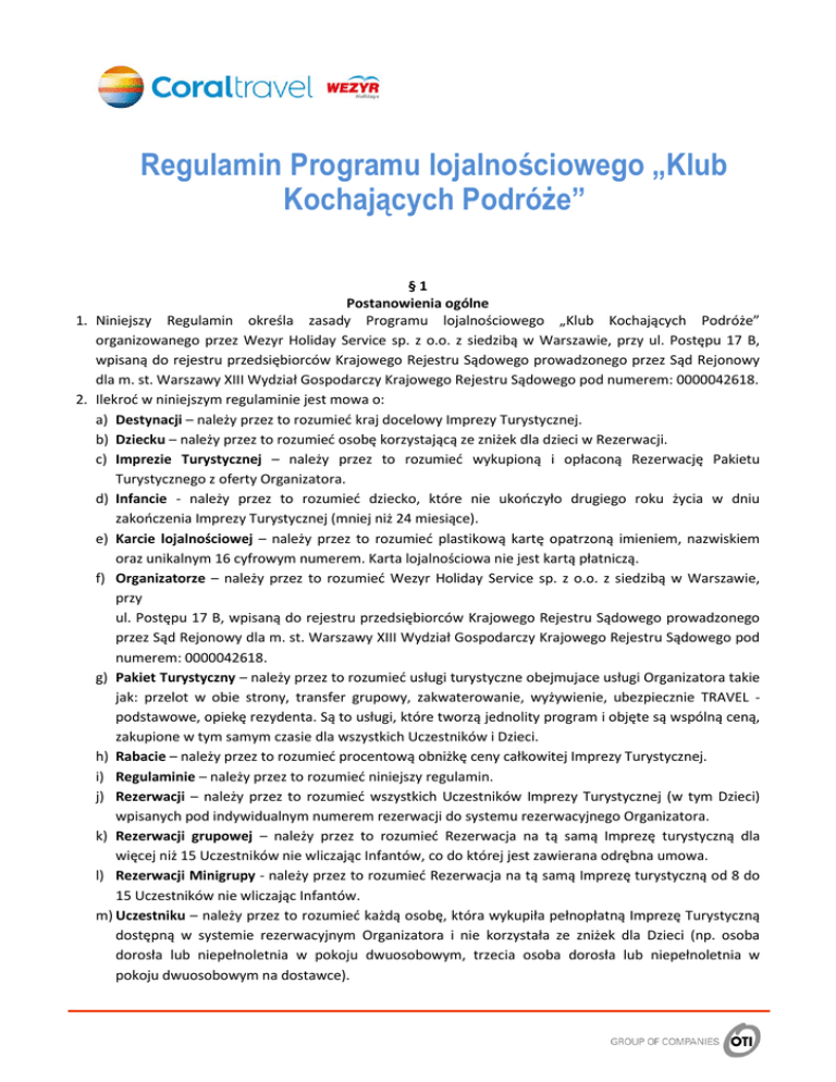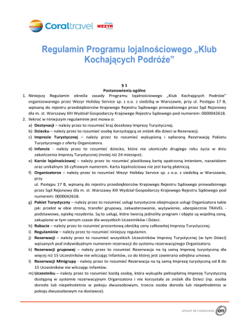 Regulamin Programu lojalnościowego „Klub Kochających Podróże” §1 Postanowienia ogólne 1. Niniejszy Regulamin określa zasady Programu lojalnościowego „Klub Kochających Podróże” organizowanego przez Wezyr Holiday Service sp. z o.o. z siedzibą w Warszawie, przy ul. Postępu 17 B, wpisaną do rejestru przedsiębiorców Krajowego Rejestru Sądowego prowadzonego przez Sąd Rejonowy dla m. st. Warszawy XIII Wydział Gospodarczy Krajowego Rejestru Sądowego pod numerem: 0000042618. 2. Ilekroć w niniejszym regulaminie jest mowa o: a) Destynacji – należy przez to rozumieć kraj docelowy Imprezy Turystycznej. b) Dziecku – należy przez to rozumieć osobę korzystającą ze zniżek dla dzieci w Rezerwacji. c) Imprezie Turystycznej – należy przez to rozumieć wykupioną i opłaconą Rezerwację Pakietu Turystycznego z oferty Organizatora. d) Infancie - należy przez to rozumieć dziecko, które nie ukończyło drugiego roku życia w dniu zakończenia Imprezy Turystycznej (mniej niż 24 miesiące). e) Karcie lojalnościowej – należy przez to rozumieć plastikową kartę opatrzoną imieniem, nazwiskiem oraz unikalnym 16 cyfrowym numerem. Karta lojalnościowa nie jest kartą płatniczą. f) Organizatorze – należy przez to rozumieć Wezyr Holiday Service sp. z o.o. z siedzibą w Warszawie, przy ul. Postępu 17 B, wpisaną do rejestru przedsiębiorców Krajowego Rejestru Sądowego prowadzonego przez Sąd Rejonowy dla m. st. Warszawy XIII Wydział Gospodarczy Krajowego Rejestru Sądowego pod numerem: 0000042618. g) Pakiet Turystyczny – należy przez to rozumieć usługi turystyczne obejmujace usługi Organizatora takie jak: przelot w obie strony, transfer grupowy, zakwaterowanie, wyżywienie, ubezpiecznie TRAVEL podstawowe, opiekę rezydenta. Są to usługi, które tworzą jednolity program i objęte są wspólną ceną, zakupione w tym samym czasie dla wszystkich Uczestników i Dzieci. h) Rabacie – należy przez to rozumieć procentową obniżkę ceny całkowitej Imprezy Turystycznej. i) Regulaminie – należy przez to rozumieć niniejszy regulamin. j) Rezerwacji – należy przez to rozumieć wszystkich Uczestników Imprezy Turystycznej (w tym Dzieci) wpisanych pod indywidualnym numerem rezerwacji do systemu rezerwacyjnego Organizatora. k) Rezerwacji grupowej – należy przez to rozumieć Rezerwacja na tą samą Imprezę turystyczną dla więcej niż 15 Uczestników nie wliczając Infantów, co do której jest zawierana odrębna umowa. l) Rezerwacji Minigrupy - należy przez to rozumieć Rezerwacja na tą samą Imprezę turystyczną od 8 do 15 Uczestników nie wliczając Infantów. m) Uczestniku – należy przez to rozumieć każdą osobę, która wykupiła pełnopłatną Imprezę Turystyczną dostępną w systemie rezerwacyjnym Organizatora i nie korzystała ze zniżek dla Dzieci (np. osoba dorosła lub niepełnoletnia w pokoju dwuosobowym, trzecia osoba dorosła lub niepełnoletnia w pokoju dwuosobowym na dostawce). 1. Treść Regulaminu dostępna www.wezyrholidays.pl 1. 2. 3. 4. 5. §2 Dostępność regulaminu jest na stronie internetowej Organizatora pod adresem: §3 Zasady uczestnictwa Program lojalnościowy „Klub Kochających Podróże“ [zwany dalej: „Programem“] prowadzony jest na terenie Rzeczpospolitej Polskiej, obowiązuje od 01.12.2014 do 31.05.2016 i dotyczy wszystkich Uczestników, którzy począwszy od 01.01.2011 roku skorzystali z Imprezy Turystycznej z oferty Organizatora. Przystępując do Programu każdy Uczestnik zobowiązany jest wypełnić formularz zgłoszeniowy dostępny na stronie www.wezyrholidays.pl. Po pomyślnej weryfikacji danych, Uczestnik otrzyma wiadomość zawierającą numer Karty lojalnościowej, upoważniający go do skorzystania z Programu. Pracownicy Organizatora oraz Właściciele/pracownicy biur podróży lub biur franczyzowych związanych umową agencyjną sprzedających Imprezy Turystyczne Organizatora nie mogą nabyć lub/i być posiadaczami Karty lojalnościowej. Każdy Uczestnik oświadcza, iż otrzymał, zapoznał się i akceptuje treść Regulaminu i jego postanowień. §4 Rabaty 1. Posiadaczowi Karty lojalnościowej przysługują następujące rabaty: a) 2% rabatu dla Imprezy Turystycznej do Destynacji egzotycznych realizowanych za pośrednictwem połączeń czarterowych, b) 3% rabatu dla Imprezy Turystycznej do następujących Destynacji: Turcja, Bułgaria, Hiszpania, Grecja i Egipt. 2. Aby Rezerwacja została objęta rabatem, jednym z Uczestników Imprezy Turystycznej musi być posiadacz Karty lojalnościowej. 3. Rabaty wynikajace z Kart lojalnościowych poszczególnych Uczestników w jednej Rezerwacji Imprezy Turystycznej nie mogą się sumować. 4. Rabat, w wysokości opisanej w §4 ust. 1, będzie naliczany dla każdej Rezerwacji dokonanej na wyloty do 23.10.2016 (włącznie). 5. Rabat, w wysokości opisanej w §4 ust. 1, będzie naliczany dla Rezerwacji dokonanej co najmniej 30 dni przed planowanym rozpoczęciem Imprezy Turytycznej. 6. Rabat naliczany będzie od ceny Pakietu Turystycznego i nie obejmuje innych świadczeń zakupionych dodatkowo (t.j.: dodatkowe ubezpieczenie, indywidualny transfer do/z hotelu). 7. Rabat będzie naliczany w ciągu 1 dnia roboczego, od dnia założenia Rezerwacji. Organizator poinformuje Uczestnika o naliczonym Rabacie. 8. Rabat może być wykorzystany jedynie do zakupu Pakietu Turystycznego z oferty Organizatora. 9. Rabaty opisane powyżej nie mogą być wymienione na gotówkę. 10.Rabaty wynikające z niniejszego Programu nię łączą się z rabatami wynikającymi z innych programów lojalnościowych. 11.Rabat wynikający z Programu nie może być wykorzystany na Rezerwacje grupowe oraz Rezerwację Minigrupy. 1. 2. 3. 4. 5. §5 Karta lojalnościowa Posiadaczem Karty lojalnościowej może być jedynie osoba, która w dniu wypełniania formularzu jest pełnoletnia. Organizator wyśle Kartę lojalnościową tylko i wyłącznie pod adres wskazany w formularzu zgłoszeniowy