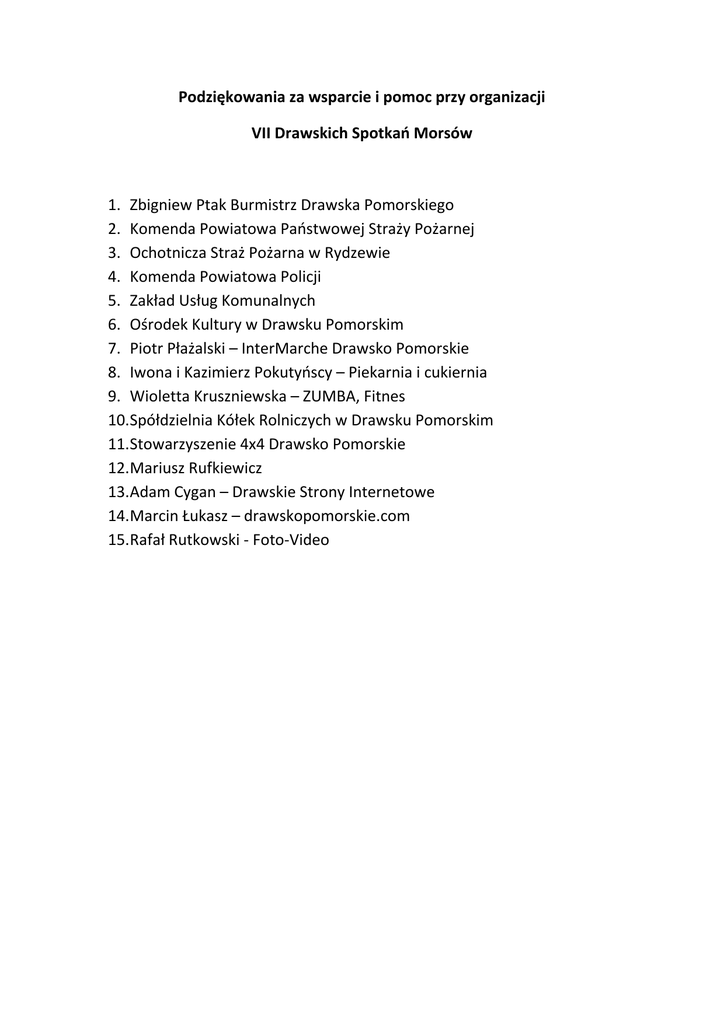 Podziękowania za wsparcie i pomoc przy organizacji VII Drawskich Spotkań Morsów 1. Zbigniew Ptak Burmistrz Drawska Pomorskiego 2. Komenda Powiatowa Państwowej Straży Pożarnej 3. Ochotnicza Straż Pożarna w Rydzewie 4. Komenda Powiatowa Policji 5. Zakład Usług Komunalnych 6. Ośrodek Kultury w Drawsku Pomorskim 7. Piotr Płażalski – InterMarche Drawsko Pomorskie 8. Iwona i Kazimierz Pokutyńscy – Piekarnia i cukiernia 9. Wioletta Kruszniewska – ZUMBA, Fitnes 10.Spółdzielnia Kółek Rolniczych w Drawsku Pomorskim 11.Stowarzyszenie 4x4 Drawsko Pomorskie 12.Mariusz Rufkiewicz 13.Adam Cygan – Drawskie Strony Internetowe 14.Marcin Łukasz – drawskopomorskie.com 15.Rafał Rutkowski - Foto-Video