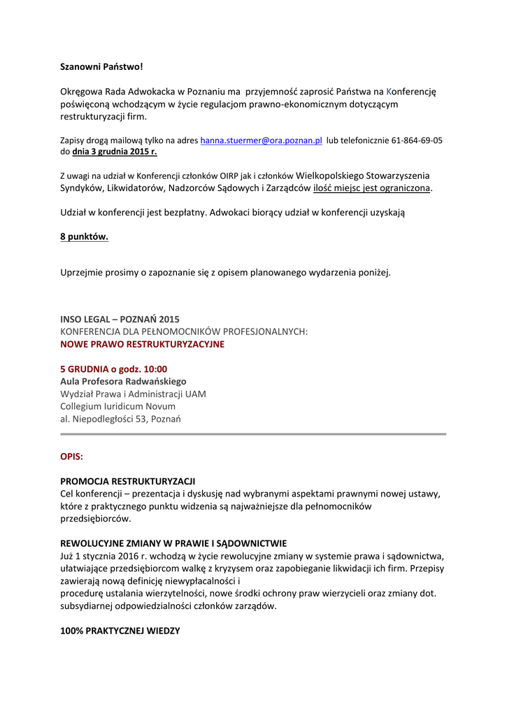 Szanowni Państwo! Okręgowa Rada Adwokacka w Poznaniu ma przyjemność zaprosić Państwa na Konferencję poświęconą wchodzącym w życie regulacjom prawno-ekonomicznym dotyczącym restrukturyzacji firm. Zapisy drogą mailową tylko na adres [email protected] lub telefonicznie 61-864-69-05 do dnia 3 grudnia 2015 r. Z uwagi na udział w Konferencji członków OIRP jak i członków Wielkopolskiego Stowarzyszenia Syndyków, Likwidatorów, Nadzorców Sądowych i Zarządców ilość miejsc jest ograniczona. Udział w konferencji jest bezpłatny. Adwokaci biorący udział w konferencji uzyskają 8 punktów. Uprzejmie prosimy o zapoznanie się z opisem planowanego wydarzenia poniżej. INSO LEGAL – POZNAŃ 2015 KONFERENCJA DLA PEŁNOMOCNIKÓW PROFESJONALNYCH: NOWE PRAWO RESTRUKTURYZACYJNE 5 GRUDNIA o godz. 10:00 Aula Profesora Radwańskiego Wydział Prawa i Administracji UAM Collegium Iuridicum Novum al. Niepodległości 53, Poznań OPIS: PROMOCJA RESTRUKTURYZACJI Cel konferencji – prezentacja i dyskusję nad wybranymi aspektami prawnymi nowej ustawy, które z praktycznego punktu widzenia są najważniejsze dla pełnomocników przedsiębiorców. REWOLUCYJNE ZMIANY W PRAWIE I SĄDOWNICTWIE Już 1 stycznia 2016 r. wchodzą w życie rewolucyjne zmiany w systemie prawa i sądownictwa, ułatwiające przedsiębiorcom walkę z kryzysem oraz zapobieganie likwidacji ich firm. Przepisy zawierają nową definicję niewypłacalności i procedurę ustalania wierzytelności, nowe środki ochrony praw wierzycieli oraz zmiany dot. subsydiarnej odpowiedzialności członków zarządów. 100% PRAKTYCZNEJ WIEDZY Omówienie nowych instrumentów restrukturyzacyjnych, panel dyskusyjny oraz niepowtarzalne grono prelegentów – doświadczonych ekspertów w zakresie restrukturyzacji. WSPÓŁTWÓRCY NOWEGO PRAWA RESTRUKTURYZACYJNEGO Zachęcamy do wysłuchania wystąpień współtwórców nowego Prawa restrukturyzacyjnego: sędzi dr hab. Anny Hrycaj, Przewodniczącej Zespołu powołanego przez Ministra Sprawiedliwości do przygotowania projektu ustawy – Prawo restrukturyzacyjne oraz członków tego zespołu – Piotra Zimmermana i dr. Patryka Filipiaka. PROGRAM KONFERENCJI 10.00 – 10.45 Nowe procedury restrukturyzacyjne jako druga szansa dla przedsiębiorcy. Nowa definicja niewypłacalności adw. dr Patryk Filipiak Syndyk licencjonowany Zimmerman Filipiak Restrukturyzacja S.A. 10.45 – 11.25 Procedura ustalania wierzytelności w postępowaniu restrukturyzacyjnym i upadłościowym Sędzia Łukasz Lipowicz SR Poznań-Stare Miasto w Poznaniu 11.25 – 11.45 Upadłość konsumencka: przesłanki ogłoszenia upadłości konsumenta oraz środki ochrony praw wierzycieli Anna Michalska syndyk licencjonowany . 11.45 – 12.00 Przerwa 12.00 – 12.45 Wpływ otwarcia postępowania restrukturyzacyjnego i ogłoszenia upadłości na inne postępowania sądowe Sędzia dr hab. Anna Hrycaj Sąd Okręgowy w Warszawie Dyskusja 12.45 – 13.15 Rola pełnomocnika profesjonalnego w wykonywaniu praw wierzyciela oraz dłużnika w postępowaniu restrukturyzacyjnym Piotr Zimmerman syndyk licencjonowany Zimmerman Filipiak Restrukturyzacja 13.15 – 13.45 Subsydiarna odpowiedzialność członków zarządów po 1 stycznia 2016 r. Maciej Geromin Ekspert w Zespole ds. prawa gospodarczego w Min.Gosp. 13.45 – 14.15 SESJA PYTAŃ I ODPOWIEDZI Panel dyskusyjny.