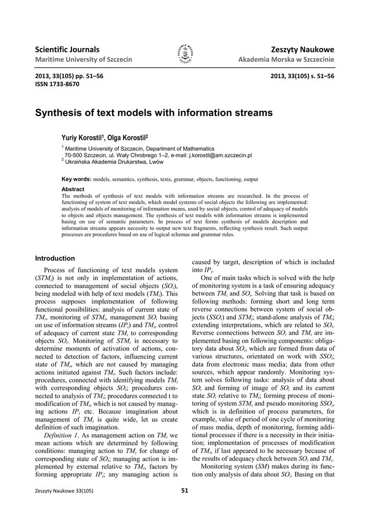 Scientific Journals Zeszyty Naukowe Maritime University of Szczecin Akademia Morska w Szczecinie 2013, 33(105) pp. 51–56 ISSN 1733-8670 2013, 33(105) s. 51–56 Synthesis of text models with information streams Yuriy Korostil1, Olga Korostil2 1 Maritime University of Szczecin, Department of Mathematics 70-500 Szczecin, ul. Wały Chrobrego 1–2, e-mail: [email protected] 2 Ukraińska Akademia Drukarstwa, Lwów Key words: models, semantics, synthesis, texts, grammar, objects, functioning, output Abstract The methods of synthesis of text models with information streams are researched. In the process of functioning of system of text models, which model systems of social objects the following are implemented: analysis of models of monitoring of information means, used by social objects, control of adequacy of models to objects and objects management. The synthesis of text models with information streams is implemented basing on use of semantic parameters. In process of text forms synthesis of models description and information streams appears necessity to output new text fragments, reflecting synthesis result. Such output processes are procedures based on use of logical schemas and grammar rules. Introduction caused by target, description of which is included into IPi. One of main tasks which is solved with the help of monitoring system is a task of ensuring adequacy between TMi and SOi. Solving that task is based on following methods: forming short and long term reverse connections between system of social objects (SSOi) and STMi; stand-alone analysis of TMi; extending interpretations, which are related to SOi. Reverse connections between SOi and TMi are implemented basing on following components: obligatory data about SOi, which are formed from data of various structures, orientated on work with SSOi; data from electronic mass media; data from other sources, which appear randomly. Monitoring system solves following tasks: analysis of data about SOi and forming of image of SOi and its current state SOi relative to TMi; forming process of monitoring of system STMi and pseudo monitoring SSOi, which is in definition of process parameters, for example, value of period of one cycle of monitoring of mass media, depth of monitoring, forming additional processes if there is a necessity in their initiation; implementation of processes of modification of TMi, if last appeared to be necessary because of the results of adequacy check between SOi and TMi. Monitoring system (SM) makes during its function only analysis of data about SOi. Basing on that Process of functioning of text models system (STMi) is not only in implementation of actions, connected to management of social objects (SOi), being modeled with help of text models (TMi). This process supposes implementation of following functional possibilities: analysis of current state of TMi, monitoring of STMi, management SOi basing on use of information streams (IPi) and TMi, control of adequacy of current state TMi to corresponding objects SOi. Monitoring of STMi is necessary to determine moments of activation of actions, connected to detection of factors, influencing current state of TMi, which are not caused by managing actions initiated against TMi. Such factors include: procedures, connected with identifying models TMi with corresponding objects SOi; procedures connected to analysis of TMi; procedures connected t to modification of TMi, which is not caused by managing actions IPi etc. Because imagination about management of TMi is quite wide, let us create definition of such imagination. Definition 1. As management action on TMi we mean actions which are determined by following conditions: managing action to TMi for change of corresponding state of SOi; managing action is implemented by external relative to TMi, factors by forming appropriate IPi; any managing action is Zeszyty Naukowe 33(105) 51 Yuriy Korostil, Olga Korostil TMi data for information package IPiV are selected in TMi; corresponding IPiV is transmitted to TMj as information extension in framework of TMj is made corresponding modification of TMj. To analyze more deep processes of functioning, implemented by TZi which can be written down as: TM*j = TZi(TMi, TMj), it is necessary to stop on structure of TMi in projection on subject area, which is described by STMi and separately by TMi. In that case structure of TMi will be characterized by following aspects: own structure aspects; structure aspects connected to subject area; general aspects of structure TMi. Existance of structure in TMi allows to form some rules of conduction of synthesis of TMi and IPi, when IPi extends TMi in form of usual concatenation J(TMi). Obviously IPi must be isomorphic to TMi not only at the level of language, used to describe TMi, but also at level of structure and rules of its forming [5, 6]. In that case it can talk about following rules of analysis which are used on separate step of functioning of STMi, which is defined or activated by management action of IPi. PR1: Determination of difference between separate fragments of interacting text descriptions can be formally described by following correlation: analysis a new model TMi is formed, if it was detected that new SOi object appeared, or modification of TMi is conducted, if changes of parameters in corresponding SOi were detected. Feedback which supplies data to STMi about SOi, which is modeled in STMi, is generally passive because capacity of activation of data transfer from SOi to STMi is quite limited. Due to existence of electronic communication means such activation can be implemented but not in determined form. This means that actions implemented by STMi lead to corresponding reaction from SOi through some period of time. STMi system from one side is a system of images SOi in form of TMi, and from other side STMi is a system helping to make modeling of management actions on separate SOi objects, or on whole system SSOi. Reliability of result