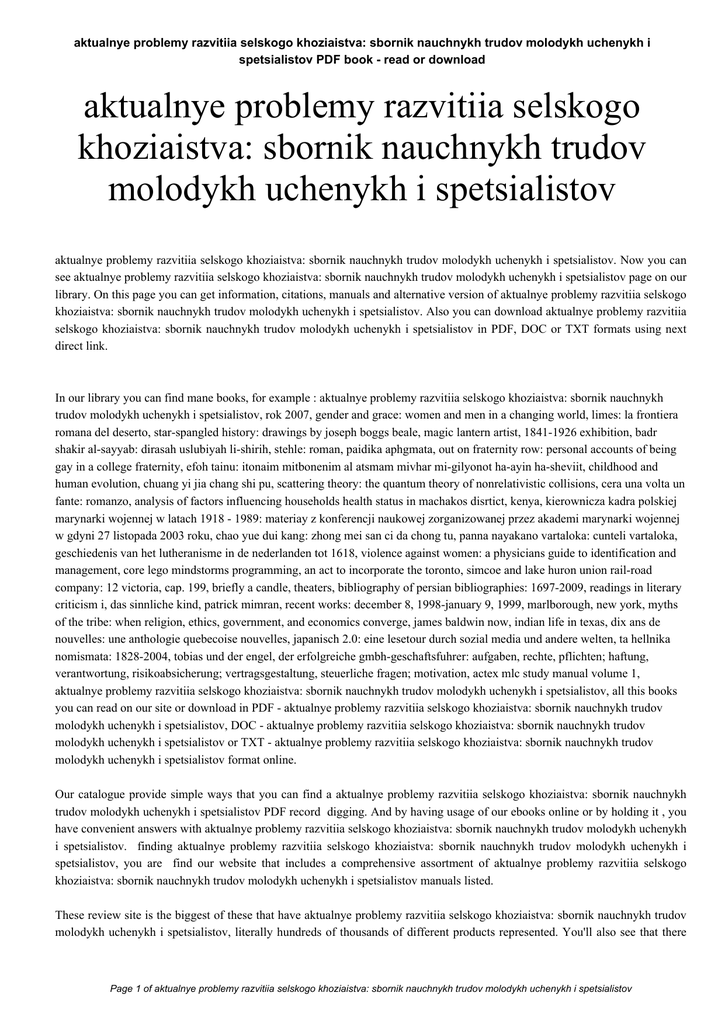aktualnye problemy razvitiia selskogo khoziaistva: sbornik nauchnykh trudov molodykh uchenykh i spetsialistov PDF book - read or download aktualnye problemy razvitiia selskogo khoziaistva: sbornik nauchnykh trudov molodykh uchenykh i spetsialistov aktualnye problemy razvitiia selskogo khoziaistva: sbornik nauchnykh trudov molodykh uchenykh i spetsialistov. Now you can see aktualnye problemy razvitiia selskogo khoziaistva: sbornik nauchnykh trudov molodykh uchenykh i spetsialistov page on our library. On this page you can get information, citations, manuals and alternative version of aktualnye problemy razvitiia selskogo khoziaistva: sbornik nauchnykh trudov molodykh uchenykh i spetsialistov. Also you can download aktualnye problemy razvitiia selskogo khoziaistva: sbornik nauchnykh trudov molodykh uchenykh i spetsialistov in PDF, DOC or TXT formats using next direct link. In our library you can find mane books, for example : aktualnye problemy razvitiia selskogo khoziaistva: sbornik nauchnykh trudov molodykh uchenykh i spetsialistov, rok 2007, gender and grace: women and men in a changing world, limes: la frontiera romana del deserto, star-spangled history: drawings by joseph boggs beale, magic lantern artist, 1841-1926 exhibition, badr shakir al-sayyab: dirasah uslubiyah li-shirih, stehle: roman, paidika aphgmata, out on fraternity row: personal accounts of being gay in a college fraternity, efoh tainu: itonaim mitbonenim al atsmam mivhar mi-gilyonot ha-ayin ha-sheviit, childhood and human evolution, chuang yi jia chang shi pu, scattering theory: the quantum theory of nonrelativistic collisions, cera una volta un fante: romanzo, analysis of factors influencing households health status in machakos disrtict, kenya, kierownicza kadra polskiej marynarki wojennej w latach 1918 - 1989: materiay z konferencji naukowej zorganizowanej przez akademi marynarki wojennej w gdyni 27 listopada 2003 roku, chao yue dui kang: zhong mei san ci da chong tu, panna nayakano vartaloka: cunteli vartaloka, geschiedenis van het lutheranisme in de nederlanden tot 1618, violence against women: a physicians guide to identification and management, core lego mindstorms programming, an act to incorporate the toronto, simcoe and lake huron union rail-road company: 12 victoria, cap. 199, briefly a candle, theaters, bibliography of persian bibliographies: 1697-2009, readings in literary criticism i, das sinnliche kind, patrick mimran, recent works: december 8, 1998-january 9, 1999, marlborough, new york, myths of the tribe: when religion, ethics, government, and economics converge, james baldwin now, indian life in texas, dix ans de nouvelles: une anthologie quebecoise nouvelles, japanisch 2.0: eine lesetour durch sozial media und andere welten, ta hellnika nomismata: 1828-2004, tobias und der engel, der erfolgreiche gmbh-geschaftsfuhrer: aufgaben, rechte, pflichten; haftung, verantwortung, risikoabsicherung; vertragsgestaltung, steuerliche fragen; motivation, actex mlc study manual volume 1, aktualnye problemy razvitiia selskogo khoziaistva: sbornik nauchnykh trudov molodykh uchenykh i spetsialistov, all this books you can read on our site or download in PDF - aktualnye problemy razvitiia selskogo khoziaistva: sbornik nauchnykh trudov molodykh uchenykh i spetsialistov, DOC - aktualnye problemy razvitiia selskogo khoziaistva: sbornik nauchnykh trudov molodykh uchenykh i spetsialistov or TXT - aktualnye problemy razvitiia selskogo khoziaistva: sbornik nauchnykh trudov molodykh uchenykh i spetsialistov format online. Our catalogue provide simple ways that you can find a aktualnye problemy razvitiia selskogo khoziaistva: sbornik nauchnykh trudov molodykh uchenykh i spetsialistov PDF record digging. And by having usage of our ebooks online or by holding it , you have convenient answers with aktualnye problemy razvitiia selskogo khoziaistva: sbornik nauchnykh trudov molodykh uchenykh i spetsialistov. finding aktualnye problemy razvitiia selskogo khoziaistva: sbornik nauchnykh trudov molodykh uchenykh i spetsialistov, you are find our website that includes a comprehensive assortment of aktualnye problemy razvitiia selskogo khoziaistva: sbornik nauchnykh trudov molodykh uchenykh i spetsialistov manuals listed. These review site is the biggest of these that have aktualnye problemy razvitiia selskogo khoziaistva: sbornik nauchnykh trudov molodykh uchenykh i spetsialistov, literally hundreds of thousands of different products represented. You'll also see that there Page 1 of aktualnye problemy razvitiia selskogo khoziaistva: sbornik nauchnykh trudov molodykh uchenykh i spetsialistov aktualnye problemy razvitiia selskogo khoziaistva: sbornik nauchnykh trudov molodykh uchenykh i spetsialistov PDF book - read or download are specific sites catered to different product categories or types, niche categories or brands related to aktualnye problemy razvitiia selskogo khoziaistva: sbornik nauchnykh trudov molodykh uchenykh i spetsialistov. So depending on what exactly you are searching, you will be able to choose ebooks aktualnye problemy razvitiia selskogo khoziaistva: sbornik nauchnykh trudov molodykh uchenykh i spetsialistov to suit your own needs, aktualnye problemy razvitiia selskogo khoziaistva: sbornik nauchnykh trudov molodykh uchenykh i spetsialistov. Page 2 of aktualnye problemy razvitiia selskogo khoziaistva: sbornik nauchnykh trudov molodykh uchenykh i spetsialistov