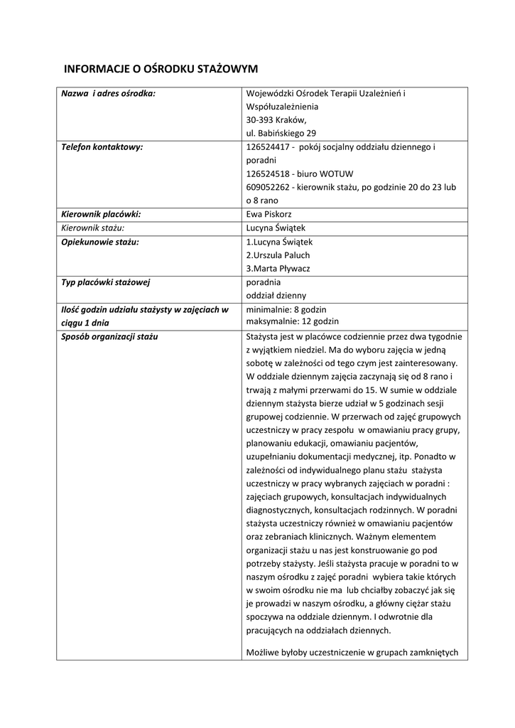 INFORMACJE O OŚRODKU STAŻOWYM Nazwa i adres ośrodka: Telefon kontaktowy: Kierownik placówki: Kierownik stażu: Opiekunowie stażu: Typ placówki stażowej Ilośd godzin udziału stażysty w zajęciach w ciągu 1 dnia Sposób organizacji stażu Wojewódzki Ośrodek Terapii Uzależnieo i Współuzależnienia 30-393 Kraków, ul. Babioskiego 29 126524417 - pokój socjalny oddziału dziennego i poradni 126524518 - biuro WOTUW 609052262 - kierownik stażu, po godzinie 20 do 23 lub o 8 rano Ewa Piskorz Lucyna Świątek 1.Lucyna Świątek 2.Urszula Paluch 3.Marta Pływacz poradnia oddział dzienny minimalnie: 8 godzin maksymalnie: 12 godzin Stażysta jest w placówce codziennie przez dwa tygodnie z wyjątkiem niedziel. Ma do wyboru zajęcia w jedną sobotę w zależności od tego czym jest zainteresowany. W oddziale dziennym zajęcia zaczynają się od 8 rano i trwają z małymi przerwami do 15. W sumie w oddziale dziennym stażysta bierze udział w 5 godzinach sesji grupowej codziennie. W przerwach od zajęd grupowych uczestniczy w pracy zespołu w omawianiu pracy grupy, planowaniu edukacji, omawianiu pacjentów, uzupełnianiu dokumentacji medycznej, itp. Ponadto w zależności od indywidualnego planu stażu stażysta uczestniczy w pracy wybranych zajęciach w poradni : zajęciach grupowych, konsultacjach indywidualnych diagnostycznych, konsultacjach rodzinnych. W poradni stażysta uczestniczy również w omawianiu pacjentów oraz zebraniach klinicznych. Ważnym elementem organizacji stażu u nas jest konstruowanie go pod potrzeby stażysty. Jeśli stażysta pracuje w poradni to w naszym ośrodku z zajęd poradni wybiera takie których w swoim ośrodku nie ma lub chciałby zobaczyd jak się je prowadzi w naszym ośrodku, a główny ciężar stażu spoczywa na oddziale dziennym. I odwrotnie dla pracujących na oddziałach dziennych. Możliwe byłoby uczestniczenie w grupach zamkniętych pracujących w settingu co tygodniowych spotkao ale wtedy stażysta musiałby przyjeżdżad co tydzieo co dla stażystów spoza Krakowa raczej nie jest do przyjęcia. Dałoby to możliwośd wprowadzenia stażysty w grupy zamknięte programu pogłębionego. Do rozważenia przez stażystów. Do zaliczenia stażu wymagane jest aktywne i zaangażowane uczestnictwo w ustalonych zajęciach. Stażysta podejmuje samodzielną pracę w drugim tygodniu stażu pod opieką i obserwacją członka zespołu (najczęściej jest to opiekun stażu).Każdy dzieo pracy stażysty jest omawiany na spotkaniu zespołu. Każdy tydzieo jest podsumowywany wraz z sugestiami co jest pozytywne a co do zmiany. Ocenie podlega nie tylko merytoryczna aktywnośd stażysty ale jego postawa do pacjentów, podejście do powierzonych zadao, punktualnośd, komunikatywnośd, rozumienie kliniczne zjawisk zachodzących w psychoterapii uzależnienia. Stażysta prowadzi krótki dziennik stażu. Stażysta dostaje informacje zwrotne na bieżąco od osób z którymi pracuje na grupie oraz na koniec stażu w formie pisemnej. Nie - ale pomagamy w znalezieniu taniej kwatery poza ośrodkiem Warunki zaliczenia stażu Możliwośd zakwaterowania w ośrodku stażowym Rodzaje zajęd, w których uczestniczy stażysta obowiązkowo opcjonalnie nie uczestniczy prowadzi współprowadzi * * obserwuje program podstawowy dla uzależnionych: Diagnoza * * * przyjęcie pacjenta do terapii sesje psychoterapii indywidualnej sesje psychoterapii grupowej * * układanie OPT tworzenie planów terapii program pogłębiony dla uzależnionych * * * * tworzenie planów terapii sesje psychoterapii indywidualnej sesje psychoterapii grupowej program podstawowy dla współuzależnionych * * spotkanie diagnostyczne * * * przyjęcie pacjenta do terapii tworzenie planów terapii * sesje psychoterapii indywidualnej * sesje psychoterapii grupowej program pogłębiony dla współuzależnionych * * * * * tworzenie planów terapii sesje psychoterapii indywidualnej sesje psychoterapii grupowej Pozostałe spotkania społeczności terapeutycznej prezentacja na zebraniach klinicznych zespołu sesje rodzinne * * * * program dla DDA program dla ofiar przemocy program dla sprawców przemocy program dla osób z uzależnieniem innym niż alkohol * * * prowadzenie dokumentacji medycznej Pozostałe informacje: Nasz ośrodek stażowy ma trzy ważne atuty: 1.Autorski program psychoterapii uzależnienia od alkoholu w oddziale dziennym oparty na wykorzystaniu w terapii procesu grupowego, analizy uzależnienia od alkoholu jako procesu dynamicznego w samym przebiegu ale także z uwzględnieniem dynamiki rozwojowej i życiowej pacjenta. Program ten jest w stałej superwizji . 2. Program terapeutyczny poradni, w którym oprócz programu terapeutycznego dla osób uzależnionych od alkoholu istnieje możliwośd uczestniczenia w sesjach rodzinnych oraz sesjach grupowych dla sprawców przemocy. Program poradni znajduje się pod stałą superwizją. 3.Dostąpnośd opiekuna i kierownika na co dzieo ,możliwośd korzystania z codziennej pracy klinicznej zespołu, omawianie każdej sesji grupowej na bieżąco, podobnie omawianie indywidualne każdego pacjenta .Stażysta jest dla nas cennym źródłem informacji!!. 4.Uroki starego Krakowa .