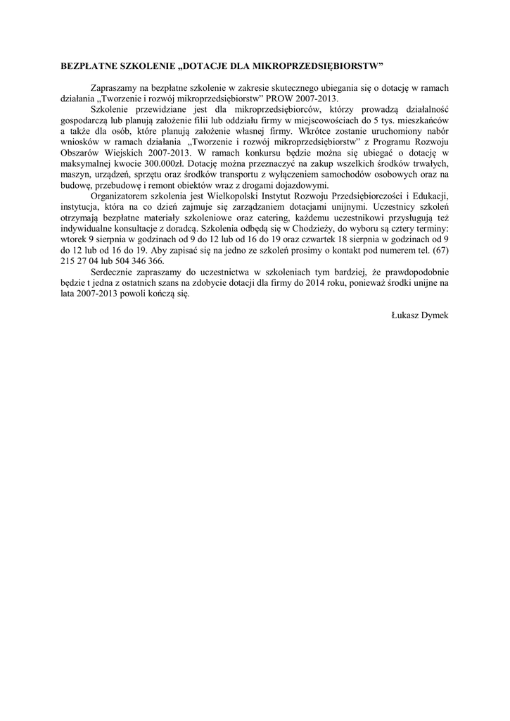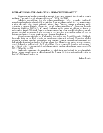 BEZPŁATNE SZKOLENIE „DOTACJE DLA MIKROPRZEDSIĘBIORSTW” Zapraszamy na bezpłatne szkolenie w zakresie skutecznego ubiegania się o dotację w ramach działania „Tworzenie i rozwój mikroprzedsiębiorstw” PROW 2007-2013. Szkolenie przewidziane jest dla mikroprzedsiębiorców, którzy prowadzą działalność gospodarczą lub planują założenie filii lub oddziału firmy w miejscowościach do 5 tys. mieszkańców a także dla osób, które planują założenie własnej firmy. Wkrótce zostanie uruchomiony nabór wniosków w ramach działania „Tworzenie i rozwój mikroprzedsiębiorstw” z Programu Rozwoju Obszarów Wiejskich 2007-2013. W ramach konkursu będzie można się ubiegać o dotację w maksymalnej kwocie 300.000zł. Dotację można przeznaczyć na zakup wszelkich środków trwałych, maszyn, urządzeń, sprzętu oraz środków transportu z wyłączeniem samochodów osobowych oraz na budowę, przebudowę i remont obiektów wraz z drogami dojazdowymi. Organizatorem szkolenia jest Wielkopolski Instytut Rozwoju Przedsiębiorczości i Edukacji, instytucja, która na co dzień zajmuje się zarządzaniem dotacjami unijnymi. Uczestnicy szkoleń otrzymają bezpłatne materiały szkoleniowe oraz catering, każdemu uczestnikowi przysługują też indywidualne konsultacje z doradcą. Szkolenia odbędą się w Chodzieży, do wyboru są cztery terminy: wtorek 9 sierpnia w godzinach od 9 do 12 lub od 16 do 19 oraz czwartek 18 sierpnia w godzinach od 9 do 12 lub od 16 do 19. Aby zapisać się na jedno ze szkoleń prosimy o kontakt pod numerem tel. (67) 215 27 04 lub 504 346 366. Serdecznie zapraszamy do uczestnictwa w szkoleniach tym bardziej, że prawdopodobnie będzie t jedna z ostatnich szans na zdobycie dotacji dla firmy do 2014 roku, ponieważ środki unijne na lata 2007-2013 powoli kończą się. Łukasz Dymek