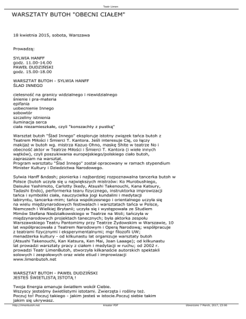 Teatr Limen WARSZTATY BUTOH "OBECNI CIAŁEM" 18 kwietnia 2015, sobota, Warszawa Prowadzą: SYLWIA HANFF godz. 11.00-14.00 PAWEŁ DUDZIŃSKI godz. 15.00-18.00 WARSZTAT BUTOH - SYLWIA HANFF ŚLAD INNEGO cielesność na granicy widzialnego i niewidzialnego śnienie i pra-materia epifania uobecnienie Innego sobowtór szczeliny istnienia iluminacja serca ciała niezamieszkałe, czyli "konszachty z pustką" Warsztat butoh "Ślad Innego" eksploruje istotny związek tańca butoh z Teatrem Miłości i Śmierci T. Kantora. Jeśli interesuje Cię, co łączy makijaż w butoh wg. mistrza Kazuo Ohno, maskę Shite w teatrze No i obecność aktor w Teatrze Miłości i Śmierci T. Kantora (i wiele innych wątków), czyli poszukiwania europejskiego/polskiego ciało butoh, zapraszam na warsztat. Program warsztatu "Ślad Innego" został opracowany w ramach stypendium Minister Kultury i Dziedzictwa Narodowego. Sylwia Hanff – pionierka i najbardziej rozpoznawalna tancerka butoh w Polsce (butoh uczyła się u największych mistrzów: Ko Murobushiego, Daisuke Yashimoto, Carlotty Ikedy, Atsushi Takenouchi, Kana Katsury, Tadashi Endo), performerka tearu fizycznego, instruktorka improwizacji tańca i symboliki ciała, nauczycielka jogi kundalini i medytacji labiryntu, tancerka-mim; tańca współczesnego i orientalnego uczyła się na wielu międzynarodowych festiwalach i warsztatach tańca w Polsce, Niemczech i Wielkiej Brytanii; uczyła się i występowała ze Studiem Mimów Stefana Niedziałkowskiego w Teatrze na Woli; tańczyła w międzynarodowych projektach tanecznych; była aktorka zespołu Warszawskiego Teatru Pantomimy przy Teatrze Żydowskim w Warszawie, 10 lat współpracowała z Teatrem Narodowym i Operą Narodową; współpracuje z teatrami fizycznymi i eksperymentalnymi; mgr filozofii UW; menadżerka kultury - od kilkunastu lat organizuje warsztaty butoh (Atsushi Takenouchi, Kan Katsura, Ken Mai, Joan Laaage); od kilkunastu lat prowadzi warsztaty pracy z ciałem i medytacji w ruchu; od 2002 r. prowadzi Teatr LimenButoh, stworzyła kilkanaście autorskich spektakli solowych i zespołowych oraz wiele etiud i improwizacji www.limenbutoh.net WARSZTAT BUTOH - PAWEŁ DUDZIŃSKI JESTEŚ ŚWIETLISTĄ ISTOTĄ ! Twoja Energia emanuje światłem wokół Ciebie. Wszyscy jesteśmy świetlistymi istotami. Zwierzęta i rośliny też. Poczuj to! Poczuj takiego - jakim jesteś w istocie.Poczuj siebie takim jakim się ukrywasz. http://limenbutoh.net Kreator PDF Utworzono 7 March, 2017, 23:06 Teatr Limen Pukam do Twego mózgu - otwórz się! Pukam do Twego serca - otwórz się! Po to właśnie żyjesz na tym świecie. Popatrz na drzewo. Zobacz jak ono stoi: dostojnie, potężnie a jednak delikatnie. Potrafisz tak stać? To jest właśnie BUTOH! Ale oto pojawił się wiatr! Popatrz jak to drzewo tańczy. Zaczyna od liści. Potem tańczą małe gałązki, później grube konary. Ale oto idzie burza! Drzewo walczy z wichurą! To jest właśnie Twoje butoh! Stój, poruszaj się, walcz! Oto cała filozofia. Paweł Dudziński urodził się 18 02 1944 w Lublinie. Dyplom z rzeźby uzyskał we wrocławskiej PWSSP w 1973 roku. W 1983 roku założył Teatr Performer w Zamościu, który łączy taniec butoh do muzyki wykonywanej na żywo. Z teatrem wykonał Największe Malowidło na świecie o powierzchni 17.830 metrów kwadratowych na placach , uliczkach i Rynku Wielkim w Zamościu wpisane do Księgi Rekordów Guinnessa w 1997 roku. Ze swym teatrem występował na wielu ważnch festiwalach w kraju i Europie. W Zamościu stworzył Międznarodowy Festiwal Sztuk Intuitywnych polegający na zbiorowej kreacji teatralnej, który istnieje do teraz już w Lubiążu gdzie przebywa od pięciu lat. Tańczył od dziecka w zespołach folklorystycznych. Na studiach w zespole Krakus i później w Zespole Śląsk. Tańca butoh uczył się od takich Mistrzów jak Joan Laage, Daisuke Yaschimoto, Rita Batarita i Ko Murobuschi. Stworzył odmianę butoh wzbogacając go o działania performatywne z obszaru plastyki jak action painting i body art. Gdzie stykając się z tworzywem malarskim - tworzy na swoim ciele specyficzny kostium aktorski a przenosząc akcję na płótno wiszące bądź leżące - tworzy unikatowy zapis energii spektaklu. Jakość takiego wystąpienia zależeć będzie od energii miejsca i atmosfery jaką stworzą widzowie oraz muzycy Zapisy i informacje: [email protected] tel. 607640208 MIEJSCE: Centrum Promocji Kultury (sala taneczna) ul. Podskarbińska 2, Warszawa (Praga Południe) www.cpk.art.pl/ Organizacja: CPK i Teatr Limen Butoh www.limenbutoh.net http://limenbutoh.net Kreator PDF Utworzono 7 March, 2017, 23:06