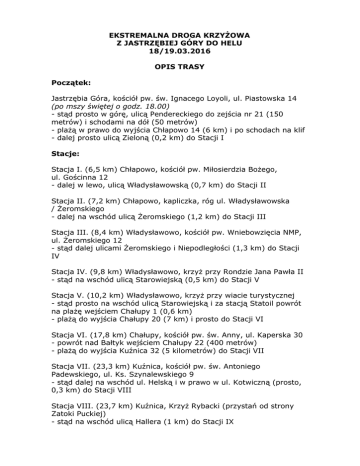 EKSTREMALNA DROGA KRZYŻOWA Z JASTRZĘBIEJ GÓRY DO HELU 18/19.03.2016 OPIS TRASY Początek: Jastrzębia Góra, kościół pw. św. Ignacego Loyoli, ul. Piastowska 14 (po mszy świętej o godz. 18.00) stąd prosto w górę, ulicą Pendereckiego do zejścia nr 21 (150 metrów) i schodami na dół (50 metrów) plażą w prawo do wyjścia Chłapowo 14 (6 km) i po schodach na klif dalej prosto ulicą Zieloną (0,2 km) do Stacji I Stacje: Stacja I. (6,5 km) Chłapowo, kościół pw. Miłosierdzia Bożego, ul. Gościnna 12 dalej w lewo, ulicą Władysławowską (0,7 km) do Stacji II Stacja II. (7,2 km) Chłapowo, kapliczka, róg ul. Władysławowska / Żeromskiego dalej na wschód ulicą Żeromskiego (1,2 km) do Stacji III Stacja III. (8,4 km) Władysławowo, kościół pw. Wniebowzięcia NMP, ul. Żeromskiego 12 stąd dalej ulicami Żeromskiego i Niepodległości (1,3 km) do Stacji IV Stacja IV. (9,8 km) Władysławowo, krzyż przy Rondzie Jana Pawła II stąd na wschód ulicą Starowiejską (0,5 km) do Stacji V Stacja V. (10,2 km) Władysławowo, krzyż przy wiacie turystycznej stąd prosto na wschód ulicą Starowiejską i za stacją Statoil powrót na plażę wejściem Chałupy 1 (0,6 km) plażą do wyjścia Chałupy 20 (7 km) i prosto do Stacji VI Stacja VI. (17,8 km) Chałupy, kościół pw. św. Anny, ul. Kaperska 30 powrót nad Bałtyk wejściem Chałupy 22 (400 metrów) plażą do wyjścia Kuźnica 32 (5 kilometrów) do Stacji VII Stacja VII. (23,3 km) Kuźnica, kościół pw. św. Antoniego Padewskiego, ul. Ks. Szynalewskiego 9 stąd dalej na wschód ul. Helską i w prawo w ul. Kotwiczną (prosto, 0,3 km) do Stacji VIII Stacja VIII. (23,7 km) Kuźnica, Krzyż Rybacki (przystań od strony Zatoki Puckiej) stąd na wschód ulicą Hallera (1 km) do Stacji IX Stacja IX. (24,7 km) Kuźnica, kapliczka św. Barbary, ul. Morska stąd ulicą Morską na wprost do wejścia Kuźnica 35 (0,1 km) dalej plażą do wyjścia Jastarnia 46 (6 km) i prosto do Stacji X Stacja X. (31,0 km) Jastarnia, kościół pw. Nawiedzenia NMP, ul. Ks. Stefańskiego 32 stąd na wschód ulicami Stefańskiego, Sychty (0,9 km) do Stacji XI Stacja XI. (31,9 km) Jastarnia, krzyż, róg ul. Sychty i Kościuszki stąd prosto na wschód ulicami Sychty, Mickiewicza (1,1 km) do Stacji XII Stacja XII. (33,0 km) Jastarnia, krzyż, ul. Mickiewicza 2 stąd dalej prosto w kierunku Helu ulicami Mickiewicza, Wojska Polskiego (1,3 km) do Stacji XIII Stacja XIII. (34,4 km) Jurata, kościół pw. Matki Boskiej Nieustającej Pomocy, ul. Ks. Gołębiowskiego 1 stąd ulicami Ratibora (na wprost) i Międzymorze (na skrzyżowaniu w lewo) do wejścia Jurata 60 (0,6 km) powrót w głąb lądu wyjściem Hel 64 (11 km) stąd drogą przez las i ulicą Kaszubską (na wprost, 2 km) do Stacji XIV Stacja XIV. (48,2 km) Hel, kapliczka św. Piotra, ul. Żeglarska (przy wejściu na nabrzeże portowe) stąd ulicą Morską (w prawo), Wuja Klemensa (prosto) do ul. Żeromskiego (w lewo) (w sumie 600 metrów) do celu Zakończenie: (48,7 km) Hel, kościół pw. Bożego Ciała, ul. Żeromskiego 1 W przypadku wyjątkowo niekorzystnych warunków atmosferycznych (np. sztorm) możliwe jest pokonanie trasy EDK (lub jej wybranych fragmentów) ścieżką rowerową prowadzącą od strony Zatoki Puckiej lub niebieskim szlakiem turystycznym, wiodącym równolegle, przez las. więcej informacji: www.EDK.PoPiasku.pl www.facebook.com/JastrzebiaGora.EDK/ ilustrowany opis trasy: tinyurl.com/HEDK2016 Kontakt z liderem Rejonu +48 603 305 401 [email protected]