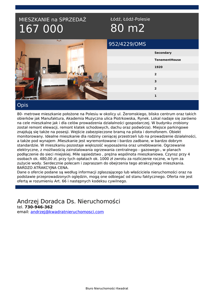 MIESZKANIE na SPRZEDAŻ 167 000 Łódź, Łódź-Polesie 80 m2 952/4229/OMS Secondary TenementHouse 1920 2 3 2 1 Opis 80- metrowe mieszkanie położone na Polesiu w okolicy ul. Żeromskiego, blisko centrum oraz takich obierków jak Manufaktura, Akademia Muzyczna ulica Piotrkowska, Rynek. Lokal nadaje się zarówno na cele mieszkalne jak i dla celów prowadzenia działalności gospodarczej. W budynku zrobiony został remont elewacji, remont klatek schodowych, dachu oraz podwórza). Miejsce parkingowe znajdują się także na posesji. Wejście zabezpieczone bramą na pilota i domofonem. Obiekt monitorowany. Idealne mieszkanie dla rodziny ceniącej przestrzeń lub na prowadzenie działalności, a także pod wynajem .Mieszkanie jest wyremontowane i bardzo zadbane, w bardzo dobrym standardzie. W mieszkaniu pozostaje większość wyposażenia oraz umeblowanie. Ogrzewanie elektryczne, z możliwością zainstalowania ogrzewania centralnego - gazowego-, w planach podłączenie do sieci miejskiej. Miłe sąsiedztwo , prężna wspólnota mieszkaniowa. Czynsz przy 4 osobach ok. 480,00 zł, przy tych opłatach ok. 1000 zł zwrotu za rozliczenie roczne, w tym za zużycie wody. Serdecznie polecam i zapraszam do obejrzenia tego atrakcyjnego mieszkania. BARDZO ATRAKCYJNA CENA. Dane o ofercie podane są według informacji zgłaszającego lub właściciela nieruchomości oraz na podstawie przeprowadzonych oględzin, mogą one odbiegać od stanu faktycznego. Oferta nie jest ofertą w rozumieniu Art. 66 i następnych kodeksu cywilnego. Andrzej Doradca Ds. Nieruchomości tel. 730-946-362 email: [email protected] Biuro Nieruchomości Kwadrat Powered by TCPDF (www.tcpdf.org)