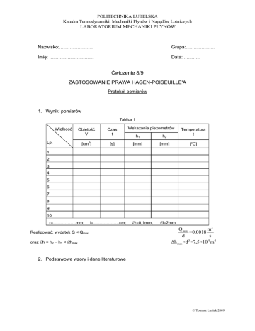 POLITECHNIKA LUBELSKA Katedra Termodynamiki, Mechaniki Płynów i Napędów Lotniczych LABORATORIUM MECHANIKI PŁYNÓW Nazwisko:.......................... Grupa:...................... Imię: .................................. Data: ............ Ćwiczenie 8/9 ZASTOSOWANIE PRAWA HAGEN-POISEUILLE'A Protokół pomiarów 1. Wyniki pomiarów Tablica 1 Wielkość Lp. Objętość V 3 [cm ] Czas t [s] Wskazania piezometrów h1 h2 [mm] [mm] ∆r=0,1mm, ∆l=2mm Temperatura t [ºC] 1 2 3 4 5 6 7 8 9 10 r=…………….mm; l=………………cm; Realizować: wydatek Q < Qmax oraz ∆h = h2 − h1 < ∆hmax Q max m2 =0,0018 d s 3 -9 4 ∆h max ×d =7,5×10 m 2. Podstawowe wzory i dane literaturowe © Tomasz Łusiak 2009 POLITECHNIKA LUBELSKA Katedra Termodynamiki, Mechaniki Płynów i Napędów Lotniczych LABORATORIUM MECHANIKI PŁYNÓW 3. Zakres ćwiczenia 1) Dla każdego pomiaru wyznaczyć wartość ν i odczytać wartość literaturową νr. 2) Dla każdego pomiaru wyznaczyć wartość współczynnika λ. Do obliczania wartości λ i Re wykorzystywać literaturowe wartości ν (nie korzystać z wartości wyznaczonych w p. 1). 3) W układzie współrzędnych (logλ, logRe) z punktu 4 nanieść literaturową zależność !ogλ=f(logRe). 4) Sporządzić wykres zależności ∆h=h2-h1 od prędkości średniej v. 5) W sprawozdaniu przedstawić pełne obliczenia dla jednego pomiaru. 6) Wypełnić tablicę 2 w protokole obliczeń. © Tomasz Łusiak 2009 POLITECHNIKA LUBELSKA Katedra Termodynamiki, Mechaniki Płynów i Napędów Lotniczych LABORATORIUM MECHANIKI PŁYNÓW Ćwiczenie 8/9 ZASTOSOWANIE PRAWA HAGEN-POISEUILLE'A Protokół obliczeń 1. Wyniki obliczeń Tablica 2 Wielkość Q 3 [m /s] ∆p 2 [N/m ] ν 2 [m /s] λ [-] v [m/s] Re [-] νr 2 [m /s] λ - wartość literaturowa Lp. 1 2 3 4 5 6 7 8 9 10 2. Wykresy do wykonania 1) Wykresy zależności λ=λ(Re) w skali logarytmicznej • według danych doświadczalnych, • według danych literaturowych lub w skali liniowej funkcji logλ=f(logRe), 2) Wykres zależności ∆h od prędkości średniej v. Interpretacja zależności, porównanie z teorią. © Tomasz Łusiak 2009