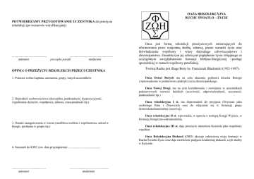 OAZA REKOLEKCYJNA RUCHU ŚWIATŁO – śYCIE POTWIERDZAMY PRZYGOTOWANIE UCZESTNIKA do przeŜycia rekolekcji (po rozmowie weryfikacyjnej) .......................................... animator .................................................... pieczątka parafii moderator OPINIA O PRZEśYCIU REKOLEKCJI PRZEZ UCZESTNIKA 1. Postawa wobec kapłana, animatora, grupy, innych uczestników Oaza jest formą rekolekcji przeŜyciowych zmierzających do uformowania przez wzajemną słuŜbę, zabawę, proste warunki Ŝycia oraz doświadczenie wspólnoty i wiary dojrzałego człowieczeństwa i chrześcijaństwa. Zasadniczym jej celem jest pogłębienie Ŝycia religijnego ze szczególnym uwzględnieniem formacji biblijno-liturgicznej i posługi apostolskiej w ramach wspólnoty parafialnej. Twórcą Ruchu jest Sługa BoŜy ks. Franciszek Blachnicki (1921-1987). Oaza Dzieci BoŜych ma na celu ukazanie godności dziecka BoŜego i wprowadzenie w podstawowe praktyki Ŝycia chrześcijańskiego. Oaza Nowej Drogi, ma na celu kształtowanie i rozwijanie w uczestnikach podstawowych wartości ludzkich (uczciwość, odpowiedzialność, uczynność, punktualność itp.) 2. Dojrzałość osobowościowa (dyscyplina, punktualność, dyspozycyjność, wypełnianie dyŜurów, współpraca, zabawa, emocjonalność itp.) Oaza rekolekcyjna I st. ma doprowadzić do przyjęcia Chrystusa jako osobistego Pana i Zbawiciela oraz do włączenia się w formację grupy deuterokatechumenalnej (oazowej). Oaza rekolekcyjna II st. wprowadza, w oparciu o teologię Księgi Wyjścia, w formację liturgiczno-sakramentalną. 3. Oznaki zaangaŜowania w wierze (modlitwa osobista i wspólnotowa, udział w liturgii, spotkania w grupie itp.) Oaza rekolekcyjna III st. daje przeŜycie misterium Kościoła jako wspólnoty wspólnot. Oaza Rekolekcyjna Diakonii (ORD) ukazuje całościową wizję formacji w Ruchu Światło-śycie oraz daje moŜliwość podjęcia konkretnej diakonii, czyli słuŜby w Kościele. 4. Stosunek do KWC (ew. data przystąpienia) ........................................... ............................................. animator .................................................... moderator INFORMACJE DLA RODZICÓW 1. KARTA UCZESTNIKA Prosimy uczestników o zabranie: ksiąŜeczki zdrowia, aktualnej legitymacji szkolnej; Pisma Świętego, róŜańca; zeszytu – notatnika i przyborów do pisania; pieczątka Diakonii Oaz Rekolekcyjnych śpiwora, odpowiedniego stroju do kościoła (dziewczęta – długie (za kolana) OAZY REKOLEKCYJNEJ RUCHU ŚWIATŁO-śYCIE OśK 2010 spódnice, chłopcy – długie spodnie, ministranci i lektorzy - komŜę lub albę); odświętnego ubioru, odzieŜy sportowej, nakrycia głowy i stroju Turnus ..... Stopień ......... Termin ….….…… Miejscowość ..................................... przeciwdeszczowego, przyborów toaletowych. 2. Regulamin: Na rekolekcjach nie będzie moŜna: korzystać z odtwarzaczy mp3/mp4 itp. ul...............................................................tel..................................................... zajęć, posiadać i uŜywać alkoholu, narkotyków i papierosów, przebywać w nie kod………………………………miejscowość………………………………. swoich pokojach oraz naruszać ciszy nocnej. Rekolektanci uczestniczą w e-mail …………………................data urodzenia ............................................ pod opieką animatora. Kontakt z rodzicami w czasie trwania oazy (adres, nr telefonu) Do ośrodka rekolekcyjnego naleŜy przyjechać po godz. 1500 a przed 1700. ………………………………………………………………………………… Wyjazd nastąpi ostatniego dnia oazy po rannej Mszy Świętej. Nie przewiduje OŚWIADCZENIE RODZICA Zgadzam się, by moje dziecko wzięło udział w rekolekcjach oazowych. Zobowiązuję się w przypadku powaŜnych problemów zdrowotnych lub wychowawczych do odbioru dziecka z ośrodka rekolekcyjnego oraz zaświadczam, iŜ zapoznałem się z regulaminem. Data:………………………..………………………………………………… Ze względu na rekolekcyjny charakter oazy prosimy usilnie, aby rodzice, krewni, koledzy nie odwiedzali dziecka w czasie trwania rekolekcji. 5. Zgłoszenia bez zaliczki, karty zdrowia, wypełnione niedokładnie nie będą przyjmowane. 6. po klasie.....................................PESEL............................................................ Uczestnik rekolekcji zobowiązany jest do wypełniania poleceń animatorów. się późniejszych przyjazdów oraz wcześniejszych wyjazdów uczestników. 4. Imię i nazwisko ………………………………………………………………. urządzeń, opuszczać terenu ośrodka bez opiekuna, uŜywać telefonów w czasie dyŜurach gospodarczych i porządkowych w kuchni i innych pomieszczeniach 3. Wypełniamy część A i B drukowanymi literami czytelny podpis rodzica lub prawnego opiekuna dziecka Osobom, które nie dojechały na oazę zaliczki nie będą zwracane. W kwotę opłaty za rekolekcje wliczone jest ubezpieczenie dzieci. ________________________________________________________ B. POTWIERDZENIE WPŁACENIA ZALICZKI (wypełnia uczestnik oazy) Turnus .... Stopień ........... Termin …..…...….. Miejscowość ................................... Imię i nazwisko ............................................................................................................. ul. .................................................. kod ............. miejscowość ..................................... 100zł FORMACJA– zakreśl, w czym uczestniczyłeś: ODB, rekolekcje ewangelizacyjne, 4 spotkania nad Łk i 8 nad J, 0ND Io, IIo, IIIo, ERś po 0ND Io, IIo, IIIo, Io, 11 rozmów ewangelicznych, 10 kroków ku dojrzałości chrześcijańskiej (ile…..), IIo, 11 kręgów biblijnych, kręgi liturgiczne, notatnik wielkopostny, Triduum Paschalne, IIIo, Droga do wspólnoty, Szkoła Chrystusa,