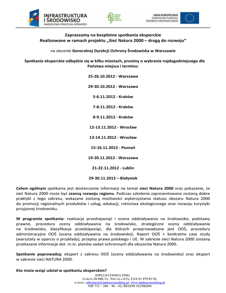 Zapraszamy na bezpłatne spotkania eksperckie Realizowane w ramach projektu „Sieć Natura 2000 – drogą do rozwoju” na zlecenie Generalnej Dyrekcji Ochrony Środowiska w Warszawie Spotkanie eksperckie odbędzie się w kilku miastach, prosimy o wybranie najdogodniejszego dla Państwa miejsca i terminu: 25-26.10.2012 - Warszawa 29-30.10.2012 - Warszawa 5-6.11.2012 - Kraków 7-8.11.2012 - Kraków 8-9.11.2012 - Kraków 12-13.11.2012 - Wrocław 13-14.11.2012 - Wrocław 15-16.11.2012 - Poznań 19-20.11.2012 - Warszawa 21-22.11.2012 - Lublin 29-30.11.2012 – Białystok Celem ogólnym spotkania jest dostarczenie informacji na temat sieci Natura 2000 oraz pokazanie, że sieć Natura 2000 może być szansą rozwoju regionu. Podczas szkolenia zaprezentowane zostaną dobre praktyki z tego zakresu, wskazane zostaną możliwości wykorzystania statusu obszaru Natura 2000 do promocji regionalnych produktów i usług, edukacji, rolnictwa ekologicznego oraz rozwoju turystyki przyjaznej środowisku. W programie spotkania: realizacja przedsięwzięć i ocena oddziaływania na środowisko, podstawy prawne, procedura oceny oddziaływania na środowisko, strategiczne oceny oddziaływania na środowisko, klasyfikacja przedsięwzięć, dla których przeprowadzana jest OOŚ, procedury administracyjne OOŚ (ocena oddziaływania na środowisko), Raport OOŚ + konkretne case study (warsztaty w oparciu o przykłady), przepisy prawa polskiego i UE. W zakresie sieci Natura 2000 zostaną przekazane informacje dot. m.in. planów zadań ochronnych dla obszarów Natura 2000. Spotkanie poprowadzą: ekspert z zakresu OOŚ (oceny oddziaływania na środowisko) oraz ekspert w zakresie sieci NATURA 2000. Kto może wziąć udział w spotkaniu eksperckim? INPLUS CONSULTING LUBLIN 20-080, UL. NIECAŁA 4/5A, FAX 81 479 83 30, E-MAIL: [email protected], www.inplusconsulting.pl NIP 712 – 268 – 86 – 62, REGON 432306204 Uczestnikami spotkań eksperckich mogą być osoby, które są przedstawicielami JST (jednostek samorządu terytorialnego) i ukończyły szkolenie z zakresu Europejskiej Sieci Ekologicznej Natura 2000, dostępne na platformie e-learningowej e-natura2000.pl realizowane przez Generalną Dyrekcję Ochrony Środowiska. Co trzeba zrobić, aby wziąć udział w spotkaniu? Należy wypełnić i dostarczyć formularz zgłoszeniowy: • pocztą na adres: [email protected], • faksem - tel. 81 479 83 30 • lub dostarczyć osobiście do biura INPLUS CONSULTING przy ul. Niecała 4/5a, 20-080 Lublin Liczba miejsc ograniczona!!! Spotkanie eksperckie realizowane będzie metodą warsztatową (grupy do 30 osób). Każdy uczestnik projektu otrzyma bezpłatnie pakiet materiałów szkoleniowych, promocyjnych (w tym podręcznik NATURA 2000), pełne wyżywienie w trakcie szkoleń, nocleg. Osoba do kontaktu: Małgorzata Suprynowicz Tel. 535 000 523, mail: [email protected] INPLUS CONSULTING LUBLIN 20-080, UL. NIECAŁA 4/5A, FAX 81 479 83 30, E-MAIL: [email protected], www.inplusconsulting.pl NIP 712 – 268 – 86 – 62, REGON 432306204
