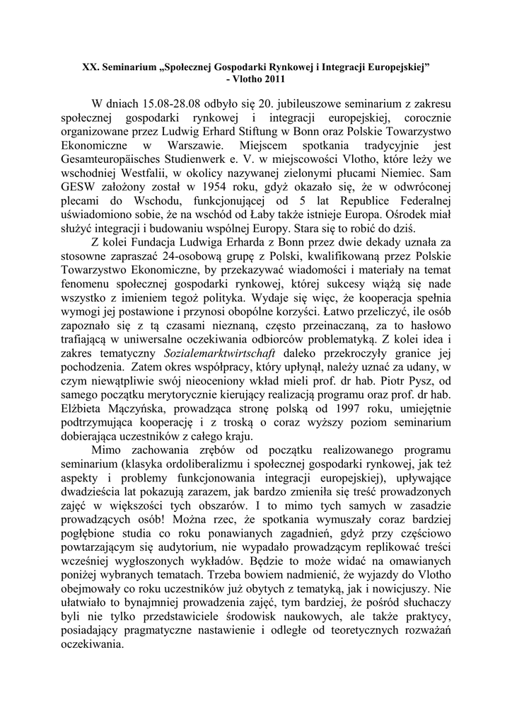 XX. Seminarium „Społecznej Gospodarki Rynkowej i Integracji Europejskiej” - Vlotho 2011 W dniach 15.08-28.08 odbyło się 20. jubileuszowe seminarium z zakresu społecznej gospodarki rynkowej i integracji europejskiej, corocznie organizowane przez Ludwig Erhard Stiftung w Bonn oraz Polskie Towarzystwo Ekonomiczne w Warszawie. Miejscem spotkania tradycyjnie jest Gesamteuropäisches Studienwerk e. V. w miejscowości Vlotho, które leży we wschodniej Westfalii, w okolicy nazywanej zielonymi płucami Niemiec. Sam GESW założony został w 1954 roku, gdyż okazało się, że w odwróconej plecami do Wschodu, funkcjonującej od 5 lat Republice Federalnej uświadomiono sobie, że na wschód od Łaby także istnieje Europa. Ośrodek miał służyć integracji i budowaniu wspólnej Europy. Stara się to robić do dziś. Z kolei Fundacja Ludwiga Erharda z Bonn przez dwie dekady uznała za stosowne zapraszać 24-osobową grupę z Polski, kwalifikowaną przez Polskie Towarzystwo Ekonomiczne, by przekazywać wiadomości i materiały na temat fenomenu społecznej gospodarki rynkowej, której sukcesy wiążą się nade wszystko z imieniem tegoż polityka. Wydaje się więc, że kooperacja spełnia wymogi jej postawione i przynosi obopólne korzyści. Łatwo przeliczyć, ile osób zapoznało się z tą czasami nieznaną, często przeinaczaną, za to hasłowo trafiającą w uniwersalne oczekiwania odbiorców problematyką. Z kolei idea i zakres tematyczny Sozialemarktwirtschaft daleko przekroczyły granice jej pochodzenia. Zatem okres współpracy, który upłynął, należy uznać za udany, w czym niewątpliwie swój nieoceniony wkład mieli prof. dr hab. Piotr Pysz, od samego początku merytorycznie kierujący realizacją programu oraz prof. dr hab. Elżbieta Mączyńska, prowadząca stronę polską od 1997 roku, umiejętnie podtrzymująca kooperację i z troską o coraz wyższy poziom seminarium dobierająca uczestników z całego kraju. Mimo zachowania zrębów od początku realizowanego programu seminarium (klasyka ordoliberalizmu i społecznej gospodarki rynkowej, jak też aspekty i problemy funkcjonowania integracji europejskiej), upływające dwadzieścia lat pokazują zarazem, jak bardzo zmieniła się treść prowadzonych zajęć w większości tych obszarów. I to mimo tych samych w zasadzie prowadzących osób! Można rzec, że spotkania wymuszały coraz bardziej pogłębione studia co roku ponawianych zagadnień, gdyż przy częściowo powtarzającym się audytorium, nie wypadało prowadzącym replikować treści wcześniej wygłoszonych wykładów. Będzie to może widać na omawianych poniżej wybranych tematach. Trzeba bowiem nadmienić, że wyjazdy do Vlotho obejmowały co roku uczestników już obytych z tematyką, jak i nowicjuszy. Nie ułatwiało to bynajmniej prowadzenia zajęć, tym bardziej, że pośród słuchaczy byli nie tylko przedstawiciele środowisk naukowych, ale także praktycy, posiadający pragmatyczne nastawienie i odległe od teoretycznych rozważań oczekiwania. Ordoliberalizm i Społeczna Gospodarka Rynkowa W obrębie zasadniczego obszaru przedmiotowego trudno o radykalne zmiany. Temat jest wyraźnie zadany, trzeba go pogłębiać, z czego z godnym uwagi zaangażowaniem wywiązywali się prof. Piotr Pysz, specjalizujący się w coraz szerzej ujmowanym obszarze gospodarki ładu oraz dr Horst-Friedrich Wünsche, z przekonaniem broniący autonomii myślenia i działania Ludwiga Erharda jako profesora i polityka, twórcy społecznej gospodarki rynkowej, którego przez 5 lat był osobistym sekretarzem naukowym. Przyjęło się uważać, że ordoliberalizm jest teoretycznym fundamentem społecznej gospodarki rynkowej. Zjawisko ordoliberalizmu stało się i w tym roku punktem wyjścia dla rekonstruowanej analizy, a jej częściami składowymi były: po pierwsze filozoficzno-ideologiczne odniesienia, metodologia badawcza i polityka gospodarcza oraz po drugie poszerzone przedstawienie Euckenowskiego porządku konkurencji z pogłębionym omówieniem konstytutywnych zasad. Koncepcyjne podstawy ordoliberalizmu Ordoliberalizm jest dziełem ekonomistów związanych z niemieckim obszarem językowym, więc jego założenia filozoficzne wywodzą się z ducha przeważających w tej przestrzeni kulturowej ontologicznego oraz etycznego idealizmu. Rozpoznane i przyjęte zostały takie wartości kultury europejskiej jak wolność i odpowiedzialność jednostki, równość czy sprawiedliwość. Choć wydaje się to oczywiste, wypada przypomnieć, iż nie wszędzie tak było, by wskazać przykładowo na kult kolektywnych wartości w Chinach czy odmienną interpretację wolności i sprawiedliwości w krajach realnego socjalizmu. W założeniach koncepcji ordoliberalnej musiało znaleźć się rozliczenie z materializmem historycznym z jego deterministyczną postawą, odległą od wymienionych wyżej ponadczasowych wartości, jak też jego definitywne odrzucenie. Nie było akceptacji dla tezy zakładającej, że kapitalistyczna gospodarka jest niezbędnym stadium w historycznym rozwoju prowadzącym początkowo do socjalizmu i następnie nieuchronnie zwycięskiego komunizmu. Także wszelkie odniesienia do teorii chaosu jako koncepcji rozwoju ludzkości nie znajdowały cienia akceptacji. Ordoliberalizm zajmuje miejsce w koncepcjach rozwoju społeczeństw gdzieś w środku pomiędzy determinizmem materializmu historycznego a szeregowaniem przypadków właściwych teorii chaosu, jakkolwiek nie są to zbyt fortunne kryteria lokalizacji. Ale najbardziej zaawansowane studia z ordoliberalizmem w tle narosły na polu rozważań metodologicznych. Pojawił się znany i rozwiązywalny zawsze w jedną stronę dylemat przedmiotu i metody ekonomii jako nauki. Ordoliberalizm nie ujmuje przedmiotu dociekań ekonomicznych tak, jak to robią neoklasyczne teorie, co J.K. Galbraith trafnie nazwał „techniczną ucieczką z realnego świata” w świat abstrakcyjnych, mikro- i makroekonomicznych modeli, kt