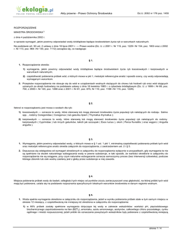 Akty prawne - Prawo Ochrony Środowiska Dz.U. 2002 nr 176 poz. 1455 ROZPORZĄDZENIE MINISTRA ŚRODOWISKA1) z dnia 4 października 2002 r. w sprawie wymagań, jakim powinny odpowiadać wody śródlądowe będące środowiskiem życia ryb w warunkach naturalnych. Na podstawie art. 50 ust. 2 ustawy z dnia 18 lipca 2001 r. — Prawo wodne (Dz. U. z 2001 r. Nr 115, poz. 1229 i Nr 154, poz. 1803 oraz z 2002 r. Nr 113, poz. 984 i Nr 130, poz. 1112) zarządza się, co następuje: § 1. 1. Rozporządzenie określa: 1) wymagania, jakim powinny odpowiadać wody śródlądowe będące środowiskiem życia ryb łososiowatych i karpiowatych w warunkach naturalnych; 2) częstotliwość pobierania próbek wód, o których mowa w pkt 1, metodyki referencyjne analiz i sposób oceny, czy wody odpowiadają wymaganym warunkom. 2. Przepisów rozporządzenia nie stosuje się do wód w urządzeniach wodnych służących do chowu lub hodowli ryb oraz wód stojących uznanych za obręb hodowlany na podstawie ustawy z dnia 18 kwietnia 1985 r. o rybactwie śródlądowym (Dz. U. z 1999 r. Nr 66, poz. 750, z 2000 r. Nr 120, poz. 1268 oraz z 2001 r. Nr 81, poz. 875, Nr 110, poz. 1189 i Nr 115, poz. 1229). § 2. Ilekroć w rozporządzeniu jest mowa o wodach dla ryb: 1) łososiowatych — oznacza to wody, które stanowią lub mogą stanowić środowisko życia populacji ryb należących do rodzaju Salmo spp. , rodziny Coregonidae ( Coregonus ) lub gatunku lipień ( Thymallus thymallus ); 2) karpiowatych — oznacza to wody, które stanowią lub mogą stanowić środowisko życia populacji ryb należących do rodziny karpiowatych ( Cyprinidae ) lub innych gatunków, takich jak szczupak ( Esox lucius ), okoń ( Perca fluviatilis ) oraz węgorz ( Anguilla anguilla ). § 3. 1. Wymagania, jakim powinny odpowiadać wody, o których mowa w § 1 ust. 1 pkt 1, minimalną częstotliwość pobierania próbek tych wód oraz metodyki referencyjne analiz określa załącznik do rozporządzenia, z zastrzeżeniem ust. 2 i § 5. 2. Dopuszcza się odstępstwa od wymagań określonych w załączniku do rozporządzenia wyłącznie w przypadkach, gdy wymagania te nie są spełniane na skutek naturalnego wzbogacania wody w pewne substancje, w taki sposób, że wartości określone w załączniku do rozporządzenia nie są osiągane, przy czym naturalne wzbogacanie oznacza samoczynny proces (bez interwencji człowieka), podczas którego zbiornik lub ciek wodny zasilany jest z gleby przez substancje w niej zawarte. § 4. Miejsca pobierania próbek wody do badań, odległości tych miejsc od punktów zrzutu zanieczyszczeń oraz głębokość, na której próbki tych wód mają być pobierane, ustala się na podstawie rozpoznania specyficznych lokalnych warunków środowiska w danym regionie wodnym. § 5. 1. Woda spełnia wymagania określone w załączniku do rozporządzenia, jeżeli w wyniku pobierania próbek stale w tym samym miejscu w okresie 12 miesięcy, z częstotliwością nie mniejszą niż określona w załączniku do rozporządzenia: 1) w 95% próbek zostały spełnione wymagania dotyczące tej wody w zakresie wskaźników: wartości pH, pięciodobowego biochemicznego zapotrzebowania na tlen (BZT5), amoniaku, azotu amonowego, azotynów, całkowitego chloru pozostałego, cynku ogólnego i miedzi rozpuszczonej; jeżeli próbki do oznaczania powyższych wskaźników były pobierane z częstotliwością mniejszą strona 1 / 4 Akty prawne - Prawo Ochrony Środowiska Dz.U. 2002 nr 176 poz. 1455 niż 1 próbka na miesiąc, wymagania dotyczące tych wskaźników muszą być spełnione w każdej próbce; 2) wymagania w zakresie temperatury były spełniane w okresach stanowiących łącznie co najmniej 98% czasu; 3) w 50% próbek zostały spełnione wymagania w zakresie rozpuszczonego tlenu; 4) zostało spełnione wymaganie dotyczące średniorocznej wartości zawiesiny ogólnej. 2. Dokonując obliczeń, o których mowa w ust. 1 pkt 1-3, nie uwzględnia się wyników analiz niespełniających wymagań określonych w załączniku do rozporządzenia, jeżeli naruszenie wymagań nastąpiło na skutek powodzi lub innych klęsk żywiołowych. 3. Dokonując obliczenia średniorocznej wartości zawiesiny ogólnej, dopuszcza się pominięcie wyników analiz z próbek pobranych podczas wyjątkowych warunków pogodowych, takich jak intensywne opady atmosferyczne, intensywne topnienie śniegu oraz susza. § 6. 1. W przypadku gdy badanie wykaże, że wartości wskaźników jakości wody są lepsze niż wartości tych wskaźników określone w załączniku do rozporządzenia, częstotliwość pobierania próbek wody i pomiaru wartości tych wskaźników może zostać zmniejszona. 2. Regularnych badań wody nie przeprowadza się, jeżeli woda jest niezanieczyszczona i nie ma ryzyka pogorszenia jej jakości. 3. W przypadku gdy badanie wody wykaże, że wartości wskaźników jakości wody są gorsze niż wartości tych wskaźników określone w załączniku do rozporządzenia, należy ustalić, czy jest to wynikiem błędów w pomiarach, skutkiem zjawiska naturalnego czy też zanieczyszczenia wody. § 7. Rozporządzenie wchodzi w życie po upływie 14 dni od dnia ogłoszenia. Minister Środowiska: S. Żelichowski Przypisy 1) Minister Środowiska kieruje działem administracji rządowej — środowisko, na podstawie § 1 ust. 2 pkt 2 rozporządzenia Prezesa Rady Ministrów z dnia 20 czerwca 2002 r. w sprawie szczegółowego zakresu działania Ministra Środowiska (Dz. U. z 2002 r. Nr 85, poz. 766). Załącznik do rozporządzenia Ministra Środowiska z dnia 4 października 2002 r. (poz. 1455) Wymagania, jakim powinny odpowiadać wody śródlądowe będące środowiskiem życia ryb łososiowatych i karpiowatych w warunkach naturalnych, minimalna częstotliwość pobierania próbek tych wód oraz metodyki referencyjne analiz Lp. Wskaźniki jakości wody 1 2 1 Temperatura Wymagania dotyczące wód śródlądowych będących środowiskiem życia ryb Łososiowatyc
