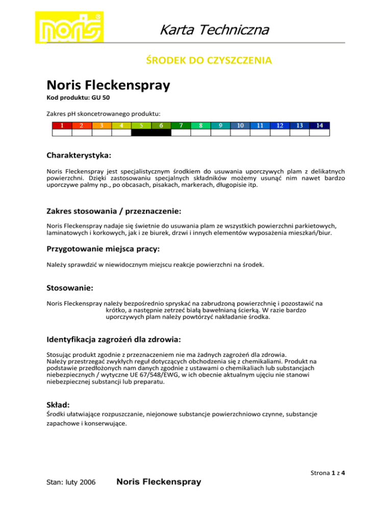 Karta Techniczna ŚRODEK DO CZYSZCZENIA Noris Fleckenspray Kod produktu: GU 50 Zakres pH skoncetrowanego produktu: Charakterystyka: Noris Fleckenspray jest specjalistycznym środkiem do usuwania uporczywych plam z delikatnych powierzchni. Dzięki zastosowaniu specjalnych składników możemy usunąd nim nawet bardzo uporczywe palmy np., po obcasach, pisakach, markerach, długopisie itp. Zakres stosowania / przeznaczenie: Noris Fleckenspray nadaje się świetnie do usuwania plam ze wszystkich powierzchni parkietowych, laminatowych i korkowych, jak i ze biurek, drzwi i innych elementów wyposażenia mieszkao/biur. Przygotowanie miejsca pracy: Należy sprawdzid w niewidocznym miejscu reakcje powierzchni na środek. Stosowanie: Noris Fleckenspray należy bezpośrednio spryskad na zabrudzoną powierzchnię i pozostawid na krótko, a następnie zetrzed białą bawełnianą ścierką. W razie bardzo uporczywych plam należy powtórzyd nakładanie środka. Identyfikacja zagrożeń dla zdrowia: Stosując produkt zgodnie z przeznaczeniem nie ma żadnych zagrożeo dla zdrowia. Należy przestrzegad zwykłych reguł dotyczących obchodzenia się z chemikaliami. Produkt na podstawie przedłożonych nam danych zgodnie z ustawami o chemikaliach lub substancjach niebezpiecznych / wytyczne UE 67/548/EWG, w ich obecnie aktualnym ujęciu nie stanowi niebezpiecznej substancji lub preparatu. Skład: Środki ułatwiające rozpuszczanie, niejonowe substancje powierzchniowo czynne, substancje zapachowe i konserwujące. Strona 1 z 4 Stan: luty 2006 Noris Fleckenspray Karta Techniczna Środki zapobiegawcze: Unikad kontaktu z oczami, skórą i ubraniem! Po zakooczeniu pracy i przed pójściem na przerwę należy dokładnie umyd ręce! Po zakooczeniu pracy należy stosowad środki pielęgnacji skóry (kremy natłuszczające). Zabrudzone ubrania przebrad i wyczyścid! Techniczne i organizacyjne środki ochronne: Nie wolno mieszad z innymi produktami i chemikaliami. W miejscu pracy powinno się zapewnid możliwośd umycia się. Mied w pobliżu butelkę z wodą lub środek do płukania oczu w razie dostania się produkt do oczu. Środki ochrony osobistej: Ochrona oczu: unikad kontaktu z oczami Ochrona rąk: przy dłuższym stałym kontakcie ze skórą rąk, zaleca się używanie rękawic gumowych Ochrona skóry: wszystkie niezakryte części ciała należy chronid stosując tłusty krem do ciała! Pierwsza pomoc: Po dostaniu się do oczu: przez 10 minut spłukiwad pod bieżącą wodą przy otwartych powiekach lub zakropid środek do płukania oczu. W razie utrzymujących się dolegliwości skontaktowad się z okulistą. Po kontakcie ze skórą: zdjąd zabrudzone ubranie. Wyczyścid dużą ilością wody i mydła. W razie połknięcia: wyplukad usta wodą i pic duża ilośd wody. Nie wywoływad wymiotów (niebezpieczeostwo aspiracji). W razie utrzymujących się dolegliwości skontaktowad się z lekarzem. Dane techniczne: Wygląd: Zapach: Gęstośd: Wartośd pH: Rozpuszczalnośd w wodzie: ciecz, klarowna świeży – cytrusowy ~1,0 ~6 dowolnie rozpuszczalne Transport substancji niebezpiecznych: Produkt nie stanowi substancji niebezpiecznej w rozumieniu Rozporządzenia o substancjach niebezpiecznych i nie podlega ADR/RID. Strona 2 z 4 Stan: luty 2006 Noris Fleckenspray Karta Techniczna Usuwanie odpadów: Zawarte w produkcie substancje powierzchniowo czynne są zgodnie z VwVwS (przepisy dotyczące substancji stanowiących zagrożenie dla wody) z dnia 17.05.99 biodegradowalne. Klasa zagrożenia dla wody: 1 Nie dopuścić by nierozcieńczony środek dostał się do kanalizacji! Nie mieszać odpadów! By była możliwa zgodna z przepisami ich utylizacja bądź pozyskanie, należy składować je oddzielnie w wytrzymałych, zamykanych i oznakowanych pojemnikach. Pozostałości środka należy dostarczyć zgodnie z miejscowymi przepisami do miejsca utylizacji odpadów. Mogące mieć zastosowanie przepisy EAK: 07 06 99 20 01 30 Odpady z produkcji, przygotowania, obrotu i stosowania tłuszczów, natłustek, mydeł, detergentów, środków dezynfekujących i kosmetyków i in. nie wymienione detergenty za wyjątkiem wymienionych w 2010129 Składowanie: Nie przechowywać w pomieszczeniach, w których przebywamy. Po przelaniu do innych pojemników niż oryginalne należy oznakować je tak jak oryginalne. Jak wszystkie detergenty należy przechowywać je z dala od dzieci. Obsługa: nie są konieczne żadne szczególne środki. Wskazówki dotyczące ochrony przeciwpożarowej i ochrony przed eksplozją: nie są konieczne żadne szczególne środki Składowanie: Wymagania co do powierzchni magazynowych i pojemników: nie są konieczne żadne szczególne środki Wskazówki dotyczące składowania z innymi substancjami: nie są konieczne żadne szczególne środki Klasa zagrożenia VbF: nie dotyczy Trwałość: w oryginalnych nieotwieranych pojemnikach przynajmniej 24 miesiące Klasa magazynowania: 12 – nie palne ciecze Warunki składowania: nie są konieczne żadne szczególne środki Temperatura składowania: idealnie nie dopuszczać do przemarznięcia, granica temperatur wynosi: +1 do +30°C Wystąpienie szkody: W razie rozlania zebrać substancję i postępować tak jak opisano to w punkcie: Usuwanie odpadów. Odpowiednie środki gaśnicze: proszek gaśniczy, dwutlenek węgla (Co2), rozpylony strumieo wody. W razie pożaru należy pojemniki znajdujące się w pobliżu schładzad rozpylonym strumieniem wody. Zachodzi niebezpieczeostwo pękania i eksplozji przez wzrost ciśnienia pod wpływem działania wysokich temperatur. Należy unikad przedostawania się do wody, wód gruntowych i kanalizacji (niewielki stopieo zagrożenia dla wód – WGK 1). Produkt nie jest palny. Strona 3 z 4 Stan: luty 2006 Noris Fleckenspray Karta Techniczna Bierzemy oczywiście odpowiedzialnośd za nienaganną jakośd naszych towarów. Niniejsza Karta Techniczna może stanowid dla Paostwa niezobowiązujące źródło porad i informacji. Nasze zalecenia opier