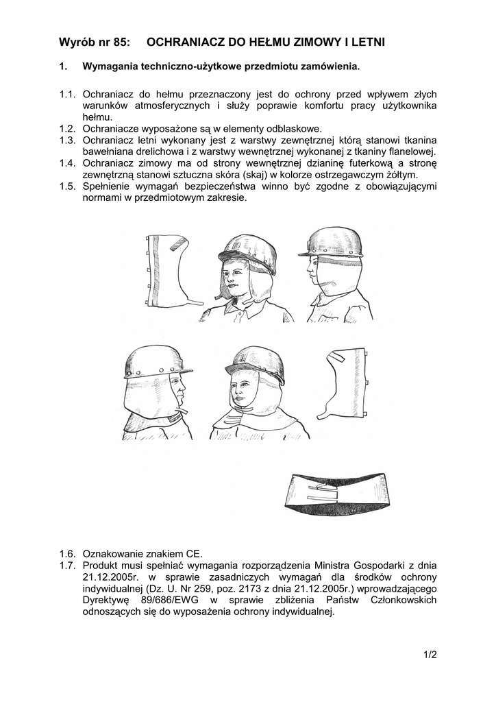 Wyrób nr 85: 1. OCHRANIACZ DO HEŁMU ZIMOWY I LETNI Wymagania techniczno-uŜytkowe przedmiotu zamówienia. 1.1. Ochraniacz do hełmu przeznaczony jest do ochrony przed wpływem złych warunków atmosferycznych i słuŜy poprawie komfortu pracy uŜytkownika hełmu. 1.2. Ochraniacze wyposaŜone są w elementy odblaskowe. 1.3. Ochraniacz letni wykonany jest z warstwy zewnętrznej którą stanowi tkanina bawełniana drelichowa i z warstwy wewnętrznej wykonanej z tkaniny flanelowej. 1.4. Ochraniacz zimowy ma od strony wewnętrznej dzianinę futerkową a stronę zewnętrzną stanowi sztuczna skóra (skaj) w kolorze ostrzegawczym Ŝółtym. 1.5. Spełnienie wymagań bezpieczeństwa winno być zgodne z obowiązującymi normami w przedmiotowym zakresie. 1.6. Oznakowanie znakiem CE. 1.7. Produkt musi spełniać wymagania rozporządzenia Ministra Gospodarki z dnia 21.12.2005r. w sprawie zasadniczych wymagań dla środków ochrony indywidualnej (Dz. U. Nr 259, poz. 2173 z dnia 21.12.2005r.) wprowadzającego Dyrektywę 89/686/EWG w sprawie zbliŜenia Państw Członkowskich odnoszących się do wyposaŜenia ochrony indywidualnej. 1/2 1.8. Dostarczane wyroby muszą być oznakowane zgodnie z obowiązującymi przepisami i normami na kaŜdym egzemplarzu w sposób widoczny, czytelny i odporny na zatarcie przez cały okres jego uŜytkowania. 1.9. Miejsce realizacji zamówienia: magazyny Zamawiającego wskazane w zamówieniach. 2. Wykaz dokumentów wymaganych przy składaniu oferty. 2.1. Deklaracja zgodności WE, w której, oprócz powołania się na obowiązujące przepisy i normy, ma być przywołany zapis z § 670 pkt. 2 rozporządzenia Ministra Gospodarki z dnia 28.06.2002r. w sprawie bezpieczeństwa i higieny pracy, prowadzenia ruchu oraz specjalistycznego zabezpieczenia przeciwpoŜarowego w podziemnych zakładach wraz z późniejszymi zmianami (deklaracja zgodności WE wystawiona przez Producenta lub upowaŜnionego przedstawiciela według obowiązujących przepisów prawa). 2.2. Deklaracja Wykonawcy/Oferenta, Ŝe wyrób spełnia przedstawione przez Zamawiającego wymagania oraz jest zgodny z opisem wyrobu zawartym w „Katalogu opisowo-rysunkowym obuwia, odzieŜy, sprzętu i środków ochrony indywidualnej”. 2.3. Dokument potwierdzający właściwości antyelektrostatyczne gotowego wyrobu oraz jego przydatność do stosowania w górnictwie w polach niemetanowych i metanowych w wyrobiskach zaliczonych do stopni „a”, „b”, „c” niebezpieczeństwa wybuchu wydany przez jednostkę notyfikowaną lub akredytowaną jednostkę certyfikującą lub akredytowane laboratorium badawcze. 2.4. Dokument potwierdzający, Ŝe wyrób nie jest szkodliwy dla zdrowia, wydany przez Producenta. 2.5. Instrukcja uŜytkowania wyrobu zgodna z wymaganiami rozporządzenia Ministra Gospodarki z dnia 21.12.2005r. w sprawie zasadniczych wymagań dla środków ochrony indywidualnej (Dz. U. Nr 259, poz. 2173 z dnia 21.12.2005r.). 3. Wykaz dokumentów wymaganych przy pierwszej i kolejnych dostawach. 3.1. Wraz z pierwszą dostawą wyrobu na kopalnie producent lub upowaŜniony dostawca winien dołączyć: instrukcję uŜytkowania, przechowywania i konserwacji odzieŜy, dokument wydany przez jednostkę notyfikowaną lub akredytowaną jednostkę certyfikującą lub akredytowane laboratorium badawcze potwierdzający, Ŝe oferowany wyrób jest antyelektrostatyczny i Ŝe moŜe być bezpiecznie stosowany w przestrzeniach zagroŜonych wybuchem, dokument potwierdzający, Ŝe wyrób nie jest szkodliwy dla zdrowia, wydany przez Producenta, a przy kaŜdej dostawie deklarację zgodności WE i świadectwo jakości. 2/2