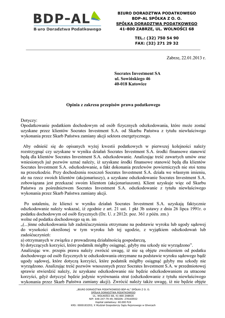 BIURO DORADZTWA PODATKOWEGO BDP-AL SPÓŁKA Z O. O. SPÓŁKA DORADZTWA PODATKOWEGO 41-800 ZABRZE, UL. WOLNOŚCI 68 TEL.: (32) 750 54 90 FAX: (32) 271 29 32 Zabrze, 22.01.2013 r. Socrates Investment SA ul. Sowińskiego 46 40-018 Katowice Opinia z zakresu przepisów prawa podatkowego Dotyczy: Opodatkowanie podatkiem dochodowym od osób fizycznych odszkodowania, które może zostać uzyskane przez klientów Socrates Investment S.A. od Skarbu Państwa z tytułu niewłaściwego wykonania przez Skarb Państwa zamiany akcji sektora energetycznego. Aby odnieść się do opisanych wyżej kwestii podatkowych w pierwszej kolejności należy rozstrzygnąć czy uzyskane w wyniku działań Socrates Investment S.A. środki finansowe stanowić będą dla klientów Socrates Investment S.A. odszkodowanie. Analizując treść zawartych umów oraz wniesionych już pozwów uznać należy, iż uzyskane środki finansowe stanowić będą dla klientów Socrates Investment S.A. odszkodowanie, a fakt dokonania przelewów powierniczych nie stoi temu na przeszkodzie. Przy dochodzeniu roszczeń Socrates Investment S.A. działa we własnym imieniu, ale na rzecz swoich klientów (akcjonariuszy), a uzyskane odszkodowanie Socrates Investment S.A. zobowiązana jest przekazać swoim klientom (akcjonariuszom). Klient uzyskuje więc od Skarbu Państwa za pośrednictwem Socrates Investment S.A. odszkodowanie z tytułu niewłaściwego wykonania przez Skarb Państwa zamiany akcji. Po ustaleniu, że klienci w wyniku działań Socrates Investment S.A. uzyskają faktycznie odszkodowanie należy wskazać, iż zgodnie z art. 21 ust. 1 pkt 3b ustawy z dnia 26 lipca 1991r. o podatku dochodowym od osób fizycznych (Dz. U. z 2012r. poz. 361 z późn. zm.) wolne od podatku dochodowego są m. im „(...)inne odszkodowania lub zadośćuczynienia otrzymane na podstawie wyroku lub ugody sądowej do wysokości określonej w tym wyroku lub tej ugodzie, z wyjątkiem odszkodowań lub zadośćuczynień: a) otrzymanych w związku z prowadzoną działalnością gospodarczą, b) dotyczących korzyści, które podatnik mógłby osiągnąć, gdyby mu szkody nie wyrządzono”. Analizując ww. przepis prawa należy zwrócić uwagę, iż nie są objęte zwolnieniem od podatku dochodowego od osób fizycznych te odszkodowania otrzymane na podstawie wyroku sądowego bądź ugody sądowej, które dotyczą korzyści, które podatnik mógłby osiągnąć gdyby mu szkody nie wyrządzono. Analizując treść pozwów wnoszonych przez Socrates Investment S.A. w przedmiotowej sprawie stwierdzić należy, że uzyskane odszkodowanie nie będzie odszkodowaniem za utracone korzyści, gdyż dotyczyć będzie jedynie wyrównania strat (odszkodowanie z tytułu niewłaściwego wykonania przez Skarb Państwa zamiany akcji). Zwrócić należy także uwagę, iż nie będzie objęte „BIURO DORADZTWA PODATKOWEGO BDP-AL” SPÓŁKA Z O. O. SPÓŁKA DORADZTWA PODATKOWEGO UL. WOLNOŚCI 68, 41-800 ZABRZE NIP: 648-247-79-49; REGON: 278165932 Kapitał zakładowy: 60.000 PLN KRS: 0000183293; X Wydział Gospodarczy Sądu Rejonowego w Gliwicach zwolnieniem z opodatkowania podatkiem dochodowym od osób fizycznych odszkodowanie otrzymane w związku z prowadzoną działalnością gospodarczą. Tak więc analiza treści pozwów daje podstawy do stwierdzenia, iż odszkodowania uzyskane przez klientów Socrates Investment S.A. z tytułu niewłaściwego wykonania przez Skarb Państwa zamiany akcji korzystać będą ze zwolnienia z opodatkowania podatkiem dochodowym od osób fizycznych (zastrzeżenie poniżej), pod warunkiem, iż pozostaną bez związku z działalnością gospodarczą klienta (akcjonariusza). Jednocześnie zastrzegam, że ostatecznej kwalifikacji czy odszkodowanie korzystać będzie ze zwolnienia z opodatkowania podatkiem dochodowym od osób fizycznych będzie można dokonać na podstawie analizy treści prawomocnego wyroku sądowego. Sporządził: Doradca podatkowy Adam Kłosek Nr wpisu 11143 „BIURO DORADZTWA PODATKOWEGO BDP-AL” SPÓŁKA Z O. O. SPÓŁKA DORADZTWA PODATKOWEGO UL. WOLNOŚCI 68, 41-800 ZABRZE NIP: 648-247-79-49; REGON: 278165932 Kapitał zakładowy: 60.000 PLN KRS: 0000183293; X Wydział Gospodarczy Sądu Rejonowego w Gliwicach