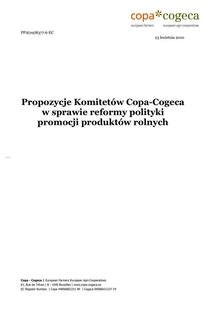 PPA(09)8377:6-EC 23 kwietnia 2010 Propozycje Komitetów Copa-Cogeca w sprawie reformy polityki promocji produktów rolnych Copa - Cogeca | European Farmers European Agri-Cooperatives 61, Rue de Trèves | B - 1040 Bruxelles | www.copa-cogeca.eu EC Register Number | Copa 44856881231-49 | Cogeca 09586631237-74 Propozycje Komitetów Copa-Cogeca w sprawie reformy polityki promocji produktów rolnych Wstęp 1. Kontekst międ zynarod owy ukształtowany poprzez otwarcie granic powod uje, że europejscy rolnicy muszą coraz częściej stawiać czoła konkurencji importowanych prod uktów, ale to d aje im również możliwości eksportu. Polityka promocji prod uktów rolnych pozwala na zachowanie części rynku dla europejskich produktów i na zdobywanie nowych terenów. 2. Europejscy konsumenci coraz częściej d omagają się zd rowej, zróżnicowanej żywności, respektującej środ owisko i chroniącej obszary wiejskie. Polityka promocji prod uktów rolnych informuje konsumentów o tym, że europejskie prod ukty rolne od powiad ają tym wymaganiom1. Ponadto, środki promocyjne są zgodne z regułami WTO. Uwagi wstępne 3. Konieczne jest znaczne zwiększenie bud żetu przeznaczanego na promocję europejskich prod uktów rolnych. Jak zostało to pod kreślone w raporcie 10/20092 Trybunału Obrachunkowego, biorąc pod uwagę fakt, że budżet jest ograniczony, prowadzone działania nie mogą same mieć znacznego wpływu na ustalone cele. Jed nakże, zwiększenie bud żetu uzasadnione jest poprzez znaczenie tego instrumentu w przyszłej WPR. 4. Znaczna część europejskiej prod ukcji wprowad zana jest d o hand lu na wspólnym rynku. Jed nakże, na tym rynku, ud ział importowanych prod uktów wzrasta. Wspólny rynek musi pozostać priorytetem europejskiego systemu promocji. Zważywszy znaczenie programów promocyjnych, konieczne jest, aby były one obecne na wspólnym rynku i nad al były współfinansowane przez Unię Europejską. Konkretna część bud żetu nad al musi być przeznaczona na ich finansowanie. W zasad zie, jeśli ten typ promocji byłby pod d any renacjonalizacji, prowad ziłoby to d o d użych różnic pomięd zy państwami członkowskimi, w zależności od ich priorytetów oraz od ich zasobów budżetowych. W 2008 roku, ponad 85% prod ukcji rolnej i rolno-spożywczej Unii Europejskiej zostało wprowad zone d o obrotu na rynku wewnętrznym. Jed nakże, import znacznie wzrósł. W rzeczywistości, wzrósł on z 30,39 miliardów euro od 1999 roku i wyniósł 80,07 miliardów euro w 2008 roku. (Źródło: Eurostat) 5. Konieczna jest ogólna promocja w celu informowania europejskich konsumentów i państw trzecich o « europejskiej jakości ». Ta « jakość » charakteryzuje się wysokimi normami prod ukcji, które muszą respektować europejskie prod ukty rolne –ochrona obszarów 1 Europejskie produkty rolno-spożywcze respektują całą serię norm w zakresie higieny produktów, zdrowia roś lin, dobrostanu zwierząt, kontroli pozostałoś ci pestycydów, leków i dodatków weterynaryjnych oraz w zakresie norm sanitarnych dla niektórych produktów (np. mięso i produkty mleczne). Europejscy rolnicy i ich spółdzielnie muszą respektować bardzo wysokie normy środowiskowe. Wśród tych norm, znajdujemy środki ochrony wody i gleby oraz instrumenty ochraniające bioróżnorodność. Do tego należy dodać jeszcze całą serię instrumentów rolno-środowiskowych, które muszą respektować rolnicy (numer referencyjny. 2 Raport specjalny 10/2009. Działania informacyjne oraz promocja produktów rolnych wiejskich- charakteryzuje się również bioróżnorod nością, savoir-faire oraz swoimi tradycjami. Biorąc pod uwagę ogólny charakter tej promocji, musi być ona finansowana (w 100%) przez Unię Europejską. 6. Lista prod uktów objętych europejskim systemem promocji musi ograniczać się d o produktów rolnych (Aneks I) i oprócz tego aneksu, do produktów objętych CHNP, CHOG i GTS lub objętych legislacją europejską w zakresie rolnictwa ekologicznego. W przypad ku braku współfinansowania europejskiego i krajowego, podmioty tego sektora nie miałyby do d yspozycji niezbęd nych źród eł finansowych, aby prowad zić od powied nie kampanie promocyjne. Należy przypomnieć, że system ten wpisuje się we Wspólną Politykę Rolną. Szczegółowe uwagi d otyczące niektórych sektorów zostały sformułowane w załączniku d o niniejszego dokumentu. 7. Europejscy prod ucenci i ich spółd zielnie wypracowali wiele marek, które pozwalają im na zwiększenie wartości ich prod ukcji. Legislacja w zakresie promocji powinna umożliwić im komunikację na temat tych marek. 8. Komitet Copa-Cogeca uważają, że bard zo ważne jest, aby pochod zenie prod uktów nie objętych CHNP, CHOG, GTS było przed miotem promocji. Nie można od zwiercied lić różnorod ności europejskiej, nie pokazując savoir faire europejskich prod ucentów i spółdzielni. 9. Przed przed stawieniem propozycji programu, konieczne jest poznanie rynku, na którym programy te będą prowadzone. Jednakże, badania rynku prowadzone w krajach trzecich są bard zo kosztowne i powinny być współfinansowane (Obecnie, jed ynie bad ania nowych rynków są objęte współfinansowaniem). Tak naprawd ę, rynki te cały czas się rozwijają i badanie może okazać się po kilku latach przestarzałe. Lepsza synergia 10. Większa przejrzystość pozwoliłaby na lepszą koordynację między państwami członkowskimi, międ zy państwami członkowskimi a Komisją Europejską oraz na większy wpływ europejskich i krajowych programów promocyjnych. W celu stworzenia tej przejrzystości, państwa członkowskie muszą poinformować Komisję o swoich krajowych programach promocji. Konieczne jest również, aby Komisja poinformowała organizacje proponujące programy promocji, przyjęte i od rzucone o powod ach od rzucenia d anego programu. Informacje te są bard zo cenne d la organizacji proponujących programy, aby nie