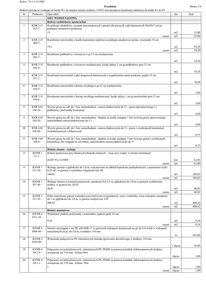 Rodos 7.0.5.4 [11490] Przedmiar Budowa przyłącza wodnego od studni W1 do miejsca zmiany średnicy 110/63 oraz przyłącza kanalizacji sanitarnej od studni S1 do S5 Nr Podstawa Opis robót SIEĆ WODOCIĄGOWA Roboty rozbiórkowe nawierzchni 1 KNR 2-31 Rozebranie chodników, wysepek przystankowych i przejść dla pieszych z płyt betonowych 50x50x7 cm na 815-7 podsypce cementowo-piaskowej 15 razem 2 KNR 2-31 Rozebranie nawierzchni z kostki kamiennej rzędowej na podsypce piaskowej ręcznie, wys.kostki 18 cm 806-3 19,2 razem 3 KNR 2-31 Rozebranie podbudowy z kruszywa o gr.15 cm mechanicznie 802-7 4 KNR 2-31 802-8 - Rozebranie podbudowy z kruszywa mechanicznie, każdy dalszy 1 cm gr.podbudowy pow.15 cm 5 KNR 2-31 811-2 - Rozebranie nawierzchni z płyt drogowych betonowych z wypełnieniem spoin piaskiem, gr.płyt 15 cm 6 KNR 2-31 810-5 - Rozebranie nawierzchni z betonu zwykłego o gr.12 cm mechanicznie 7 KNR 2-31 810-6 - Rozebranie nawierzchni z betonu zwykłego mechanicznie, każdy dalszy 1 cm gr.nawierzchni pow.12 cm 8 KNR 4-01 108-10 - Wywóz gruzu na odl. do 1 km, samochodami - samowyładowczymi do 5 t - gruzu spryzmowanego ( z podbudowy pod kostkę kamienną) 9 KNR 4-01 108-20 - Wywóz gruzu na odl. do 1 km, samochodami - dopłata za każdy następny 1 km wywozu gruzu spryzowanego samochodami samowyładowczymi do 5 t 10 KNR 4-01 108-90 - Wywóz gruzu na odl. do 1 km, samochodami - samowyładowczymi do 5 t - gruzu z rozebranych konstrukcji żwirobetonowych i żelbetowych 11 KNR 4-01 108-0 - Wywóz gruzu na odl. do 1 km, samochodami - dopłata za każdy następny 1 km wywozu gruzu z rozebranych konstrukcji, bez względu na ich rodzaj, samochodami samowyładowczymi do 5 t 12 KNNR 1 111-1 - 14 15 16 KNNR 1 212-20 - KNNR 1 307-40 - KNNR 1 313-10 - KNNR 4 1411-10 - Jm Ilość m2 m2 15,00 15,00 m2 m2 19,20 19,20 m2 19,20 m2 19,20 m2 78,84 m2 5,00 m2 5,00 m3 4,80 m3 4,80 m3 0,75 m3 0,75 km km 0,102 0,100 m3 m3 160,03 160,03 m3 m3 40,01 40,01 m2 m2 408,42 408,42 m3 m3 9,36 9,36 m 102,00 1 złącze 10,00 złącze 1,00 złącze złącze 1,00 1,00 Roboty ziemne - wykopy Roboty pomiarowe przy liniowych robotach ziemnych - trasa sieci wodoc. w terenie równinnym (8,88+93,11)/1000 13 Strona 1/4 razem Wykopy jamiste o głębokości do 3,0 m, wykonywane na odkład koparkami podsiębiernymi, o pojemności łyżki 0,25 m3, w gruncie o normalnej wilgotności kat. III 160,03 razem Wykopy liniowe o ścianach pionowych, szerokości 0,8-2,5 m, głębokości do 3,0 m z ręcznym wydobyciem urobku, w gruncie kat. III-IV 40,01 razem Pełne umocnienie palami szalunkowymi stalowymi (wypraskami), wraz z rozbiórką, ścian wykopów szerokości do 1 m, głębokości do 3,0 m, w gruncie suchym kat. I-IV 408,42 razem Roboty montażowe Wykonanie podłoży pod kanały z materiałów sypkich grub. 10 cm 9,36 razem Montaż rurociągów z rur PE 100 SDR 17 w gotowych wykopach skarpowych na gł. do 4,0 m lub w wykopach umocnionych na gł. do 3,0 m, o średnicy 110 mm 17 KNNR 4 1009-40 - 18 KNNR 4 1010-40 - Wykonanie połączeń rur PE ciśnieniowych metodą zgrzewania doczołowego, o średnicy 110 mm 19 KNNR 4 1011-4 - Połączenia rur polietylenowych, ciśnieniowych PE, PEHD za pomocą kształtek elektrooporowych średnica zewnętrzna rur 110 mm - kolano 90st 20 KNNR 4 1011-1 - Połączenia rur polietylenowych, ciśnieniowych PE, PEHD za pomocą kształtek elektrooporowych średnica zewnętrzna rur 110 mm - kolano 90st 1 razem Rodos 7.0.5.4 [11490] Przedmiar Budowa przyłącza wodnego od studni W1 do miejsca zmiany średnicy 110/63 oraz przyłącza kanalizacji sanitarnej od studni S1 do S5 Nr Podstawa Opis robót 21 KNNR 4 Połączenia rur polietylenowych, ciśnieniowych PE, PEHD za pomocą kształtek elektrooporowych średnica 1011-1 zewnętrzna rur 63 mm - mufy 1 razem 22 KNNR 4 Wykonanie podstawy betonowej pod studnię wodomierzową 1413-80 23 kalk.ind. - 24 KNNR 1 527-10 - Montaż konstrukcji podwieszeń kabli energetycznych i telekomunikacyjnych typu lekkiego o rozpiętości 4,00 m kolizje z sieciami energet. 25 KNNR 1 529-10 - Montaż konstrukcji podwieszeń rurociągów i kanałów o rozpiętości elementu 4,00 m - kolizje z rurociągami sieci wod-kan i c.o 4 razem Demontaż konstrukcji podwieszeń kabli energetycznych i telekomunikacyjnych typu lekkiego o rozpiętości elementu 4,00 m 26 KNNR 1 527-60 - 27 KNNR 1 529-60 - 28 KNNR 4 1606-10 - Próba wodna szczelności sieci wodociągowych z rur typu HOBAS, PVC, PE o średnicy do 110 mm 29 KNNR 4 1611-10 - Dezynfekcja rurociągów sieci wodociągowej o średnicy do 150 mm 30 KNNR 4 1612-10 - Jednokrotne płukanie sieci wodociągowej o średnicy do 150 mm 31 KNR 2-19 WACETOB 102-1 - razem 35 36 37 38 1,00 1,00 m3 1,25 studnia 1,00 kpl 6,00 kpl kpl 4,00 4,00 kpl 6,00 kpl kpl 4,00 4,00 próba 1,00 100 m 1,00 100 m 1,00 m m 117,00 117,00 m3 m3 28,08 28,08 kpl 3,00 kpl 1,00 m3 m3 162,60 162,60 m3 m3 37,44 37,44 m3 m3 37,44 37,44 m2 m2 15,00 15,00 m2 19,20 m2 19,20 Wykonanie obsypki technologicznej 20 cm ponad wierzch rur 28,08 34 złącze złącze Oznakowanie trasy wodociągu ułożonego w ziemi taśmą z tworzywa sztucznego 117 33 Ilość Demontaż konstrukcji podwieszeń rurociągów i kanałów o rozpiętości elementu 4,00 m razem KNNR 4 1411-40 - Jm Studnia wodomierzowa z kręgów betonowych o średnicy 2000 mm i głębokości 1,5 m w gotowym wykopie 4 32 Strona 2/4 razem KNR-W 2-18 Zasuwy typu E kołnierzowe z obudową o średnicy 65mm, montowane na rurociągach PVC i PE (Zasuwy typu E 0212/01.1 montowane z nasuwkami) KNR-W 2-18 Analogia- Montaz zaworu antyskażeniowego typu Ea453 + zwężki redukcyjnej 2szt. + kształtki 0212/01.1 montaż-demontaż +króćca dwukołnierzowego KNNR 1 214-50 - KNNR 1 205-20 - KNNR 1 208-20 - KNR 2-31 502-4 - Zasypanie wykopów Zasypanie wykopów fundamentowych podłużnych, punktowych, obiektowych, rowów spycharkami gąsienicowymi 55 kW (75 KM), z zagęszczeniem ziemi ubijakami stopowymi, grunt kat. III-IV 162,60 razem Roboty ziemne w