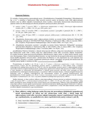 Oświadczenie firmy paostwowe _________________, dnia __________ 2011 r. Szanowni Państwo, W związku z koniecznością wprowadzenia przez „Przedsiębiorstwo Gospodarki Komunalnej i Mieszkaniowej Sp. z o.o.” z siedzibą w Sędziszowie Młp. nowych wzorców umów na dostawę wody i/lub odprowadzanie ścieków oraz na odbiór odpadów komunalnych, która wynika z obowiązku dostosowania dotychczasowych zapisów umów do obowiązujących obecnie przepisów poniższych aktów prawnych: 1) ustawy z dnia 7 czerwca 2001 r. o zbiorowym zaopatrzeniu w wodę i zbiorowym odprowadzaniu ścieków (Dz. U. z 2006 r. Nr 123, poz. 858 z późn. zm.), 2) ustawy z dnia 13 września 1996 r. o utrzymaniu czystości i porządku w gminach (Dz. U. z 2005 r., Nr 236, poz. 2008 z późn. zm.), 3) ustawy z dnia 29 lipca 2005 r. o zużytym sprzęcie elektrycznym i elektronicznym (Dz. U. Nr 180, poz. 1495), 4) „Regulaminu dostarczania wody i odprowadzania ścieków na terenie Gminy Sędziszów Małopolski” przyjętego uchwałą nr XXVIII/278/06 Rady Miejskiej w Sędziszowie Młp. z dnia 31 stycznia 2006 r. (Dz. Urzędowy Województwa Podkarpackiego z dnia 10 marca 2006 r. Nr 14 poz. 193), 5) „Regulaminu utrzymania czystości i porządku na terenie Gminy Sędziszów Małopolski” przyjętego uchwałą Rady Miejskiej w Sędziszowie Młp. nr XIV/128/08 z dnia 11 marca 2008 r. (Dz. Urzędowy Województwa Podkarpackiego z dnia 17 kwietnia 2008 r. Nr 30 poz. 753), przedkładamy Państwu formularz z danymi dotyczącymi odbiorcy usług oraz nieruchomości do której ma być dostarczana woda i/lub z której mają być odprowadzane ścieki albo wywożone odpady komunalne. W wyniku licznych zmian powyższych przepisów dotychczasowe zapisy umów w dużej mierze utraciły swoją moc obowiązującą. Dane, o których podanie prosimy, są więc konieczne do przygotowania przez pracowników naszej Spółki projektów nowych umów i dostarczenia ich Państwu w celu zapoznania się z ich zapisami oraz ich podpisania. Prosimy o czytelne wypełnienie poniższych rubryk i przesłanie ich pocztą lub dostarczenie do siedziby naszej Spółki w terminie do dnia ………………………………..2011r. Przypominamy, że zgodnie z art. 28 ust. 1, ust. 4 i 5 ustawy o zbiorowym zaopatrzeniu w wodę i zbiorowym odprowadzaniu ścieków, kto bez uprzedniego zawarcia umowy o zaopatrzenie w wodę pobiera wodę z urządzeń wodociągowych, podlega karze grzywny do 5.000 zł, a kto bez uprzedniego zawarcia umowy o odprowadzanie ścieków wprowadza ścieki do urządzeń kanalizacyjnych, podlega karze ograniczenia wolności albo grzywny do 10.000 zł. Ponadto, w razie skazania za wykroczenie lub przestępstwo, o których mowa powyżej, sąd może orzec nawiązkę na rzecz przedsiębiorstwa wodociągowo-kanalizacyjnego, w wysokości 1.000 zł za każdy miesiąc, w którym nastąpiło bezumowne pobieranie wody z urządzeń wodociągowych lub wprowadzanie ścieków do urządzeń kanalizacyjnych tego przedsiębiorstwa. Z kolei, zgodnie z art. 10 ust. 2 ustawy o utrzymaniu czystości i porządku w gminach, kto nie wykonuje obowiązków wymienionych w art. 5 ust. 1 tej ustawy dodatkowo podlega karze grzywny do 5.000 zł. Spółka informuje, że dane osobowe odbiorcy usług będą podlegać ochronie prawnej na podstawie przepisów ustawy z dnia 29 sierpnia 2007 r. o ochronie danych osobowych (Dz. U. z 2002 r. Nr 101, poz. 962 z późn. zm.). Odbiorcy usług będzie przysługiwać prawo dostępu do treści swoich danych oraz ich poprawiania. Odbiorca usług udostępniając Spółce swoje dane osobowe wyraża zgodę na przetwarzanie i przechowywanie przez Spółkę jego danych osobowych w zakresie, w jakim będzie to niezbędne do zawarcia i wykonywania umów o zaopatrzenie w wodę i/lub odprowadzanie ścieków albo na odbiór odpadów komunalnych z jego nieruchomości. ----------------------------------------------------------------------------------------------------------------A. Dane odbiorcy usług będącego osobą fizyczną nie prowadzącą działalności gospodarczej (jeżeli nieruchomość do której ma być dostarczana woda i/lub z której mają być odprowadzane ścieki albo wywożone odpady komunalne stanowi współwłasność innej osoby np. współmałżonka, czy spadkobierców, dane współwłaściciela należy wskazać w pkt B). 1) Imię i nazwisko odbiorcy usług: _______________________________________, 2) Zamieszkały w miejscowości: ___________________________________, ulica ______________________________, nr domu _________nr lokalu___________, kod pocztowy: _______________ (proszę podać dokładny adres zamieszkania odbiorcy usług), 3) Dowód osobisty seria_______ nr____________________ wydany przez organ: _____________________________________________________________, 4) Oznaczenie nieruchomości do której ma być dostarczana woda i/lub z której mają być odprowadzane ścieki albo wywożone odpady komunalne: położona w miejscowości: ___________________________________________________________, przy ulicy ______________________________, nr domu _________nr lokalu___________, numer księgi wieczystej KW nr ___________________ prowadzonej w Sądzie Rejonowym w Ropczycach. ---------------------------------------------------------------------------------------------------------------B. Dane współwłaściciela (wypełnia się tylko w przypadku, gdy nieruchomość do której ma być dostarczana woda i/lub z której mają być odprowadzane ścieki albo wywożone odpady komunalne stanowi współwłasność innej osoby np. współmałżonka, wspólnika, spadkobierców): 1) Imię i nazwisko współwłaściciela: ______________________________________, 2) Zamieszkały w miejscowości: ___________________________________, ulica ______________________________, nr domu _________nr lokalu___________, kod pocztowy: _______________ (proszę podać dokładny adres zamieszkania współwłaściciela), 3) Dowód osobisty seria_______ n