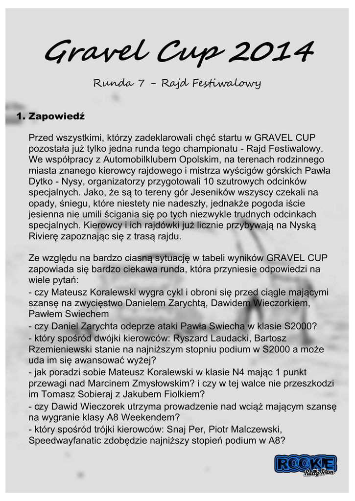 Gravel Cup 2014 Runda 7 - Rajd Festiwalowy 1. Zapowiedź Przed wszystkimi, którzy zadeklarowali chęć startu w GRAVEL CUP pozostała już tylko jedna runda tego championatu - Rajd Festiwalowy. We współpracy z Automobilklubem Opolskim, na terenach rodzinnego miasta znanego kierowcy rajdowego i mistrza wyścigów górskich Pawła Dytko - Nysy, organizatorzy przygotowali 10 szutrowych odcinków specjalnych. Jako, że są to tereny gór Jeseników wszyscy czekali na opady, śniegu, które niestety nie nadeszły, jednakże pogoda iście jesienna nie umili ścigania się po tych niezwykle trudnych odcinkach specjalnych. Kierowcy i ich rajdówki już licznie przybywają na Nyską Rivierę zapoznając się z trasą rajdu. Ze względu na bardzo ciasną sytuację w tabeli wyników GRAVEL CUP zapowiada się bardzo ciekawa runda, która przyniesie odpowiedzi na wiele pytań: - czy Mateusz Koralewski wygra cykl i obroni się przed ciągle mającymi szansę na zwycięstwo Danielem Zarychtą, Dawidem Wieczorkiem, Pawłem Swiechem - czy Daniel Zarychta odeprze ataki Pawła Swiecha w klasie S2000? - który spośród dwójki kierowców: Ryszard Laudacki, Bartosz Rzemieniewski stanie na najniższym stopniu podium w S2000 a może uda im się awansować wyżej? - jak poradzi sobie Mateusz Koralewski w klasie N4 mając 1 punkt przewagi nad Marcinem Zmysłowskim? i czy w tej walce nie przeszkodzi im Tomasz Sobieraj z Jakubem Fiolkiem? - czy Dawid Wieczorek utrzyma prowadzenie nad wciąż mającym szansę na wygranie klasy A8 Weekendem? - który spośród trójki kierowców: Snaj Per, Piotr Malczewski, Speedwayfanatic zdobędzie najniższy stopień podium w A8? 2. Konfiguracja rajdu Ceremonia startu SS1 – Swiss II – mokry szuter SS2 – Northumbria - mokry szuter SS3 – Loch Ard II - mokry szuter Serwis – 60 minut – SupeRally SS4 – Sweet Lamb - wilgotny szuter SS5 – PTD Rallysprint - wilgotny szuter SS6 – Loch Ard - wilgotny szuter Serwis – 60 minut – SupeRally SS7 – Sweet Lamb II - suchy szuter SS8 – Pirka Menoko II - suchy szuter SS9 – Noiker II- suchy szuter SS10 – Hyppyjulma Gravel II suchy szuter 3. Hasło do rajdu Hasło (wielkość liter ma znaczenie!) : RRTgravelcupR7 4. Klasy samochodów dopuszczonych do startu S2000 A8 N4 H (tylko RWD) 5. Wymagania techniczne Gra Richard Burns Rally z zainstalowanymi oficjalnymi patchami 1.1 oraz 1.2 Konto na pluginie Wally’ego - RBR Czech Brakujące trasy można znaleźć tutaj. 6. Uwagi Organizatora Aby zostać sklasyfikowanym w wynikach pucharu Gravel Cup należy się zarejestrować na liście zgłoszeń. Lista pozostaje otwarta przez cały sezon, a zapisu można dokonać korzystając z tego formularza. W razie jakichkolwiek wątpliwości prosimy o kontakt. 7. Powodzenia! Gravel Cup by RRT 2014 - Runda 7 - Rajd Festiwalowy