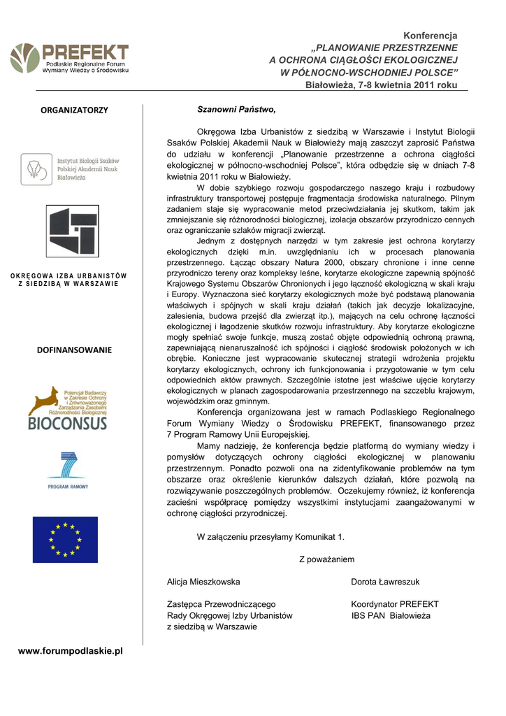 Konferencja „PLANOWANIE PRZESTRZENNE A OCHRONA CIĄGŁOŚCI EKOLOGICZNEJ W PÓŁNOCNO-WSCHODNIEJ POLSCE” Białowieża, 7-8 kwietnia 2011 roku ORGANIZATORZY Szanowni Państwo, Okręgowa Izba Urbanistów z siedzibą w Warszawie i Instytut Biologii Ssaków Polskiej Akademii Nauk w Białowieży mają zaszczyt zaprosić Państwa do udziału w konferencji „Planowanie przestrzenne a ochrona ciągłości ekologicznej w północno-wschodniej Polsce”, która odbędzie się w dniach 7-8 kwietnia 2011 roku w Białowieży. OKRĘGOWA IZBA URBANISTÓW Z SIEDZIBĄ W WARSZAWIE DOFINANSOWANIE W dobie szybkiego rozwoju gospodarczego naszego kraju i rozbudowy infrastruktury transportowej postępuje fragmentacja środowiska naturalnego. Pilnym zadaniem staje się wypracowanie metod przeciwdziałania jej skutkom, takim jak zmniejszanie się różnorodności biologicznej, izolacja obszarów przyrodniczo cennych oraz ograniczanie szlaków migracji zwierząt. Jednym z dostępnych narzędzi w tym zakresie jest ochrona korytarzy ekologicznych dzięki m.in. uwzględnianiu ich w procesach planowania przestrzennego. Łącząc obszary Natura 2000, obszary chronione i inne cenne przyrodniczo tereny oraz kompleksy leśne, korytarze ekologiczne zapewnią spójność Krajowego Systemu Obszarów Chronionych i jego łączność ekologiczną w skali kraju i Europy. Wyznaczona sieć korytarzy ekologicznych może być podstawą planowania właściwych i spójnych w skali kraju działań (takich jak decyzje lokalizacyjne, zalesienia, budowa przejść dla zwierząt itp.), mających na celu ochronę łączności ekologicznej i łagodzenie skutków rozwoju infrastruktury. Aby korytarze ekologiczne mogły spełniać swoje funkcje, muszą zostać objęte odpowiednią ochroną prawną, zapewniającą nienaruszalność ich spójności i ciągłość środowisk położonych w ich obrębie. Konieczne jest wypracowanie skutecznej strategii wdrożenia projektu korytarzy ekologicznych, ochrony ich funkcjonowania i przygotowanie w tym celu odpowiednich aktów prawnych. Szczególnie istotne jest właściwe ujęcie korytarzy ekologicznych w planach zagospodarowania przestrzennego na szczeblu krajowym, wojewódzkim oraz gminnym. Konferencja organizowana jest w ramach Podlaskiego Regionalnego Forum Wymiany Wiedzy o Środowisku PREFEKT, finansowanego przez 7 Program Ramowy Unii Europejskiej. Mamy nadzieję, że konferencja będzie platformą do wymiany wiedzy i pomysłów dotyczących ochrony ciągłości ekologicznej w planowaniu przestrzennym. Ponadto pozwoli ona na zidentyfikowanie problemów na tym obszarze oraz określenie kierunków dalszych działań, które pozwolą na rozwiązywanie poszczególnych problemów. Oczekujemy również, iż konferencja zacieśni współpracę pomiędzy wszystkimi instytucjami zaangażowanymi w ochronę ciągłości przyrodniczej. W załączeniu przesyłamy Komunikat 1. Z poważaniem www.forumpodlaskie.pl Alicja Mieszkowska Dorota Ławreszuk Zastępca Przewodniczącego Rady Okręgowej Izby Urbanistów z siedzibą w Warszawie Koordynator PREFEKT IBS PAN Białowieża