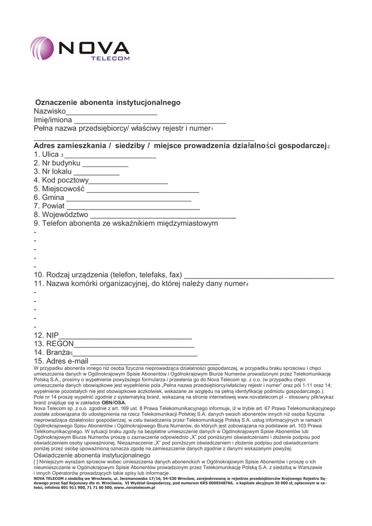 Oznaczenie abonenta instytucjonalnego Nazwisko______________________ Imię/imiona ________________ ____________________ Pełna nazwa przedsiębiorcy/ właściwy rejestr i numer 1 _____________________________________________________ Adres zamieszkania / siedziby / miejsce prowadzenia dzia łalno ści gospodarczej 2 1. Ulica 3 ______________________ 2. Nr budynku ___________ 3. Nr lokalu ___________ 4. Kod pocztowy___________________ 5. Miejscowość ___________________________ 6. Gmina ______________________________ 7. Powiat ________________________________ 8. Województwo ___________________________________ 9. Telefon abonenta ze wskaźnikiem międzymiastowym 10. Rodzaj urządzenia (telefon, telefaks, fax) ____________________________________ 11. Nazwa komórki organizacyjnej, do której należy dany numer 4 12. NIP________________________________ 13. REGON_____________________________ 14. Branża5______________________________ 15. Adres e-mail _______________________________ W przypadku abonenta innego niż osoba fizyczna nieprowadząca działalności gospodarczej, w przypadku braku sprzeciwu i chęci umieszczenia danych w Ogólnokrajowym Spisie Abonentów i Ogólnokrajowym Biurze Numerów prowadzonym przez Telekomunikację Polską S.A., prosimy o wypełnienie powyższego formularza i przesłania go do Nova Telecom sp. z o.o. (w przypadku chęci umieszczenia danych obowiązkowe jest wypełnienie pola „Pełna nazwa przedsiębiorcy/właściwy rejestr i numer” oraz pól 1-11 oraz 14; wypełnienie pozostałych nie jest obowiązkowe aczkolwiek, wskazane ze względu na pełną identyfikację podmiotu gospodarczego.). Pole nr 14 proszę wypełnić zgodnie z systematyką branż, wskazaną na stronie internetowej www.novatelecom.pl – stosowny plik/wykaz branż znajduje się w zakładce OBN/OSA. Nova Telecom sp. z o.o. zgodnie z art. 169 ust. 8 Prawa Telekomunikacyjnego informuje, iż w trybie art. 67 Prawa Telekomunikacyjnego została zobowiązana do udostępnienia na rzecz Telekomunikacji Polskiej S.A. danych swoich abonentów innych niż osoba fizyczna nieprowadząca działalności gospodarczej, w celu świadczenia przez Telekomunikację Polską S.A. usług informacyjnych w ramach Ogólnokrajowego Spisu Abonentów i Ogólnokrajowego Biura Numerów, do których jest zobowiązana na podstawie art. 103 Prawa Telekomunikacyjnego. W sytuacji braku zgody na bezpłatne umieszczenie danych w Ogólnokrajowym Spisie Abonentów lub Ogólnokrajowym Biurze Numerów proszę o zaznaczenie odpowiednio „X” pod poniższymi oświadczeniami i złożenie podpisu pod oświadczeniem osoby upoważnionej. Niezaznaczenie „X” pod poniższym oświadczeniem i złożenie podpisu pod oświadczeniami poniżej przez osobę upoważnioną oznacza zgodę na zamieszczenie danych zgodnie z danymi wskazanymi powyżej. Oświadczenie abonenta instytucjonalnego [ ] Niniejszym wyrażam sprzeciw wobec umieszczenia danych abonenckich w Ogólnokrajowym Spisie Abonentów i proszę o ich nieumieszczanie w Ogólnokrajowym Spisie Abonentów prowadzonym przez Telekomunikację Polską S.A. z siedzibą w Warszawie i innych Operatorów prowadzących takie spisy lub informacje. NOVA TELECOM z siedzibą we Wrocławiu, ul. Jerzmanowska 17/16, 54-530 Wrocław, zarejestrowaną w rejestrze przedsiębiorców Krajowego Rejestru Są dowego przez Sąd Rejonowy dla m. Wrocławia, VI Wydział Gospodarczy, pod numerem KRS 0000348766, o kapitale akcyjnym 30 000 zł, opłaconym w ca łości, infolinia 801 911 900, 71 71 60 500, www..novatelecom.pl [ ] Niniejszym wyrażam sprzeciw wobec umieszczenia danych abonenckich w Ogólnokrajowym Biurze Numerów i proszę o ich nieumieszczanie w Ogólnokrajowym Biurze Numerów prowadzonym przez Telekomunikację Polską S.A. z siedzibą w Warszawie i innych Operatorów prowadzących takie spisy lub informacje. ___________________ pieczątka firmowa, podpis osoby upoważnionej ________ __________ __________ Miejscowość, Data --------------------------------------------------------------------------------------------------------1 Dotyczy przedsiębiorców, proszę wypełnić zgodnie z danymi wynikającymi z KRS/EDG 2 Niepotrzebne skreślić 3 Proszę wskazać pełną nazwę ulicy 4 Dotyczy przedsiębiorców - Wstawić odpowiednio np. Sekretariat, Księgowość, Dział Kadr, Zarząd 5 Proszę wypełnić zgodnie z systematyką branż, wskazaną na stronie internetowej www.novatelecom.pl NOVA TELECOM z siedzibą we Wrocławiu, ul. Jerzmanowska 17/16, 54-530 Wrocław, zarejestrowaną w rejestrze przedsiębiorców Krajowego Rejestru Są dowego przez Sąd Rejonowy dla m. Wrocławia, VI Wydział Gospodarczy, pod numerem KRS 0000348766, o kapitale akcyjnym 30 000 zł, opłaconym w ca łości, infolinia 801 911 900, 71 71 60 500, www..novatelecom.pl