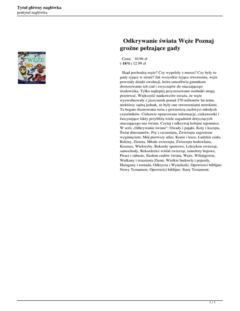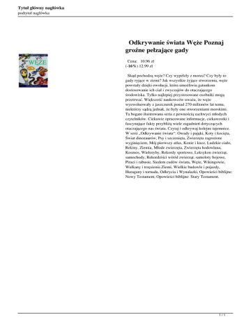 Tytuł główny nagłówka podtytuł nagłówka Odkrywanie świata Węże Poznaj groźne pełzające gady Cena: 10.96 zł (-16%) 12.99 zł Skąd pochodzą węże? Czy wypełzły z morza? Czy były to gady ryjące w ziemi? Jak wszystkie żyjące stworzenia, węże powstały dzięki ewolucji, która umożliwia gatunkom dostosowanie ich ciał i zwyczajów do otaczającego środowiska. Tylko najlepiej przystosowane osobniki mogą przetrwać. Większość naukowców uważa, że węże wyewoluowały z jaszczurek ponad 270 milionów lat temu, niektórzy sądzą jednak, że były one stworzeniami morskimi. Ta bogato ilustrowana seria z pewnością zachwyci młodych czytelników. Ciekawie opracowane informacje, ciekawostki i fascynujące fakty przybliżą wiele zagadnień dotyczących otaczającego nas świata. Czytaj i odkrywaj kolejne tajemnice. W serii „Odkrywanie świata“: Owady i pająki, Koty i kocięta, Świat dinozaurów, Psy i szczenięta, Zwierzęta zagrożone wyginięciem, Mój pierwszy atlas, Konie i kuce, Ludzkie ciało, Rekiny, Ziemia, Młode zwierzęta, Zwierzęta hodowlana, Kosmos, Wieloryby, Rekordy sportowe, Leksykon zwierząt, samochody, Rekordziści wśród zwierząt, samoloty bojowe, Piraci i rabusie, Siedem cudów świata, Węże, Wikingowie, Wulkany i trzęsienia Ziemi, Wielkie budowle i pojazdy, Huragany i tornada, Odkrycia i Wynalazki, Opowieści biblijne: Nowy Testament, Opowieści biblijne: Stary Testament. 1/1 Powered by TCPDF (www.tcpdf.org)