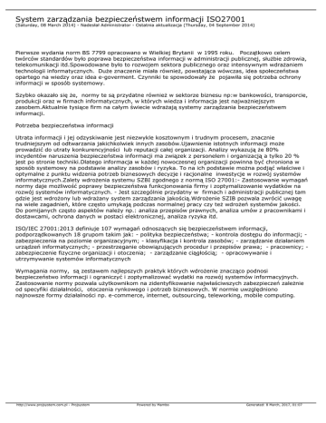 System zarządzania bezpieczeństwem informacji ISO27001 (Saturday, 08 March 2014) - Nadesłał Administrator - Ostatnia aktualizacja (Thursday, 04 September 2014) Pierwsze wydania norm BS 7799 opracowano w Wielkiej Brytanii w 1995 roku. Początkowo celem twórców standardów było poprawa bezpieczeństwa informacji w administracji publicznej, służbie zdrowia, telekomunikacji itd.Spowodowane było to rozwojem sektora publicznego oraz intensywnym wdrażaniem technologii informatycznych. Duże znaczenie miała również, powstająca wówczas, idea społeczeństwa opartego na wiedzy oraz idea e-goverment. Czynniki te spowodowały że pojawiła się potrzeba ochrony informacji w sposób systemowy. Szybko okazało się że, normy te są przydatne również w sektorze biznesu np:w bankowości, transporcie, produkcji oraz w firmach informatycznych, w których wiedza i informacja jest najważniejszym zasobem.Aktualnie tysiące firm na całym świecie wdrażają systemy zarządzania bezpieczeństwem informacji. Potrzeba bezpieczeństwa informacji Utrata informacji i jej odzyskiwanie jest niezwykle kosztownym i trudnym procesem, znacznie trudniejszym od odtwarzania jakichkolwiek innych zasobów.Ujawnienie istotnych informacji może prowadzić do utraty konkurencyjności lub reputacji całej organizacji. Analizy wykazują że 80% incydentów naruszenia bezpieczeństwa informacji ma związek z personelem i organizacją a tylko 20 % jest po stronie techniki.Dlatego informacja w każdej nowoczesnej organizacji powinna być chroniona w sposób systemowy na podstawie analizy zasobów i ryzyka. To na ich podstawie można podjąć właściwe i optymalne z punktu widzenia potrzeb biznesowych decyzje i racjonalne inwestycje w rozwój systemów informatycznych.Zalety wdrożenia systemu SZBI zgodnego z normą ISO 27001:- Zastosowanie wymagań normy daje możliwość poprawy bezpieczeństwa funkcjonowania firmy i zoptymalizowanie wydatków na rozwój systemów informatycznych. - Jest szczególnie przydatny w firmach i administracji publicznej tam gdzie jest wdrożony lub wdrażany system zarządzania jakością.Wdrożenie SZIB pozwala zwrócić uwagę na wiele zagadnień, które często umykają podczas normalnej pracy czy też wdrożeń systemów jakości. Do pomijanych często aspektów należy np.: analiza przepisów prawnych, analiza umów z pracownikami i dostawcami, ochrona danych w postaci elektronicznej, analiza ryzyka itd. ISO/IEC 27001:2013 definiuje 107 wymagań odnoszących się bezpieczeństwem informacji, podporządkowanych 18 grupom takim jak: - polityka bezpieczeństwa; - kontrola dostępu do informacji; zabezpieczenia na poziomie organizacyjnym; - klasyfikacja i kontrola zasobów; - zarządzanie działaniem urządzeń informatycznych; - przestrzeganie obowiązujących procedur i przepisów prawa; - pracownicy; zabezpieczenie fizyczne organizacji i otoczenia; - zarządzanie ciągłością; - opracowywanie i utrzymywanie systemów informatycznych Wymagania normy, są zestawem najlepszych praktyk których wdrożenie znacząco podnosi bezpieczeństwo informacji i ograniczyć i zoptymalizować wydatki na rozwój systemów informacyjnych. Zastosowanie normy pozwala użytkownikom na zidentyfikowanie najwłaściwszych zabezpieczeń zależnie od specyfiki działalności, otoczenia rynkowego i potrzeb biznesowych. W normie uwzględniono najnowsze formy działalności np. e-commerce, internet, outsourcing, teleworking, mobile computing. http://www.projsystem.com.pl - Projsystem Powered by Mambo Generated: 8 March, 2017, 01:07