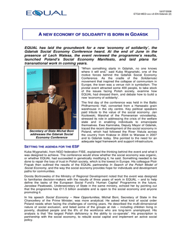 16/07/2008 ETG2-MED-xxx-v3-EN-Gdansk (2) A NEW ECONOMY OF SOLIDARITY IS BORN IN GDAŃSK EQUAL has laid the groundwork for a new ‘economy of solidarity’, the Gdańsk Social Economy Conference heard. At the end of June in the presence of Lech Walesa, the event reviewed the programme’s results, launched Poland’s Social Economy Manifesto, and laid plans for transnational work in coming years. “When something starts in Gdańsk, no one knows where it will end,” said Kuba Wygnański, one of the motive forces behind the Gdańsk Social Economy Conference. As the cradle of the Solidarnośc movement that inspired the collapse of communism in Europe, the town was a venue rich in symbolism. The pivotal event attracted some 400 people, to take stock of the issues facing Polish society, examine how EQUAL had dressed them, and debate how to build a new ‘economy of solidarity’. Secretary of State Michał Boni addresses the Gdańsk Social Economy Conference The first day of the conference was held in the Baltic Philharmonic Hall, converted from a Hanseatic grain warehouse in the city centre. Key political speakers paid tribute to the value of the social economy. Jan Kozłowski, Marshal of the Pomeranian voivodeship, stressed its role in addressing the crisis of the welfare state and in enabling individuals to emancipate themselves. Ewa Kaminska, Deputy Mayor of Gdańsk, traced the recent development of the social economy in Poland, which had followed the River Vistula across the country from Krakow in 2004 to Warsaw in 2007 and to Gdańsk today. She pointed to the need for an adequate legal framework and support infrastructure. SETTING THE AGENDA FOR THE ESF Kuba Wygnański, from NGO federation FISE, explained the thinking behind the event and what it was designed to achieve. The conference would show whether the social economy was organic, or whether EQUAL had succeeded in genetically modifying it, he said. Something needed to be done to repair the loss of trust in Polish society, which is the lowest in Europe. His colleague Piotr Frącak then outlined the results of the EQUAL partnership In Search of the Polish Model of Social Economy, and the way the social economy provides hope for individuals and development paths for communities. Dorota Bortnowska of the Ministry of Regional Development noted that the event was designed to familiarise decision-makers with the results of three years of work in EQUAL – and to help define the tasks of the European Social Fund’s ‘Human Capital’ Programme in the future. Jarosław Pawłowski, Undersecretary of State in the same ministry, echoed her by pointing out that the programme has €11.5 billion available and is open to the social economy and anyone promoting it. In his speech Social Economy – New Opportunities, Michał Boni, Secretary of State in the Chancellery of the Prime Minister, was more analytical. He asked what kind of social order Poland needs when facing the challenges of coming years. He described the multi-dimensional nature of social exclusion, and listed some of the groups at risk – including children living in poverty, disabled people and the 8% of the workforce who are long-term unemployed. His analysis is that “the largest Polish deficiency is the ability to co-operate”. His prescription is partnership with the social economy, to rebuild social capital and implement an active social policy. Outside the Structural Funds, the government is working on the creation of a loan fund to improve finance for the social economy. It also plans to move as regards the legal framework, and has a Social Co-operatives Act in the pipeline. Summing up, Mr Boni announced the government’s wish to set the pace on policy for the social economy in the European context. A MANIFESTO TO INSPIRE OTHER COUNTRIES The event’s second day was given over to a public debate on the “Economy of Solidarity”, held in the historic shipyards where Solidarnośc was born. It was honoured by the presence of Lech Walesa, leader of the protests in 1990 and subsequently President of Poland. The centrepiece of the debate was the Social Economy ManifESto. This substantial document, worked out by members of the EQUAL partnership In Search of a Polish Model of Social Economy and developed with SKES (Stała Konferencja Ekonomii Społecznej or Standing Conference of the Social Economy) has been boiled down 21 points, on two sides of paper. It pays tribute to the role of EQUAL in supporting pilot activity from which much has been learnt, and stresses the social economy’s role as a partner with government. “We should give up the antagonistic idea on the mutual relations between the State and the civil society… they need to support each other,” it says. Whilst the private sector is undeniably the main driver of economic growth, the public sector must give up its suspicions and work in true partnership with the social economy for the good of society. “The role of social economy is not only to provide services, but to participate in their definition.” Among all the new Member States, it is Poland that has made best use of EQUAL to develop the social economy, and the Manifesto sees the further potential of transnational work. It rounds off: “We have learnt a lot from our colleagues in other countries. We believe that it will be possible to work out some institutional mechanism for transnational co-operation, and that it can extend beyond the European Union. Our deepest wish is that our Polish experience can become an inspiration for others.” PLANS FOR A TRANSNATIONAL LEARNING NETWORK The Gdańsk event was also the occasion for representatives of different EU Member States to discuss how to work together on social economy issues in the forthcoming Structural Funds programming period, which runs until 2013. As well as Poland, who hosted the meeting, Finland, Flanders, Germany, Sweden, Wales and the European Commission were represented, and several othe