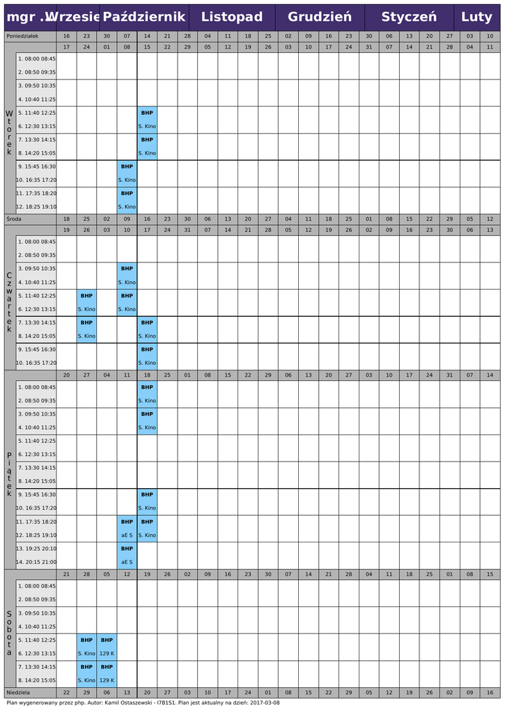 mgr ... Wrzesień Październik Poniedziałek Listopad Grudzień Styczeń Luty 16 23 30 07 14 21 28 04 11 18 25 02 09 16 23 30 06 13 20 27 03 10 17 24 01 08 15 22 29 05 12 19 26 03 10 17 24 31 07 14 21 28 04 11 1. 08:00 08:45 2. 08:50 09:35 3. 09:50 10:35 4. 10:40 11:25 W t o r e k 5. 11:40 12:25 BHP 6. 12:30 13:15 S. Kino 7. 13:30 14:15 BHP 8. 14:20 15:05 S. Kino 9. 15:45 16:30 BHP 10. 16:35 17:20 S. Kino 11. 17:35 18:20 BHP 12. 18:25 19:10 S. Kino Środa 18 25 02 09 16 23 30 06 13 20 27 04 11 18 25 01 08 15 22 29 05 12 19 26 03 10 17 24 31 07 14 21 28 05 12 19 26 02 09 16 23 30 06 13 25 01 08 15 22 29 06 13 20 27 03 10 17 24 31 07 14 1. 08:00 08:45 2. 08:50 09:35 C z w a r t e k 3. 09:50 10:35 BHP 4. 10:40 11:25 S. Kino 5. 11:40 12:25 BHP BHP 6. 12:30 13:15 S. Kino S. Kino 7. 13:30 14:15 BHP BHP 8. 14:20 15:05 S. Kino S. Kino 9. 15:45 16:30 BHP 10. 16:35 17:20 S. Kino 20 27 04 11 18 1. 08:00 08:45 BHP 2. 08:50 09:35 S. Kino 3. 09:50 10:35 BHP 4. 10:40 11:25 S. Kino 5. 11:40 12:25 P i ą t e k 6. 12:30 13:15 7. 13:30 14:15 8. 14:20 15:05 9. 15:45 16:30 BHP 10. 16:35 17:20 S. Kino 11. 17:35 18:20 BHP BHP 12. 18:25 19:10 aE S S. Kino 13. 19:25 20:10 BHP 14. 20:15 21:00 aE S 21 28 05 BHP BHP 12 19 26 02 09 16 23 30 07 14 21 28 04 11 18 25 01 08 15 13 20 27 03 10 17 24 01 08 15 22 29 05 12 19 26 02 09 16 1. 08:00 08:45 2. 08:50 09:35 S o b o t a 3. 09:50 10:35 4. 10:40 11:25 5. 11:40 12:25 6. 12:30 13:15 S. Kino 129 K 7. 13:30 14:15 BHP 8. 14:20 15:05 Niedziela BHP S. Kino 129 K 22 29 06 Plan wygenerowany przez php. Autor: Kamil Ostaszewski - I7B1S1. Plan jest aktualny na dzień: 2017-03-08