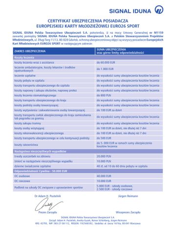 CERTYFIKAT UBEZPIECZENIA POSIADACZA EUROPEJSKIEJ KARTY MŁODZIEŻOWEJ EURO26 SPORT SIGNAL IDUNA Polska Towarzystwo Ubezpieczeń S.A. potwierdza, iż na mocy Umowy Generalnej nr M1159 zawartej pomiędzy SIGNAL IDUNA Polska Towarzystwo Ubezpieczeń S.A. a Polskim Stowarzyszeniem Projektów Młodzieżowych, ul. Długi Targ 11/13, 80-828 Gdańsk, ochroną ubezpieczeniową objęci są wszyscy posiadacze Europejskich Kart Młodzieżowych EURO26 SPORT w następującym zakresie: ZAKRES UBEZPIECZENIA SUMA UBEZPIECZENIA oraz górne limity odpowiedzialności Koszty leczenia koszty leczenia wraz z assistance do 60.000 EUR leczenie ambulatoryjne, koszty lekarstw i środków opatrunkowych do 1.000 EUR leczenie szpitalne do wysokości sumy ubezpieczenia kosztów leczenia koszty pobytu w szpitalu do wysokości sumy ubezpieczenia kosztów leczenia koszty transportu ubezpieczonego do szpitala do wysokości sumy ubezpieczenia kosztów leczenia koszty naprawy i zakupu okularów, naprawy protez do wysokości sumy ubezpieczenia kosztów leczenia koszty leczenia stomatologicznego do 800 PLN koszty transportu ubezpieczonego do kraju do wysokości sumy ubezpieczenia kosztów leczenia koszty podróży osoby towarzyszącej do wysokości sumy ubezpieczenia kosztów leczenia koszty wyżywienia i zakwaterowania osoby towarzyszącej do 100 EUR za dzień koszty transportu zwłok ubezpieczonego do kraju zamieszkania lub pogrzebu za granicą do wysokości sumy ubezpieczenia kosztów leczenia koszty zakupu trumny do wysokości sumy ubezpieczenia kosztów leczenia koszty osoby wizytującej do 100 EUR za dzień, nie dłużej niż 7 dni koszty rekonwalescencji ubezpieczonego do 100 EUR za dzień, nie dłużej niż 7 dni koszty transportu ubezpieczonego w celu kontynuacji podróży do 500 EUR koszty ratownictwa do 5. 000 EUR w ramach sumy ubezpieczenia kosztów leczenia Następstwa nieszczęśliwych wypadków trwały uszczerbek na zdrowiu 20.000 PLN śmierć w następstwie nieszczęśliwego wypadku 10.000 PLN dzienne świadczenie szpitalne 40 zł, od 10 do 60 dnia pobytu w szpitalu Odpowiedzialność Cywilna - 50.000 EUR OC osobowe 40.000 EUR OC rzeczowe 10.000 EUR Podlimit na szkody OC związane z uprawianiem sportów 5.000 EUR - szkody osobowe, 2.500 EUR - szkody rzeczowe Dr Adam H. Pustelnik Jürgen Reimann Prezes Zarządu Wiceprezes Zarządu SIGNAL IDUNA Polska Towarzystwo Ubezpieczeń S.A. Zarząd: Adam H. Pustelnik, Anetta Guzek, Rainer Schönberg, Jürgen Reimann KRS: 42793, NIP: 583-27-58-112, REGON: 192566592; Siedziba: ul. Jasna 14/16a, 00-041 Warszawa