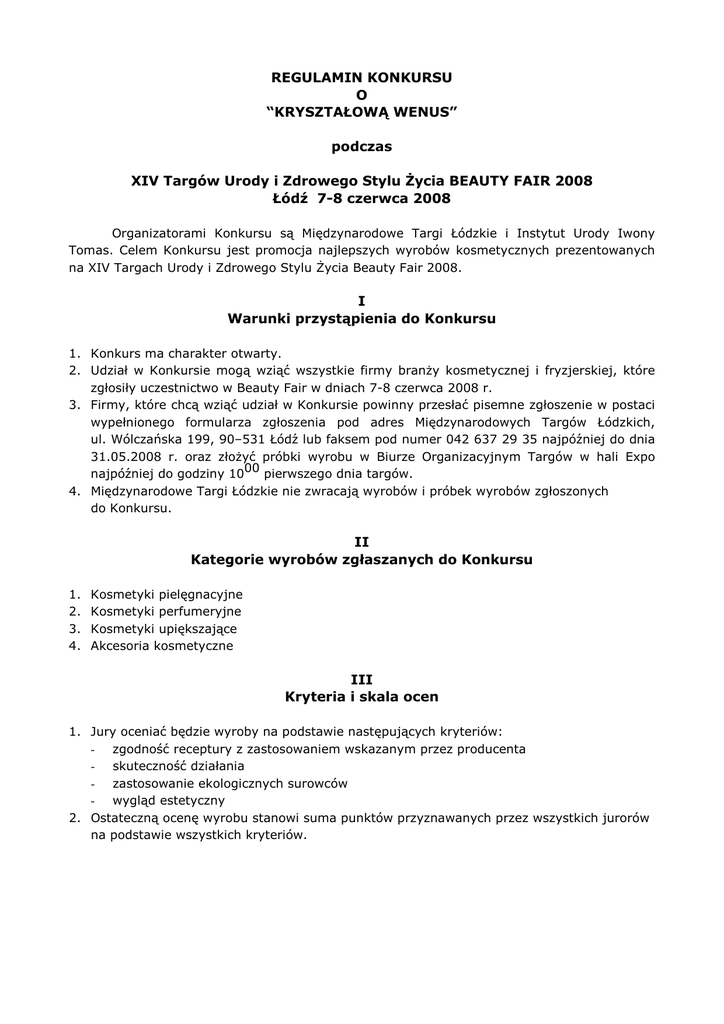 REGULAMIN KONKURSU O “KRYSZTAŁOWĄ WENUS” podczas XIV Targów Urody i Zdrowego Stylu śycia BEAUTY FAIR 2008 Łódź 7-8 czerwca 2008 Organizatorami Konkursu są Międzynarodowe Targi Łódzkie i Instytut Urody Iwony Tomas. Celem Konkursu jest promocja najlepszych wyrobów kosmetycznych prezentowanych na XIV Targach Urody i Zdrowego Stylu śycia Beauty Fair 2008. I Warunki przystąpienia do Konkursu 1. Konkurs ma charakter otwarty. 2. Udział w Konkursie mogą wziąć wszystkie firmy branŜy kosmetycznej i fryzjerskiej, które zgłosiły uczestnictwo w Beauty Fair w dniach 7-8 czerwca 2008 r. 3. Firmy, które chcą wziąć udział w Konkursie powinny przesłać pisemne zgłoszenie w postaci wypełnionego formularza zgłoszenia pod adres Międzynarodowych Targów Łódzkich, ul. Wólczańska 199, 90–531 Łódź lub faksem pod numer 042 637 29 35 najpóźniej do dnia 31.05.2008 r. oraz złoŜyć próbki wyrobu w Biurze Organizacyjnym Targów w hali Expo 00 najpóźniej do godziny 10 pierwszego dnia targów. 4. Międzynarodowe Targi Łódzkie nie zwracają wyrobów i próbek wyrobów zgłoszonych do Konkursu. II Kategorie wyrobów zgłaszanych do Konkursu 1. 2. 3. 4. Kosmetyki pielęgnacyjne Kosmetyki perfumeryjne Kosmetyki upiększające Akcesoria kosmetyczne III Kryteria i skala ocen 1. Jury oceniać będzie wyroby na podstawie następujących kryteriów: - zgodność receptury z zastosowaniem wskazanym przez producenta - skuteczność działania - zastosowanie ekologicznych surowców - wygląd estetyczny 2. Ostateczną ocenę wyrobu stanowi suma punktów przyznawanych przez wszystkich jurorów na podstawie wszystkich kryteriów. IV Jury 1. Organizatorzy Konkursu powołują jury złoŜone z reprezentujących wysoki poziom wiedzy i doświadczeń w przedmiocie Konkursu, przedstawicieli: środowisk naukowych. Instytutu Urody, Akademii Sztuk Pięknych im. W. Strzemińskiego w Łodzi, Międzynarodowych Targów Łódzkich, patronów medialnych Targów. Jury rozpocznie pracę 7 czerwca 2008 r. o godz. 11.00, oceni wyroby zgłoszone do konkursu i podejmie decyzję o przyznaniu nagród. 3. Ogłoszenie wyników, wręczenie nagród i wyróŜnień nastąpi w dniu 7 czerwca 2008 r. w godzinach popołudniowych. 2. V Nagrody 1. Nagrodami Konkursu są statuetki “Kryształowa Wenus”. 2. Jury przyznaje statuetki i dyplomy za najlepszy wyrób w danej kategorii oraz wyróŜnienia w formie dyplomów. 3. Nagroda przyznawana jest za najlepszy wyrób kosmetyczny producentowi wyrobu kosmetycznego lub producentowi wyrobu kosmetycznego, w którego imieniu moŜe występować dystrybutor. 4. Wszelkie materiały i działania jury mają charakter poufny i nie będą udostępnione osobom trzecim.