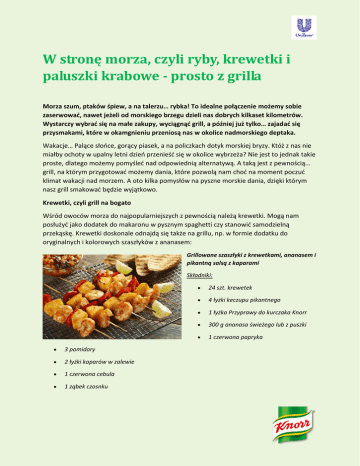 W stronę morza, czyli ryby, krewetki i paluszki krabowe - prosto z grilla Morza szum, ptaków śpiew, a na talerzu… rybka! To idealne połączenie możemy sobie zaserwować, nawet jeżeli od morskiego brzegu dzieli nas dobrych kilkaset kilometrów. Wystarczy wybrać się na małe zakupy, wyciągnąć grill, a później już tylko… zajadać się przysmakami, które w okamgnieniu przeniosą nas w okolice nadmorskiego deptaka. Wakacje… Palące słońce, gorący piasek, a na policzkach dotyk morskiej bryzy. Któż z nas nie miałby ochoty w upalny letni dzień przenieść się w okolice wybrzeża? Nie jest to jednak takie proste, dlatego możemy pomyśleć nad odpowiednią alternatywą. A taką jest z pewnością… grill, na którym przygotować możemy dania, które pozwolą nam choć na moment poczuć klimat wakacji nad morzem. A oto kilka pomysłów na pyszne morskie dania, dzięki którym nasz grill smakować będzie wyjątkowo. Krewetki, czyli grill na bogato Wśród owoców morza do najpopularniejszych z pewnością należą krewetki. Mogą nam posłużyć jako dodatek do makaronu w pysznym spaghetti czy stanowić samodzielną przekąskę. Krewetki doskonale odnajdą się także na grillu, np. w formie dodatku do oryginalnych i kolorowych szaszłyków z ananasem: Grillowane szaszłyki z krewetkami, ananasem i pikantną salsą z kaparami Składniki: 3 pomidory 2 łyżki kaparów w zalewie 1 czerwona cebula 1 ząbek czosnku 24 szt. krewetek 4 łyżki keczupu pikantnego 1 łyżka Przyprawy do kurczaka Knorr 300 g ananasa świeżego lub z puszki 1 czerwona papryka 1 pęczek świeżej kolendry 4 łyżki oliwy z oliwek Sposób przygotowania: 1. Cebulę i pomidory pokrój w małą kostkę, posiekaj czosnek, kolendrę i z odsączonymi z zalewy kaparami wsyp do miski. Dodaj 2 łyżki oliwy i keczupu i wymieszaj z resztą składników. Całość dopraw do smaku i odłóż do lodówki. 2. Paprykę i ananasa pokrój w kostkę o boku ok. 3 cm i włóż wraz z krewetkami do miski. Wyciśnij bezpośrednio nad składnikami cytrynę, dodaj po 2 łyżki oliwy, keczupu i wymieszaj ze składnikami, w tym Przyprawą do kurczaka Knorr, która świetnie doprawi danie. 3. Składniki nadziewaj naprzemiennie na wykałaczki do szaszłyków. 4. Szaszłyki smaż na rozgrzanym grillu przez ok. 2-3 minuty z każdej strony. 5. Gotowe danie podawaj z przygotowanym wcześniej sosem i grzankami przypieczonymi na grillu. A może marzy się nam nieco bardziej orientalne połączenie? Wypróbujmy krewetki z trawą cytrynową i grillowanym czosnkiem: Krewetki na trawie cytrynowej z grillowanym czosnkiem Składniki: 21 szt. dużych krewetek bez skorupek 500 g łososia 2 łyżki Przyprawy do grilla Knorr 3 łyżki Sosu Hellmann’s CHILLI 7 szt. trawy cytrynowej 14 szt. przekrojonych na pół pomidorków koktajlowych 7 szt. cebulki szalotki 1 pęczek natki kolendry 6 łyżek oliwy z oliwek 3 ząbki czosnku Sposób przygotowania: 1. Aby łatwo obrać szalotkę, zalej ją wrzątkiem i odstaw na chwilę. Następnie ściągnij z niej zewnętrzną warstwę i przekrój każdą cebulę na pół. 2. Rybę pokrój w kostkę o boku ok. 2 cm. Tak przygotowane mięso umieść wraz z krewetkami w misce, do składników dolej oliwę (3 łyżki), dodaj Przyprawę do grilla Knorr, która idealnie doprawi mięso, i ćwierć posiekanego pęczka kolendry. Wszystko starannie wymieszaj. 3. Na reszcie oliwy podsmaż siekany czosnek. Kiedy się lekko przyrumieni, dodaj 3 łyżki sosu, resztkę kolendry i łyżkę wody, następnie całość stanie wymieszaj. 4. Składniki nadziewaj na trawę cytrynową w następującej kolejności: krewetka, cebulka, łosoś i pomidor. Na każdym z szaszłyków powinny znaleźć się 3 kawałki ryby i 3 krewetki. 5. Przygotowane szaszłyki polej na wierzchu przygotowanym wcześniej sosem, następnie grilluj na ruszcie rozgrzanego grilla po ok. 4-6 minuty na każdej ze stron, po każdym przełożeniu posmaruj wierzch sosem. Łososiowo Łosoś - świetnie smakuje podany w formie tatara albo carpaccio. Można go smażyć, dusić, piec, jak również… grillować. W takiej formie z pewnością zasmakuje wszystkim naszym gościom. Szczególnie, jeżeli podamy go na chrupiącej grzance otoczonej ziołami: Rybne szaszłyki na chrupiącej grzance z ziołami Składniki: 1 bagietka sok z połowy cytryny Sposób przygotowania: 300 g filetu z łososia 2 łyżeczki Przyprawy do kurczaka Knorr 2 łyżki sosu czosnkowego 8 szt. krewetek 2 szt. sałaty lub innej sałaty 1 opak. suszonych pomidorów 1. Łososia pokrojonego na kostkę o boku 2 cm i krewetki posyp Przyprawą do kurczaka Knorr, dzięki której nabiorą idealnego smaku. Tak przygotowane składniki naprzemiennie nabijaj na wykałaczki do szaszłyków. 2. Polej szaszłyki niewielką ilością oliwy i poukładaj je na ruszcie dobrze rozgrzanego grilla. Każdą ze stron smaż po 2-3 minuty. 3. Pokrojone na skos kromki bagietki ułóż na grillu i przypiecz z każdej ze stron. Tak przygotowane kawałki pieczywa posmaruj z wierzchu sosem czosnkowym. 4. Rukolę przełóż do miski i skrop 2 łyżkami oliwy z suszonych pomidorów, wymieszaj i połóż tak przygotowaną sałatę na każdej z przygotowanych wcześniej grzanek. 5. Szaszłyki połóż na grzanki. Podawaj skropione sokiem z cytryny. Paluszki lizać! Szczególnie, gdy są to paluszki krabowe - surimi. Wbrew najprostszemu skojarzeniu nie wytwarza się ich z mięsa krabów. Najczęściej jest to zmielone mięso rybie, np. z mintaja czy dorsza. Nie zmienia to jednak faktu, że i one znaleźć się mogą na naszym stole podczas grillowego spotkania w morskim klimacie. Wystarczy, że z ich dodatkiem przyrządzimy sałatkę na bazie grillowanych warzyw i grzanek. Znakomity efekt - murowany! Grecka sałatka z grillowanych warzyw z krabowymi paluszkami i grzankami z sosem czosnkowym Składniki: 10 szt. paluszków krabowych 0,5 bakłażana 3 czerwone cebule 2 łyżki zielonych oliwek 2 łyżki czarnych oliwek 1 papry