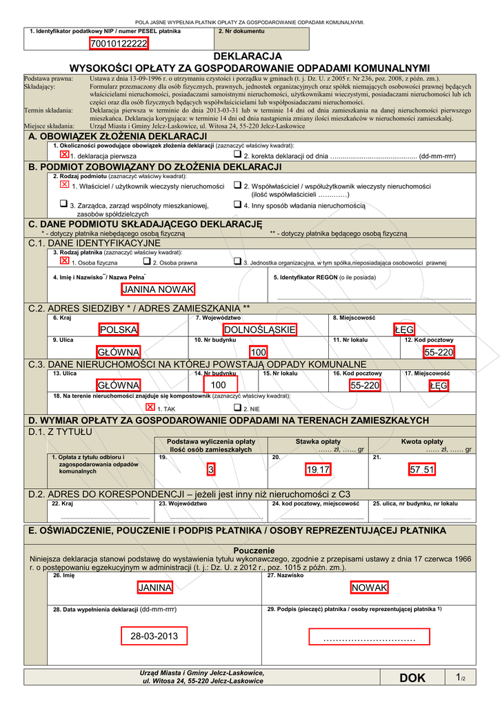POLA JASNE WYPEŁNIA PŁATNIK OPŁATY ZA GOSPODAROWANIE ODPADAMI KOMUNALNYMI. 1. Identyfikator podatkowy NIP / numer PESEL płatnika 2. Nr dokumentu 70010122222 DEKLARACJA WYSOKOŚCI OPŁATY ZA GOSPODAROWANIE ODPADAMI KOMUNALNYMI Podstawa prawna: Składający: Termin składania: Miejsce składania: Ustawa z dnia 13-09-1996 r. o utrzymaniu czystości i porządku w gminach (t. j. Dz. U. z 2005 r. Nr 236, poz. 2008, z późn. zm.). Formularz przeznaczony dla osób fizycznych, prawnych, jednostek organizacyjnych oraz spółek niemających osobowości prawnej będących właścicielami nieruchomości, posiadaczami samoistnymi nieruchomości, użytkownikami wieczystymi, posiadaczami nieruchomości lub ich części oraz dla osób fizycznych będących współwłaścicielami lub współposiadaczami nieruchomości. Deklaracja pierwsza w terminie do dnia 2013-03-31 lub w terminie 14 dni od dnia zamieszkania na danej nieruchomości pierwszego mieszkańca. Deklaracja korygująca: w terminie 14 dni od dnia nastąpienia zmiany ilości mieszkańców w nieruchomości zamieszkałej. Urząd Miasta i Gminy Jelcz-Laskowice, ul. Witosa 24, 55-220 Jelcz-Laskowice A. OBOWIĄZEK ZŁOŻENIA DEKLARACJI 1. Okoliczności powodujące obowiązek złożenia deklaracji (zaznaczyć właściwy kwadrat): 1. deklaracja pierwsza 2. korekta deklaracji od dnia ….......................................... (dd-mm-rrrr) B. PODMIOT ZOBOWIĄZANY DO ZŁOŻENIA DEKLARACJI 2. Rodzaj podmiotu (zaznaczyć właściwy kwadrat): 1. Właściciel / użytkownik wieczysty nieruchomości 2. Współwłaściciel / współużytkownik wieczysty nieruchomości (ilość współwłaścicieli …….……) 3. Zarządca, zarząd wspólnoty mieszkaniowej, 4. Inny sposób władania nieruchomością zasobów spółdzielczych C. DANE PODMIOTU SKŁADAJĄCEGO DEKLARACJĘ * - dotyczy płatnika niebędącego osobą fizyczną ** - dotyczy płatnika będącego osobą fizyczną C.1. DANE IDENTYFIKACYJNE 3. Rodzaj płatnika (zaznaczyć właściwy kwadrat): 1. Osoba fizyczna 2. Osoba prawna 3. Jednostka organizacyjna, w tym spółka,nieposiadająca osobowości 4. Imię i Nazwisko**/ Nazwa Pełna* prawnej 5. Identyfikator REGON (o ile posiada) JANINA NOWAK …………………………………..........................................................……………………….………………… C.2. ADRES SIEDZIBY * / ADRES ZAMIESZKANIA ** 8. Miejscowość 7. Województwo 6. Kraj ŁĘG DOLNOŚLĄSKIE POLSKA 9. Ulica 10. Nr budynku 11. Nr lokalu 12. Kod pocztowy GŁÓWNA 100 C.3. DANE NIERUCHOMOŚCI NA KTÓREJ POWSTAJĄ ODPADY KOMUNALNE 55-220 13. Ulica 14. Nr budynku GŁÓWNA 15. Nr lokalu 17. Miejscowość 16. Kod pocztowy 100 ŁĘG 55-220 18. Na terenie nieruchomości znajduje się kompostownik (zaznaczyć właściwy kwadrat): 1. TAK 2. NIE D. WYMIAR OPŁATY ZA GOSPODAROWANIE ODPADAMI NA TERENACH ZAMIESZKAŁYCH D.1. Z TYTUŁU Podstawa wyliczenia opłaty Ilość osób zamieszkałych 1. Opłata z tytułu odbioru i zagospodarowania odpadów komunalnych 19. Stawka opłaty …… zł, …… gr 20. Kwota opłaty …… zł, …… gr 21. 3 19, 17 57 , 51 D.2. ADRES DO KORESPONDENCJI – jeżeli jest inny niż nieruchomości z C3 23. Województwo 22. Kraj ……………………………………………………… 24. kod pocztowy, miejscowość …………………..……………………………………. ………………………………………………...... 25. ulica, nr budynku, nr lokalu ..................………….......……………………...... E. OŚWIADCZENIE, POUCZENIE I PODPIS PŁATNIKA / OSOBY REPREZENTUJĄCEJ PŁATNIKA Pouczenie Niniejsza deklaracja stanowi podstawę do wystawienia tytułu wykonawczego, zgodnie z przepisami ustawy z dnia 17 czerwca 1966 r. o postępowaniu egzekucyjnym w administracji (t. j.: Dz. U. z 2012 r., poz. 1015 z późn. zm.). 26. Imię 27. Nazwisko JANINA 28. Data wypełnienia deklaracji (dd-mm-rrrr) 28-03-2013 Urząd Miasta i Gminy Jelcz-Laskowice, ul. Witosa 24, 55-220 Jelcz-Laskowice NOWAK 29. Podpis (pieczęć) płatnika / osoby reprezentującej płatnika 1) ………………………… DOK 1/2 F. ADNOTACJE ORGANU WERYFIKUJĄCEGO WYSOKOŚĆ OPŁATY 30. Uwagi organu 32. Podpis weryfikującego formularz 31. Data (dd-mm-rrrr) ……………………………….............................................................……………………....…………………… 1) ………………..……………….......................................................………………………....…………………… Niepotrzebne skreślić. Objaśnienia do deklaracji Formularz jest przeznaczony dla właścicieli nieruchomości, do których ma zastosowanie art. 6n ust. 1 ustawy z dnia 13 września 1996 r. o utrzymaniu czystości i porządku w gminach (t. j.: Dz. U. z 2005 r. Nr 236, poz. 2008, z późn. zm.), którzy: 1. składają deklarację na opłatę za gospodarowanie odpadami komunalnymi DOK po raz pierwszy, 2. dokonują korekty wysokości opłaty za gospodarowanie odpadami komunalnymi, i ma zastosowanie dla nieruchomości: a) będącej własnością składającego, na której znajduje się jeden lokal mieszkalny, b) będącej współwłasnością kilku osób lub podmiotów, dla której nie jest powołany zarządca lub zarząd i każdy ze współwłaścicieli składa deklarację indywidualnie, c) jako deklaracja zbiorcza składana dla nieruchomości o dwóch lub więcej lokalach mieszkalnych Przez właścicieli nieruchomości rozumie się także współwłaścicieli, użytkowników wieczystych oraz jednostki organizacyjne i osoby posiadające nieruchomość w zarządzie lub użytkowaniu, a także inne podmioty władające nieruchomością. Przed wypełnieniem deklaracji należy zapoznać się z objaśnieniami i informacjami zawartymi na formularzu. Jeżeli pole przeznaczone do wypełnienia nie będzie wypełnione – organ weryfikujący przyjmie, że składający deklarację wpisał „0