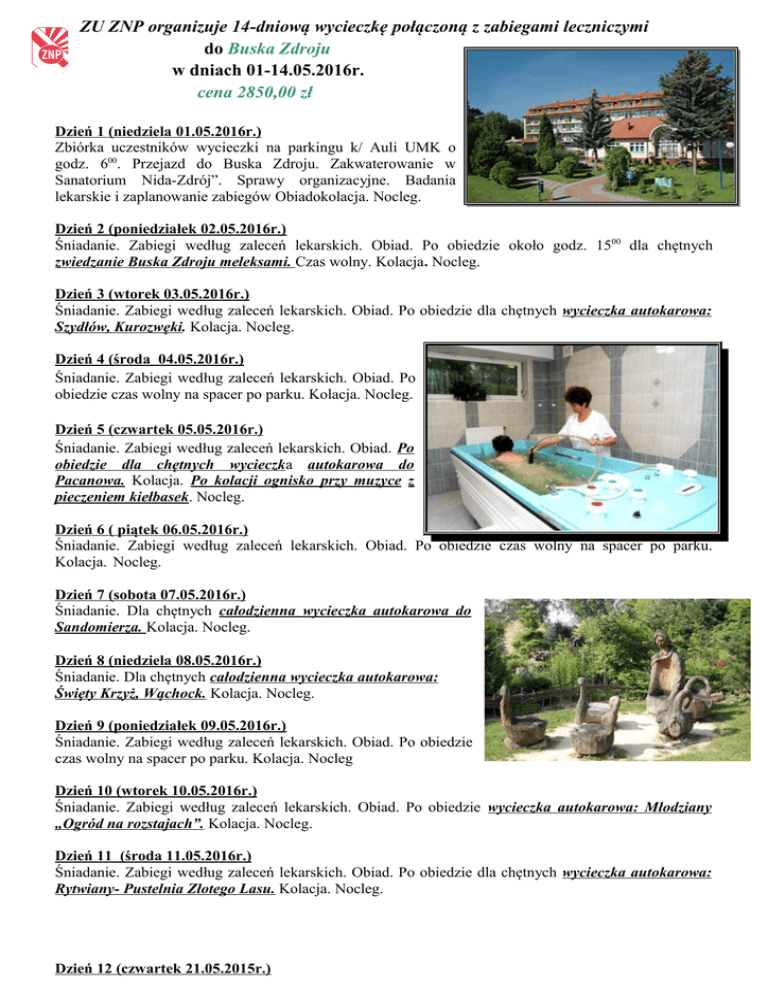ZU ZNP organizuje 14-dniową wycieczkę połączoną z zabiegami leczniczymi do Buska Zdroju w dniach 01-14.05.2016r. cena 2850,00 zł Dzień 1 (niedziela 01.05.2016r.) Zbiórka uczestników wycieczki na parkingu k/ Auli UMK o godz. 600. Przejazd do Buska Zdroju. Zakwaterowanie w Sanatorium Nida-Zdrój”. Sprawy organizacyjne. Badania lekarskie i zaplanowanie zabiegów Obiadokolacja. Nocleg. Dzień 2 (poniedziałek 02.05.2016r.) Śniadanie. Zabiegi według zaleceń lekarskich. Obiad. Po obiedzie około godz. 1500 dla chętnych zwiedzanie Buska Zdroju meleksami. Czas wolny. Kolacja. Nocleg. Dzień 3 (wtorek 03.05.2016r.) Śniadanie. Zabiegi według zaleceń lekarskich. Obiad. Po obiedzie dla chętnych wycieczka autokarowa: Szydłów, Kurozwęki. Kolacja. Nocleg. Dzień 4 (środa 04.05.2016r.) Śniadanie. Zabiegi według zaleceń lekarskich. Obiad. Po obiedzie czas wolny na spacer po parku. Kolacja. Nocleg. Dzień 5 (czwartek 05.05.2016r.) Śniadanie. Zabiegi według zaleceń lekarskich. Obiad. Po obiedzie dla chętnych wycieczka autokarowa do Pacanowa. Kolacja. Po kolacji ognisko przy muzyce z pieczeniem kiełbasek. Nocleg. Dzień 6 ( piątek 06.05.2016r.) Śniadanie. Zabiegi według zaleceń lekarskich. Obiad. Po obiedzie czas wolny na spacer po parku. Kolacja. Nocleg. Dzień 7 (sobota 07.05.2016r.) Śniadanie. Dla chętnych całodzienna wycieczka autokarowa do Sandomierza. Kolacja. Nocleg. Dzień 8 (niedziela 08.05.2016r.) Śniadanie. Dla chętnych całodzienna wycieczka autokarowa: Święty Krzyż, Wąchock. Kolacja. Nocleg. Dzień 9 (poniedziałek 09.05.2016r.) Śniadanie. Zabiegi według zaleceń lekarskich. Obiad. Po obiedzie czas wolny na spacer po parku. Kolacja. Nocleg Dzień 10 (wtorek 10.05.2016r.) Śniadanie. Zabiegi według zaleceń lekarskich. Obiad. Po obiedzie wycieczka autokarowa: Młodziany „Ogród na rozstajach”. Kolacja. Nocleg. Dzień 11 (środa 11.05.2016r.) Śniadanie. Zabiegi według zaleceń lekarskich. Obiad. Po obiedzie dla chętnych wycieczka autokarowa: Rytwiany- Pustelnia Złotego Lasu. Kolacja. Nocleg. Dzień 12 (czwartek 21.05.2015r.) Śniadanie. Zabiegi według zaleceń lekarskich. Obiad. Po obiedzie czas wolny na spacer po parku. Kolacja. Ognisko przy muzyce z pieczeniem kiełbasek. Nocleg. Dzień 13 (piątek 13.05.2016r.) Śniadanie. Zabiegi według zaleceń lekarskich. Obiad. Po obiedzie czas wolny na spacer po parku. Kolacja. Nocleg. Dzień 14 (sobota 14.05.2016r. Śniadanie. Wykwaterowanie z Sanatorium. O godz. 900 Przejazd do Torunia . Cena obejmuje: zakwaterowanie w sanatorium „Nida Zdrój” http://www.sanatoria.com.pl w pokojach 2 os. z RTV, z pełnym węzłem sanitarnym, pokoje 1 os. są o obniżonym standardzie (może być brak balkonu, czajnika, lodówki, w łazienkach, zamiast kabiny prysznicowej może być zasłona), 40 rodzajów zabiegów świadczonych w dni zabiegowe, całodobową opiekę lekarsko-pielęgniarską, całodzienne wyżywienie z możliwością diety (3 posiłki), zwiedzanie okolicy z przewodnikiem, wycieczki autokarowe po okolicy, wstępy do zwiedzanych obiektów, ubezpieczenie PZU, opłatę klimatyczną, autokar na całej trasie i do dyspozycji na miejscu, opieka organizatora przez cały pobyt. Zaliczkę w wysokości 800, 00zł należy wpłacić do 05.02.2016r. Pozostałą kwotę tj. 2050,00zł należy wpłacić do 31.03.2016r. Wpłat można dokonać w biurze ZNP, agencji PKO, lub na konto ZNP. 71 1160 2202 0000 0000 5530 4852 w tytule proszę podać nazwisko i Busko Zdrój Członkowie ZNP płacą 2750,00zł Jednocześnie informujemy, że do dwóch wycieczek można otrzymać dofinansowanie z Funduszu Świadczeń Socjalnych. W tym roku nastąpiła zmiana obliczania dofinansowania !!! Do wszystkich wycieczek podstawą do obliczenia dofinansowania jest jednakowa kwota 1800,00zł, a nie jak w ubiegłych latach podstawą była cena wycieczki.