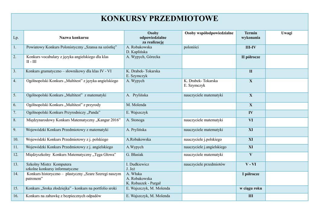 KONKURSY PRZEDMIOTOWE Lp. Nazwa konkursu Osoby odpowiedzialne za realizację A. Robakowska D. Kaplińska A. Wypych, Górecka Osoby współodpowiedzialne 1. Powiatowy Konkurs Polonistyczny „Szansa na szóstkę” 2. Konkurs vocabulary z języka angielskiego dla klas II - III 3. Konkurs gramatyczno – słownikowy dla klas IV - VI 4. Ogólnopolski Konkurs „Multitest” z języka angielskiego K. Drabek- Tokarska E. Szymczyk A. Wypych 5. Ogólnopolski Konkurs „Multitest” z matematyki A. Prylińska 6. Ogólnopolski Konkurs „Multitest” z przyrody M. Molenda X 7. Ogólnopolski Konkurs Przyrodniczy „Panda” E. Wajszczyk IV 8. Międzynarodowy Konkurs Matematyczny „Kangur 2016” A. Stonoga nauczyciele matematyki VI 9. Wojewódzki Konkurs Przedmiotowy z matematyki A. Prylińska nauczyciele matematyki XI 10. Wojewódzki Konkurs Przedmiotowy z j. polskiego A.Robakowska nauczyciele j.polskiego XI 11. Wojewódzki Konkurs Przedmiotowy z j. angielskiego A.Wypych nauczyciele j.angielskiego XI 12. Międzyszkolny Konkurs Matematyczny „Tęga Głowa” G. Błasiak nauczyciele matematyki V 13. Szkolny Mistrz Komputera szkolne konkursy informatyczne Konkurs historyczno – plastyczny „Szare Szeregi naszym patronem” nauczyciele przedmiotów V - VI 15. Konkurs „Sroka złodziejka” - konkurs na portfolio sroki I. Dudkiewicz J. Jeż A. Włuka A. Robakowska K. Robaszek - Purgał E. Wajszczyk, M. Molenda 16. Konkurs na zabawkę z bezpiecznych odpadów E. Wajszczyk, M. Molenda 14. poloniści Termin wykonania III-IV II półrocze II K. Drabek- Tokarska E. Szymczyk X nauczyciele matematyki X I półrocze w ciągu roku III Uwagi 17. „Perełki przyrodnicze w mojej okolicy” E. Wajszczyk, M. Molenda W ciągu roku 18. E. Wajszczyk, M. Molenda IV 19. Konkurs wiedzy ekologicznej „Alternatywne źródła energii” Konkursy czytelnicze dla klas I - VI 20. Piotrków moje miasto K. Robaszek - Purgał, J . Kizyma A. Cienkowska Szady wychowawcy świetlicy I 21. Co wiesz o znakach drogowych? A. Cienkowska Szady wychowawcy świetlicy XI 22. Co wiesz o Świętach Bożego Narodzenia? wychowawcy świetlicy XII 23. ABC dobrego zachowania A. Cienkowska Szady A. Rózga A. Cienkowska Szady wychowawcy świetlicy III 24. U. Wałkówska A. Cienkowska Szady wychowawcy świetlicy VI 25. Miedzyszkolny turniej pod hasłem „Nasza przyszłość: bezpieczne środowisko – zdrowa żywność – ruch i aktywność” Konkurs plastyczny „Piotrków – moje miasto” A. Cienkowska Szady wychowawcy świetlicy I 26. Turniej wiedzy „Wiem wszystko” A. Cienkowska Szady wychowawcy świetlicy V 27. Międzyszkolny konkurs plastyczny Jesienne wariacje” U. Wałkówska A. Cienkowska Szady wychowawcy świetlicy XI 28. Konkurs recytatorski o kobietach wychowawcy świetlicy III wychowawcy świetlicy IV wychowawcy świetlicy IV 29. 30. 31. 32. Quiz wielkanocny – wiem wszystko o Świętach Wielkanocnych Konkurs plastyczny o tradycjach wielkanocnych Świetlicowy konkurs piosenki ludowej i patriotycznej kl I - III Turnieje świetlicowe: Turniej tenisa stołowego Turniej gry w unihokeja Szkolny Turniej Szachowy Powiatowy Turniej Szachowy Szkolny Turniej Warcabowy Szkolny Turniej w badmingtona Szkolny Turniej w kręgle Szkolny Turniej w tenisa stołowego Szkolny Turniej w piłkarzyki A. Rózga H. Ciotucha A. Cienkowska Szady A. Rózga U. Wałkówska H. Ciotucha H. Ciotucha A. Kowalska A. Kowalska A. Kowalska A. Kowalska A. Kowalska A. Kowalska A. Kowalska w ciągu roku V wychowawcy świetlicy Urząd Miasta, Starostwo Powiatowe I II X V XI IV – V III IV – V IV - V 33. Konkurs ekologiczny dla klas I H. Wierzbowska I. Sarnecka-Czajka A. Szczepkowska H. Wierzbowska IV 34. Konkurs „Mały omnibus” kl. I 35. Konkurs matematyczny kl. II B. Olas M. Ożarek M. Stobiecka V 36. Konkurs „Czytam i rozumiem” 37. IX Międzyszkolny Konkurs Ortograficzno- Gramatyczny dla klas III V Konkurs ortograficzno - gramatyczny dla klas III M. Boraniecka, K. Ślęzak K. Charlińska K. Ślęzak 38. 39. Konkurs „Trzecioklasista z klasą” M. Brylska 40. Konkurs recytatorski kl. IV-VI – eliminacje do konkursów miejskich i powiatowych Konkurs plastyczny „Dbamy o naszą planetę” dla klas I D. Kaplińska M. Nowak, S. Drobik IV 42. Międzyszkolny konkurs „Mistrz kaligrafii” klas I M. Nowak, A. Kafar V 43. „Mój przyjaciel miś” dla klas I - III A. Szczepkowska XI 44. „Bezpieczne dziecko, bezpieczny człowiek” M. Ożarek 45. „Mam Talent” kl III 46. Konkurs języka angielskiego kl II K. Charlińska, M. Stobiecka, M. Boraniecka A. Górecka 47. Konkurs wiedzy „Mój Piotrków” dla kl II M. Nowak, A. Kafar V 48. Konkurs plastyczny „Bezpieczne wakacje” A. Cienkowska Szady, A. Kowalska V 41. V V III V-VI cały rok X-XI V V-VI