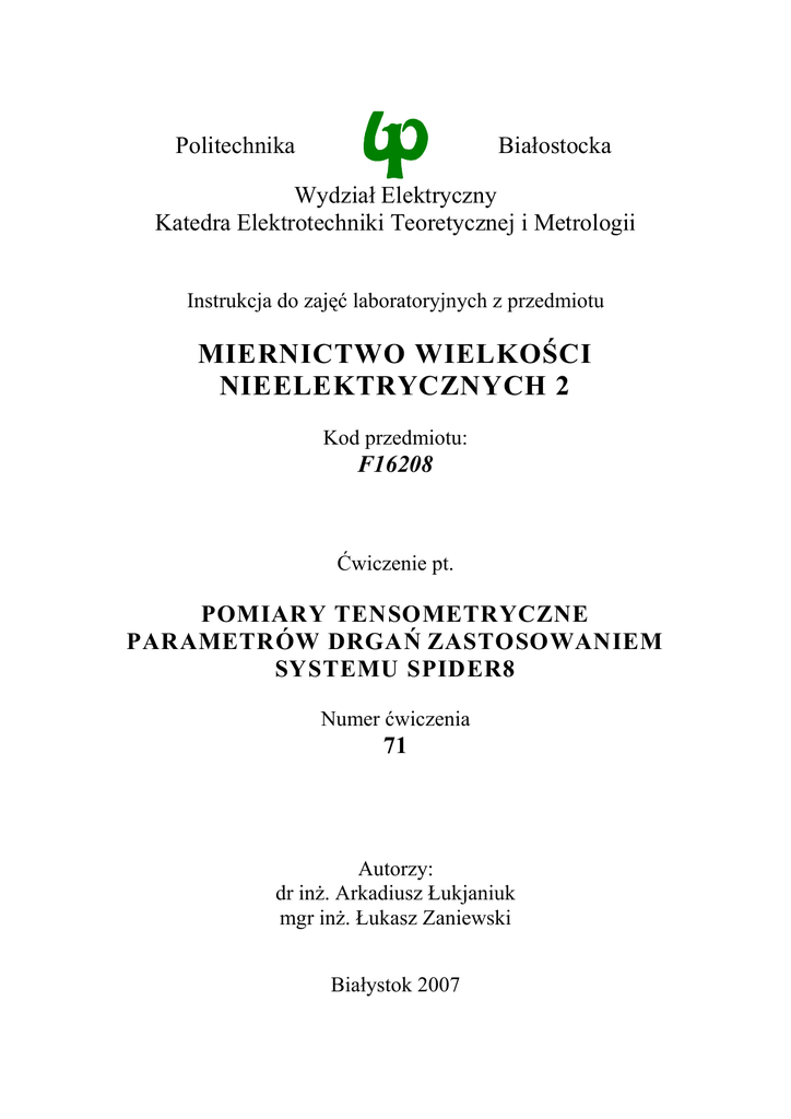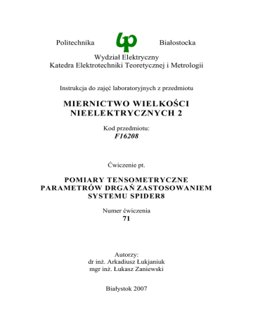 Politechnika Białostocka Wydział Elektryczny Katedra Elektrotechniki Teoretycznej i Metrologii Instrukcja do zajęć laboratoryjnych z przedmiotu MIERNICTWO WIELKOŚCI NIEELEKTRYCZNYCH 2 Kod przedmiotu: F16208 Ćwiczenie pt. POMIARY TENSOMETRYCZNE PARAMETRÓW DRGAŃ ZASTOSOWANIEM SYSTEMU SPIDER8 Numer ćwiczenia 71 Autorzy: dr inŜ. Arkadiusz Łukjaniuk mgr inŜ. Łukasz Zaniewski Białystok 2007 Ćwicz. Nr 71 Pomiary tensometryczne z zastosowaniem ... 2 1. Wprowadzenie C lem ćwiczenia jest zapoznanie studentów z pomiarami tensometrycznymi parametrów ruchu drgającego; nauczenie podstawowych zasad wykorzystywania w metrologii komputerowych systemów pomiarowym na przykładzie systemu Spider8. 1.1 Klasyfikacja drgań 1. Ze względu na liczbę stopni swobody: • o jednym stopniu swobody (rys. 1); • o wielu (skończonej liczbie) stopni swobody (rys. 2); • o nieskończonej liczbie stopni swobody (drgania ośrodków ciągłych – rys.3.) 2. Ze względu na charakter odkształceń spręŜystych układu: • podłuŜne (rys. 4); • poprzeczne (giętne) (rys. 5); • skrętne (rys. 6); • złoŜone (kombinacja poprzednich) (rys. 7); Ćwicz. Nr 71 Pomiary tensometryczne z zastosowaniem ... 3 3. Ze względu na przyczyny wywołujące drgania: • drgania własne lub swobodne; są to drgania wywołane jednorazowym wytrąceniem układu z połoŜenia równowagi spręŜystej, po czym układ jest pozostawiony samemu sobie; • drgania wymuszone; są to drgania, wzbudzane siłami zewnętrznymi, zmieniającymi się w czasie okresowo (rys. 8); • drgania parametryczne; są to drgania wywołane okresową zmianą parametrów układu (np. jego sztywności) (rys. 9); • drgania samowzbudne (autodrgania); są to drgania wzbudzane przez siły spowodowane samym ruchem (np. siły tarcia) (rys. 10); 4. Ze względu na moŜliwość występowania oporów: • drgania nietłumione (bez oporów) (rys. 11); • drgania tłumione (występowanie oporów) (rys. 12): - zewnętrznych (np. opór ośrodka – tarcie suche, opór wiskotyczny); - wewnętrznych (np. siły tarcia międzycząsteczkowego); Ćwicz. Nr 71 Pomiary tensometryczne z zastosowaniem ... 4 5. Ze względu na opis matematyczny ruchu: • drgania liniowe – opisane równaniami liniowymi; • drgania nieliniowe - opisane równaniami nieliniowymi (rys. 11 i 13). Rodzaje nieliniowości w układach drgających: • typu „naturalnego” wynikającego z konstrukcji i przeznaczenia maszyny (tarcie suche, wiskotyczne, konstrukcyjne, itp.); • „programowe”, występujące na skutek odpowiedniego doboru spręŜyn, stosowaniu luzów oraz stosowaniu nieliniowych amortyzatorów i tłumików. Tłumienie jest jednym z przejawów rozproszenia energii mechanicznej, nierozłącznie związanej z ruchem układów mechanicznych. Rodzaje tłumienia naturalnego: • wpływ środowiska (powietrze, ciecz, itp.); • tarcie wewnętrzne w materiale; • tarcie w podporach; • tarcie w połączeniach. Układ dyskretny moŜna zdefiniować jako układ, którego ruch jest opisany równaniami róŜniczkowymi zwyczajnymi o skończonej liczbie niewiadomych funkcji jednej zmiennej, np. czasu. an x + an−1 x + ...... + a1 x + a0 x = P(t ), n 1 gdzie: an,....,a0 – współczynniki równania; n x - n-ta pochodna; n – rząd równania róŜniczkowego; P(t) – funkcja wymuszeń (drgania wymuszone, jeśli P(t)=0, to mamy do czynienia z drganiami swobodnymi). JeŜeli wszystkie współczynniki an są liniowe, to układ (1) jest liniowy. W przeciwnym wypadku – nieliniowy. Praktycznie wszystkie układy są nieliniowe, Ćwicz. Nr 71 Pomiary tensometryczne z zastosowaniem ... 5 jednak jeśli amplitudy drgań są niewielkie, to nieliniowe zaleŜności moŜna zastąpić ich liniowymi przybliŜeniami, odrzucając wyrazy drugiego i wyŜszych rzędów. Wpływ drgań : • • • • • zakłócenie prawidłowości działania maszyn; zmniejszenie trwałości maszyn i urządzeń; szkodliwy wpływ drgań na organizm ludzki; hałas; zniszczenia maszyn i konstrukcji. 1.2 Drgania swobodne Rozpatrzmy drgania swobodne układu liniowego (P(t)=0). Równanie drgań swobodnych tłumionych układów o jednym stopniu swobody: •• • m x + α x + kx = 0 , (1) lub w postaci •• • x + 2n x + ω 0 x = 0 , gdzie: 2n = α , a ω 2 0 m = 2 k - jest kwadratem częstości drgań; m k – współczynnik spręŜystości [N/m]; m – masa układu drgającego; α - współczynnik tłumienia lepkiego [Ns/m=kg/s]);. • α y - opór ośrodka. Równanie charakterystyczne: r 2 + 2nr + ω02 = 0 . (3) Ogólne rozwiązanie równania (2) zaleŜy od znaku i wartości wyróŜnika równania (3). Występują trzy przypadki rozwiązań: • nadkrytyczne; • krytyczne; • podkrytyczne. (2) 6 Ćwicz. Nr 71 Pomiary tensometryczne z zastosowaniem ... 1.2.1. TŁUMIENIE NADKRYTYCZNE ∆ f 0 , czyli n f ω 0 Rozwiązanie ogólne ma postać: x = C1e r t + C2 e r t , 1 2 (4) gdzie: r1 i r2 pierwiastki równania (3) r1, 2 = − n ± n 2 − ω02 Stałe całkowania C1 i C2 zaleŜą od warunków początkowych. JeŜeli dla t = 0, x = x0 , • • • x = x0 , to stałe wynoszą: x0 − r2 x0 , C1 = r1 − r2 • C2 = x0 − r1 x0 r2 − r1 1.2.2. TŁUMIENIE KRYTYCZNE ∆ = 0, czyli n=ω ω0 Rozwiązanie ogólne równania (2) ma postać: x = e − nt (C1 + C 2 t ) (5) Stałe całkowania C1 i C2 zaleŜą od warunków początkowych i wynoszą: • C1 = x0 , C 2 = x0 + nx0 . Ostatecznie • x = e x0 + x0 + nx0 t . − nt (6) 1.2.3. TŁUMIENIE NADKRYTYCZNE ∆ < 0, czyli n < ω0 Rozwiązanie ogólne równania (2) ma postać: x = e − nt (C1 cos ω1t + C 2 sin ω1t ), gdzie: (7) ω1 = ω 02 − n 2 - częstość drgań swobodnych tłumionych. Stałe całkowania C1 i C2 zaleŜą od warunków początkowych i wynoszą: • C1 = x0 , C2 = nx0 + x0 ω1 . Ćwicz. Nr 71 Pomiary tensometryczne z zastosowaniem ... 7 Po przekształceniu moŜna zapisać w postaci: x = A0 e − nt sin (ω1t + ϕ ), (8) gdzie: 2 • nx0 + x0 , 2 2 2 A0 = C1 +