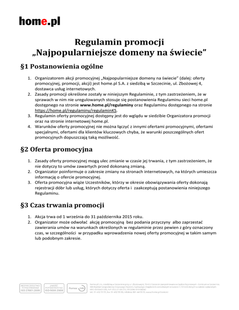 Regulamin promocji „Najpopularniejsze domeny na świecie” §1 Postanowienia ogólne 1. Organizatorem akcji promocyjnej „Najpopularniejsze domeny na świecie” (dalej: oferty promocyjnej, promocji, akcji) jest home.pl S.A. z siedzibą w Szczecinie, ul. Zbożowej 4, dostawca usług internetowych. 2. Zasady promocji określone zostały w niniejszym Regulaminie, z tym zastrzeżeniem, że w sprawach w nim nie uregulowanych stosuje się postanowienia Regulaminu sieci home.pl dostępnego na stronie www.home.pl/regulaminy oraz Regulaminu dostępnego na stronie https://home.pl/regulaminy/regulaminKS. 3. Regulamin oferty promocyjnej dostępny jest do wglądu w siedzibie Organizatora promocji oraz na stronie internetowej home.pl. 4. Warunków oferty promocyjnej nie można łączyć z innymi ofertami promocyjnymi, ofertami specjalnymi, ofertami dla klientów kluczowych chyba, że warunki poszczególnych ofert promocyjnych dopuszczają taką możliwość. §2 Oferta promocyjna 1. Zasady oferty promocyjnej mogą ulec zmianie w czasie jej trwania, z tym zastrzeżeniem, że nie dotyczy to umów zawartych przed dokonaną zmianą. 2. Organizator poinformuje o zakresie zmiany na stronach internetowych, na których umieszcza informację o ofercie promocyjnej. 3. Oferta promocyjna wiąże Uczestników, którzy w okresie obowiązywania oferty dokonają rejestracji dóbr lub usług, których dotyczy oferta i zaakceptują postanowienia niniejszego Regulaminu. §3 Czas trwania promocji 1. Akcja trwa od 1 września do 31 października 2015 roku. 2. Organizator może odwołać akcję promocyjną bez podania przyczyny albo zaprzestać zawierania umów na warunkach określonych w regulaminie przez pewien z góry oznaczony czas, w szczególności w przypadku wprowadzenia nowej oferty promocyjnej w takim samym lub podobnym zakresie. §4 Uczestnicy 1. Oferta promocyjna skierowana jest do osób fizycznych posiadających pełną zdolność do czynności prawnych, osób prawnych i jednostek organizacyjnych posiadających zdolność prawną, które: o zaakceptują postanowienia niniejszego Regulaminu, oraz o zaakceptują postanowienia dostępnego na stronie https://home.pl/regulaminy/regulaminKS oraz o w trakcie trwania oferty promocyjnej dokonają rejestracji nazw domen z końcówkami wskazanymi w tabeli zawartej w § 5 pkt 1. 2. Z warunków oferty promocyjnej nie mogą korzystać Uczestnicy, którzy nie dokonali płatności za usługi lub opóźnili się z płatnością za usługi oferowane przez Organizatora, albo dotychczas zawarte umowy wykonywali w sposób nienależyty chyba, że Organizator postanowi inaczej. 3. Z udziału w akcji wyłączeni są pracownicy Organizatora oraz członkowie ich rodzin, a także podmioty posiadające podpisane porozumienie z NASK (posiadające status registrara), ich udziałowcy, wspólnicy oraz pracownicy, a także członkowie rodzin podmiotów, posiadających podpisane porozumienie z NASK (posiadające status registrara) oraz członkowie rodzin udziałowców i wspólników tych podmiotów, chyba że Organizator postanowi inaczej. §5 Opis oferty promocyjnej 1. Uczestnicy, którzy spełnili warunki wskazane w § 4 uprawnieni są do dokonania rejestracji nazwy domen z końcówkami podanymi w tabeli jak niżej za zapłatą kwot wskazanych w tabeli jak niżej. Końcówka nazwy domeny: .biz Kwota Data trwania promocji 24,48 PLN od 1.09.2015 roku do 31.10.2015 roku *Podane ceny są cenami brutto, zawierają podatek VAT. 2. Uczestnik, który spełnił warunki określone w § 4 może zarejestrować za pośrednictwem Organizatora maksymalnie dziesięć domen .biz . Kolejne domeny rejestrowane są na zasadach i za zapłatą ceny określonej w cenniku Organizatora. Okres ważności domeny zarejestrowanej w ramach promocji wynosi 12 miesięcy od dnia rejestracji domeny. 3. Prolongata ważności domen zarejestrowanych w ramach oferty promocyjnej, po upływie pierwszego okresu rejestracji, odbywa się na warunkach obowiązujących w momencie odnowienia usługi i wynikających z cennika obowiązującego w tym momencie u Organizatora, bez uwzględniania jakichkolwiek promocji, rabatów, czy też upustów cenowych, bez względu na ich charakter, chyba że Organizator postanowi inaczej.
