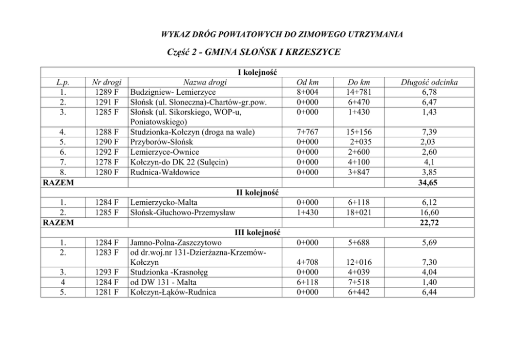 WYKAZ DRÓG POWIATOWYCH DO ZIMOWEGO UTRZYMANIA Część 2 - GMINA SŁOŃSK I KRZESZYCE I kolejność L.p. 1. 2. 3. 4. 5. 6. 7. 8. RAZEM Nr drogi 1289 F 1291 F 1285 F 1288 F 1290 F 1292 F 1278 F 1280 F Nazwa drogi Budzigniew- Lemierzyce Słońsk (ul. Słoneczna)-Chartów-gr.pow. Słońsk (ul. Sikorskiego, WOP-u, Poniatowskiego) Studzionka-Kołczyn (droga na wale) Przyborów-Słońsk Lemierzyce-Ownice Kołczyn-do DK 22 (Sulęcin) Rudnica-Wałdowice Od km 8+004 0+000 0+000 Do km 14+781 6+470 1+430 Długość odcinka 6,78 6,47 1,43 7+767 0+000 0+000 0+000 0+000 15+156 2+035 2+600 4+100 3+847 7,39 2,03 2,60 4,1 3,85 34,65 0+000 1+430 6+118 18+021 6,12 16,60 22,72 0+000 5+688 5,69 4+708 0+000 6+118 0+000 12+016 4+039 7+518 6+442 7,30 4,04 1,40 6,44 II kolejność 1. 2. RAZEM 1284 F 1285 F Lemierzycko-Malta Słońsk-Głuchowo-Przemysław III kolejność 1. 2. 3. 4 5. 1284 F 1283 F 1293 F 1284 F 1281 F Jamno-Polna-Zaszczytowo od dr.woj.nr 131-Dzierżazna-KrzemówKołczyn Studzionka -Krasnołęg od DW 131 - Malta Kołczyn-Łąków-Rudnica RAZEM OGÓŁEM I kolejność- jezdnia powinna być odśnieżona i posypana na całej długości, nie później niż w ciągu 8 godzin. Gołoledź, szron i szadź może występować do 8 godzin. II kolejnośćjezdnia powinna być odśnieżona na całej szerokości drogi i posypana na odcinkach: skrzyżowaniach z drogami, skrzyżowaniach z koleją, odcinkach o pochyleniu 4%, przystankach autobusowych, innych miejscach ustalonych przez Zarząd Dróg, nie później niż w ciągu 12 godzin. Gołoledź, szron i szadź może występować do 12 godzin. III kolejnośćjak w II kolejności do 14 godzin. IV kolejność – jezdnia powinna być odśnieżona na całej szerokości i długości w ciągu 14 godzin 24,87 82,24