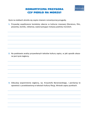 ROMANTYCZNA PRZYGODA CZY PIEKŁO NA MORZU? Życie na statkach określa się często mianem romantycznej przygody. 1. Przywołaj współczesne konteksty obecne w kulturze masowej (literatura, film, piosenka, komiks, reklama), wykorzystujące motywy podróży morskich. 2. Na podstawie analizy przywołanych tekstów kultury zapisz, w jaki sposób ukazane jest życie żeglarzy. 3. Odszukaj wspomnienia żeglarzy, np. Krzysztofa Baranowskiego, i porównaj te opowieści z przedstawioną w tekstach kultury fikcją. Wnioski zapisz punktach.