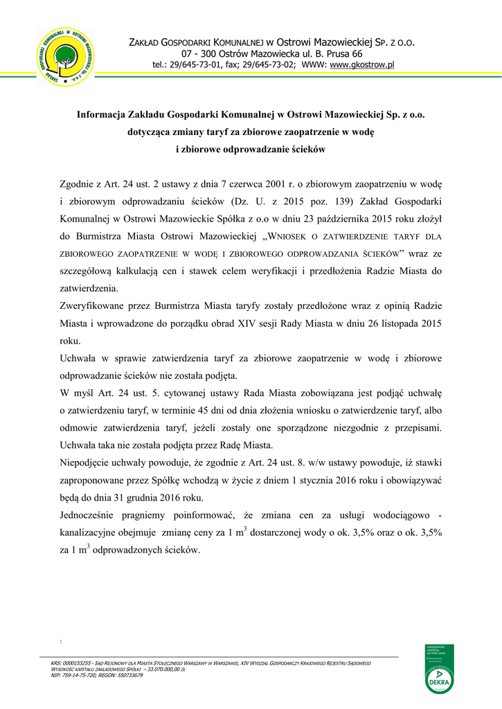 ZAKŁAD GOSPODARKI KOMUNALNEJ w Ostrowi Mazowieckiej SP. Z O.O. 07 - 300 Ostrów Mazowiecka ul. B. Prusa 66 tel.: 29/645-73-01, fax; 29/645-73-02; WWW: www.gkostrow.pl Informacja Zakładu Gospodarki Komunalnej w Ostrowi Mazowieckiej Sp. z o.o. dotycząca zmiany taryf za zbiorowe zaopatrzenie w wodę i zbiorowe odprowadzanie ścieków Zgodnie z Art. 24 ust. 2 ustawy z dnia 7 czerwca 2001 r. o zbiorowym zaopatrzeniu w wodę i zbiorowym odprowadzaniu ścieków (Dz. U. z 2015 poz. 139) Zakład Gospodarki Komunalnej w Ostrowi Mazowieckie Spółka z o.o w dniu 23 października 2015 roku złożył do Burmistrza Miasta Ostrowi Mazowieckiej „WNIOSEK O ZATWIERDZENIE TARYF DLA ZBIOROWEGO ZAOPATRZENIE W WODĘ I ZBIOROWEGO ODPROWADZANIA ŚCIEKÓW” wraz ze szczegółową kalkulacją cen i stawek celem weryfikacji i przedłożenia Radzie Miasta do zatwierdzenia. Zweryfikowane przez Burmistrza Miasta taryfy zostały przedłożone wraz z opinią Radzie Miasta i wprowadzone do porządku obrad XIV sesji Rady Miasta w dniu 26 listopada 2015 roku. Uchwała w sprawie zatwierdzenia taryf za zbiorowe zaopatrzenie w wodę i zbiorowe odprowadzanie ścieków nie została podjęta. W myśl Art. 24 ust. 5. cytowanej ustawy Rada Miasta zobowiązana jest podjąć uchwałę o zatwierdzeniu taryf, w terminie 45 dni od dnia złożenia wniosku o zatwierdzenie taryf, albo odmowie zatwierdzenia taryf, jeżeli zostały one sporządzone niezgodnie z przepisami. Uchwała taka nie została podjęta przez Radę Miasta. Niepodjęcie uchwały powoduje, że zgodnie z Art. 24 ust. 8. w/w ustawy powoduje, iż stawki zaproponowane przez Spółkę wchodzą w życie z dniem 1 stycznia 2016 roku i obowiązywać będą do dnia 31 grudnia 2016 roku. Jednocześnie pragniemy poinformować, że zmiana cen za usługi wodociągowo kanalizacyjne obejmuje zmianę ceny za 1 m3 dostarczonej wody o ok. 3,5% oraz o ok. 3,5% za 1 m3 odprowadzonych ścieków. : KRS: 0000153255 - SĄD REJONOWY DLA MIASTA STOŁECZNEGO WARSZAWY W WARSZAWIE, XIV WYDZIAŁ GOSPODARCZY KRAJOWEGO REJESTRU SĄDOWEGO WYSOKOŚĆ KAPITAŁU ZAKŁADOWEGO SPÓŁKI – 33.070.000,00 ZŁ NIP: 759-14-75-720; REGON: 550733679 TARYFY DLA ZBIOROWEGO ZAOPATRZENIA W WODĘ I ZBIOROWEGO ODPROWADZANIA ŚCIEKÓW NA TERENIE MIASTA OSTRÓW MAZOWIECKA OBOWIĄZUJĄCE OD 1 STYCZNIA 2016 DO 31 GRUDNIA 2016 L.p 1 1a 1b 1c 1d 1e 2 2a 2b 2c 2d 2e 2f 3 Wyszczególnienie ZAOPATRZENIE W WODĘ Grupa 1 - Cena 1m3 wody w zł/m3 /gospodarstwa domowe, przemysł, usługi Grupa 2 - Cena 1m3 wody w zł/m3 - sprzedaż hurtowa Stała opłata abonamentowa w zł/ odbiorcę/1 miesiąc /podstawa naliczenia wodomierz o średnicy 20 mm/ Stała opłata abonamentowa w zł/odbiorcę/1 miesiąc /podstawa naliczania wodomierz dodatkowy (podlicznik) o średnicy 20 mm oraz ryczałtowi odbiorcy wody/ Stała opłata abonamentowa z tytułu należności za wodę dostarczoną na cele p. poż/w zł/hydrant/1 miesiąc ODPROWADZANIE ŚCIEKÓW Grupa 1 - Cena usługi odprowadzania ścieków z gospodarstw domowych w zł/m3 Grupa 2 - Cena usługi odprowadzania ścieków z gospodarstw domowych w zł/m3 - odbiór hurtowy Grupa 3 - Cena usługi odprowadzania ścieków innych niż z gospodarstw domowych niebędących ściekami przemysłowymi w zł/m3 Grupa 4 - Cena usługi odprowadzania ścieków przemysłowych w zł/m3 Grupa 5 - Cena usługi odprowadzania ścieków przemysłowych ponadnormatywnych w zł/m3 Stała opłata abonamentowa w zł/odbiorcę/1 miesiąc /podstawa naliczenia przyłącze kanalizacyjne o średnicy 100 – 200 mm/ ODPROWADZANIE ŚCIEKÓW OPADOWYCH LUB Stawka usługi Cena Cena netto brutto 2,67 zł 2,88 zł 2,44 zł 2,64 zł 3,23 zł* 3,49zł* 2,14 zł* 2,31 zł* 6,35 zł 6,86 zł 3,75 zł 4,05 zł 3,18 zł 3,43 zł 5,50 zł 5,94 zł 5,64 zł 6,09 zł 8,18 zł 8,83 zł 2,95 zł 3,19 zł 2,70 zł 2,92 zł ROZTOPOWYCH Opłata za odprowadzanie ścieków opadowych lub 3a roztopowych w zł za 1m3 /rok *przy wodomierzach o średnicy większej niż20 mm opłatę należy pomnożyć przez współczynnik ekwiwalentu zgodnie z załącznikiem do wniosku taryfowego. Zarząd Spółki : KRS: 0000153255 - SĄD REJONOWY DLA MIASTA STOŁECZNEGO WARSZAWY W WARSZAWIE, XIV WYDZIAŁ GOSPODARCZY KRAJOWEGO REJESTRU SĄDOWEGO WYSOKOŚĆ KAPITAŁU ZAKŁADOWEGO SPÓŁKI – 33.070.000,00 ZŁ NIP: 759-14-75-720; REGON: 550733679