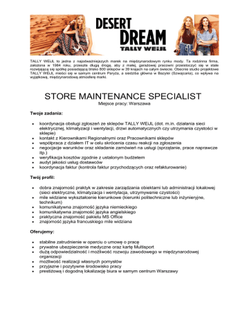 TALLY WEiJL to jedna z najodważniejszych marek na międzynarodowym rynku mody. Ta rodzinna firma, założona w 1984 roku, przeszła długą drogę, aby z małej, garażowej pracowni przeistoczyć się w stale rozwijającą się spółkę posiadającą blisko 800 sklepów w 39 krajach na całym świecie. Obecnie studio projektowe TALLY WEiJL mieści się w samym centrum Paryża, a siedziba główna w Bazylei (Szwajcaria), co wpływa na wyjątkową, międzynarodową atmosferę marki. STORE MAINTENANCE SPECIALIST Miejsce pracy: Warszawa Twoje zadania: koordynacja obsługi zgłoszeń ze sklepów TALLY WEiJL (dot. m.in. działania sieci elektrycznej, klimatyzacji i wentylacji, drzwi automatycznych czy utrzymania czystości w sklepie) kontakt z Kierownikami Regionalnymi oraz Pracownikami sklepów współpraca z działem IT w celu skrócenia czasu reakcji na zgłoszenia negocjacje warunków oraz składanie zamówień na usługi (sprzątanie, prace naprawcze itp.) weryfikacja kosztów zgodnie z ustalonym budżetem audyt jakości usług dostawców koordynacja faktur (kontrola faktur przychodzących oraz refakturowanie) Twój profil: dobra znajomość praktyk w zakresie zarządzania obiektami lub administracji lokalowej (sieci elektryczne, klimatyzacja i wentylacja, utrzymywanie czystości) mile widziane wykształcenie kierunkowe (kierunki politechniczne lub inżynieryjne, technikum) komunikatywna znajomość języka niemieckiego komunikatywna znajomość języka angielskiego praktyczna znajomość pakietu MS Office znajomość języka francuskiego mile widziana Oferujemy: stabilne zatrudnienie w oparciu o umowę o pracę prywatne ubezpieczenie medyczne oraz kartę Multisport dużą odpowiedzialność i możliwość rozwoju zawodowego w międzynarodowej organizacji możliwość realizacji własnych pomysłów przyjazne i pozytywne środowisko pracy prestiżową i dogodną lokalizację biura w samym centrum Warszawy