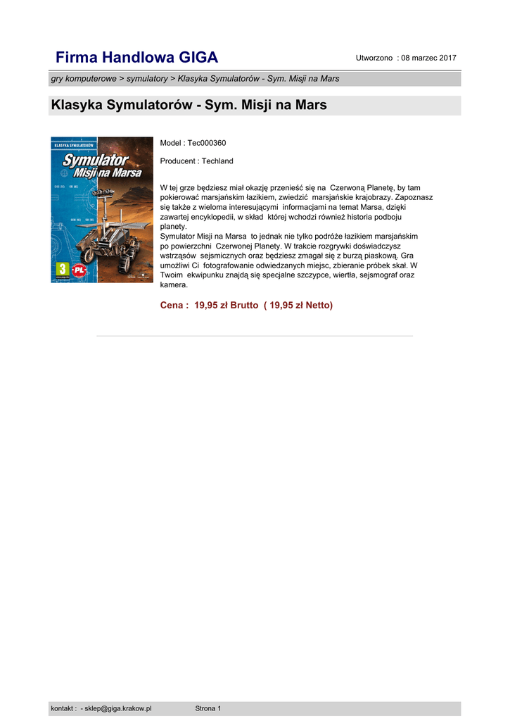 Firma Handlowa GIGA Utworzono : 08 marzec 2017 gry komputerowe > symulatory > Klasyka Symulatorów - Sym. Misji na Mars Klasyka Symulatorów - Sym. Misji na Mars Model : Tec000360 Producent : Techland W tej grze będziesz miał okazję przenieść się na Czerwoną Planetę, by tam pokierować marsjańskim łazikiem, zwiedzić marsjańskie krajobrazy. Zapoznasz się także z wieloma interesującymi informacjami na temat Marsa, dzięki zawartej encyklopedii, w skład której wchodzi również historia podboju planety. Symulator Misji na Marsa to jednak nie tylko podróże łazikiem marsjańskim po powierzchni Czerwonej Planety. W trakcie rozgrywki doświadczysz wstrząsów sejsmicznych oraz będziesz zmagał się z burzą piaskową. Gra umożliwi Ci fotografowanie odwiedzanych miejsc, zbieranie próbek skał. W Twoim ekwipunku znajdą się specjalne szczypce, wiertła, sejsmograf oraz kamera. Cena : 19,95 zł Brutto ( 19,95 zł Netto) kontakt : - [email protected] Strona 1