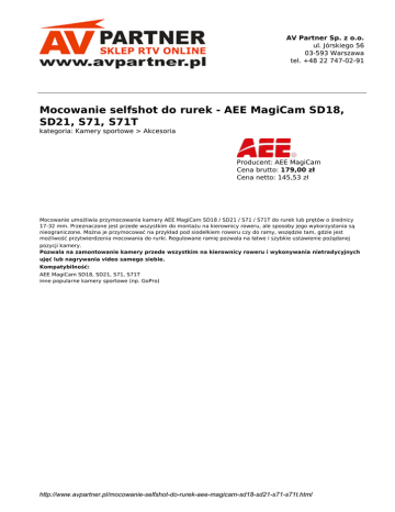 AV Partner Sp. z o.o. ul. Jórskiego 56 03-593 Warszawa tel. +48 22 747-02-91 Mocowanie selfshot do rurek - AEE MagiCam SD18, SD21, S71, S71T kategoria: Kamery sportowe > Akcesoria Producent: AEE MagiCam Cena brutto: 179,00 zł Cena netto: 145,53 zł Mocowanie umożliwia przymocowanie kamery AEE MagiCam SD18 / SD21 / S71 / S71T do rurek lub prętów o średnicy 17-32 mm. Przeznaczone jest przede wszystkim do montażu na kierownicy roweru, ale sposoby jego wykorzystania są nieograniczone. Można je przymocować na przykład pod siodełkiem roweru czy do ramy, wszędzie tam, gdzie jest możliwość przytwierdzenia mocowania do rurki. Regulowane ramię pozwala na łatwe i szybkie ustawienie pożądanej pozycji kamery. Pozwala na zamontowanie kamery przede wszystkim na kierownicy roweru i wykonywania nietradycyjnych ujęć lub nagrywania video samego siebie. Kompatybilność: AEE MagiCam SD18, SD21, S71, S71T inne popularne kamery sportowe (np. GoPro) http://www.avpartner.pl/mocowanie-selfshot-do-rurek-aee-magicam-sd18-sd21-s71-s71t.html