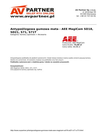 AV Partner Sp. z o.o. ul. Jórskiego 56 03-593 Warszawa tel. +48 22 747-02-91 Antypoślizgowa gumowa mata - AEE MagiCam SD18, SD21, S71, S71T kategoria: Kamery sportowe > Akcesoria Producent: AEE MagiCam Cena brutto: 75,00 zł Cena netto: 60,98 zł Antypoślizgowa podkładka do gładkich powierzchni. Dzięki łatwej instalacji można szybko zmienić pozycję kamery. Idealna do samochodu. W zestawie znajduje się podkładka oraz fast plug-in. Podkładka wykonana jest z miękkiej gumy i działa na zasadzie przyssawki. Kompatybilność: AEE MagiCam SD18, SD21, S71, S71T inne popularne kamery sportowe (np. GoPro) http://www.avpartner.pl/antyposlizgowa-gumowa-mata-aee-magicam-sd18-sd21-s71-s71t.html
