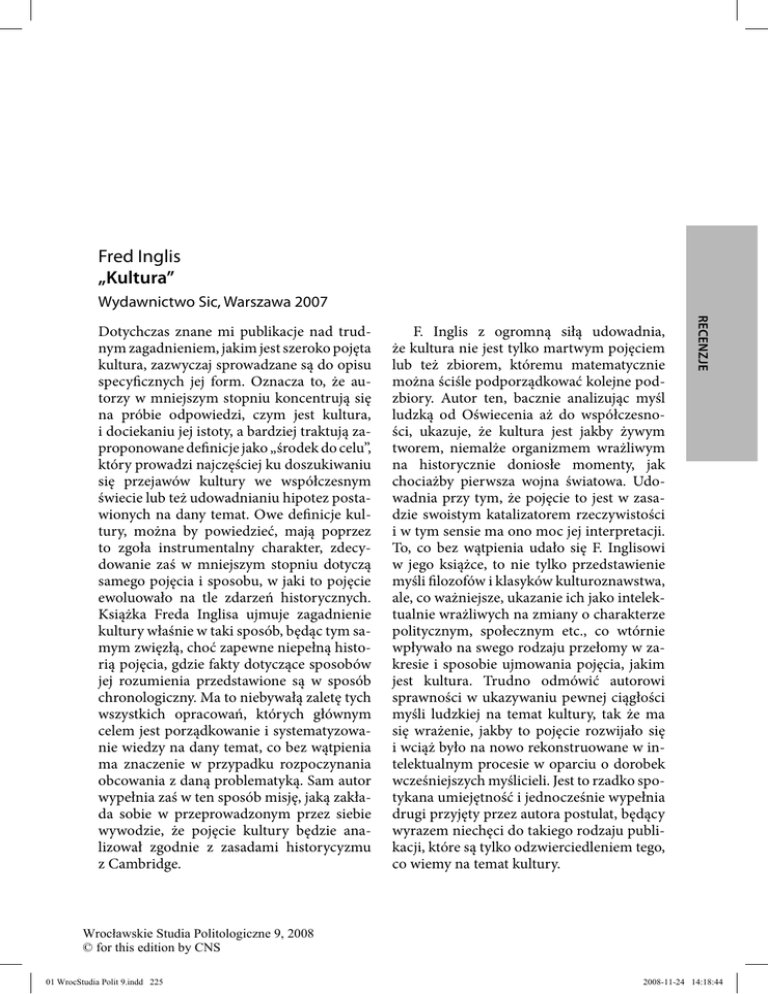 Fred Inglis „Kultura” Wydawnictwo Sic, Warszawa 2007 F. Inglis z ogromną siłą udowadnia, że kultura nie jest tylko martwym pojęciem lub też zbiorem, któremu matematycznie można ściśle podporządkować kolejne podzbiory. Autor ten, bacznie analizując myśl ludzką od Oświecenia aż do współczesności, ukazuje, że kultura jest jakby żywym tworem, niemalże organizmem wrażliwym na historycznie doniosłe momenty, jak chociażby pierwsza wojna światowa. Udowadnia przy tym, że pojęcie to jest w zasadzie swoistym katalizatorem rzeczywistości i w tym sensie ma ono moc jej interpretacji. To, co bez wątpienia udało się F. Inglisowi w jego książce, to nie tylko przedstawienie myśli filozofów i klasyków kulturoznawstwa, ale, co ważniejsze, ukazanie ich jako intelektualnie wrażliwych na zmiany o charakterze politycznym, społecznym etc., co wtórnie wpływało na swego rodzaju przełomy w zakresie i sposobie ujmowania pojęcia, jakim jest kultura. Trudno odmówić autorowi sprawności w ukazywaniu pewnej ciągłości myśli ludzkiej na temat kultury, tak że ma się wrażenie, jakby to pojęcie rozwijało się i wciąż było na nowo rekonstruowane w intelektualnym procesie w oparciu o dorobek wcześniejszych myślicieli. Jest to rzadko spotykana umiejętność i jednocześnie wypełnia drugi przyjęty przez autora postulat, będący wyrazem niechęci do takiego rodzaju publikacji, które są tylko odzwierciedleniem tego, co wiemy na temat kultury. RECENZJE Dotychczas znane mi publikacje nad trudnym zagadnieniem, jakim jest szeroko pojęta kultura, zazwyczaj sprowadzane są do opisu specyficznych jej form. Oznacza to, że autorzy w mniejszym stopniu koncentrują się na próbie odpowiedzi, czym jest kultura, i dociekaniu jej istoty, a bardziej traktują zaproponowane definicje jako „środek do celu”, który prowadzi najczęściej ku doszukiwaniu się przejawów kultury we współczesnym świecie lub też udowadnianiu hipotez postawionych na dany temat. Owe definicje kultury, można by powiedzieć, mają poprzez to zgoła instrumentalny charakter, zdecydowanie zaś w mniejszym stopniu dotyczą samego pojęcia i sposobu, w jaki to pojęcie ewoluowało na tle zdarzeń historycznych. Książka Freda Inglisa ujmuje zagadnienie kultury właśnie w taki sposób, będąc tym samym zwięzłą, choć zapewne niepełną historią pojęcia, gdzie fakty dotyczące sposobów jej rozumienia przedstawione są w sposób chronologiczny. Ma to niebywałą zaletę tych wszystkich opracowań, których głównym celem jest porządkowanie i systematyzowanie wiedzy na dany temat, co bez wątpienia ma znaczenie w przypadku rozpoczynania obcowania z daną problematyką. Sam autor wypełnia zaś w ten sposób misję, jaką zakłada sobie w przeprowadzonym przez siebie wywodzie, że pojęcie kultury będzie analizował zgodnie z zasadami historycyzmu z Cambridge. Wrocławskie Studia Politologiczne 9, 2008 © for this edition by CNS 01 WrocStudia Polit 9.indd 225 2008-11-24 14:18:44 RECENZJE 226 W ujęciu F. Inglisa kultura jest w zasadzie żywym obrazem, poprzez wykorzystanie zasadnego zabiegu polegającego na wpleceniu w przedstawione ujęcia problemu również osobistej sytuacji życiowej poszczególnych myślicieli. Autor kładzie nacisk na trudności, także na pewne ograniczenia wynikające z konkretnych kontekstów historycznych, z jakimi owi badacze musieli się zmierzyć i którym musieli się przeciwstawiać poprzez posiadaną przez nich charyzmę i pewną zdolność do nonkonformizmu. Kultura przedstawiona przez pryzmat osobowości jej twórców nabiera zatem charakteru spersonalizowanego. Jednocześnie staje się to przyczynkiem do pewnej metarefleksji nad istotą nauki jako takiej, która rządzi się surowymi prawami modnych w danym okresie trendów powodujących trudności w przebiciu się tych jednostek, które nie należą do głównego nurtu myśli1. Niebezzasadna wydaje się zatem dyskusja na temat tego, jak jednostka może kształtować rzeczywistość naukową wokół siebie. F. Inglis nie stroni od prób odpowiedzi na ten temat, jednak w jego wypadku mają one charakter zindywidualizowany, i nie sili się na poszukanie głębszych prawidłowości, co, wydaje się, można by było w sposób interesujący rozwinąć. Co również zwróciło moją uwagę, i uważam to za rzecz pozytywną, to poczucie dużego dystansu i wypracowanie przez autora obiektywizmu w stosunku do odwiecznego sporu między empirystami i interpretacjonistami – przeciwstawnymi obozami badaczy, których uwaga zwrócona jest na zjawisko kultury. F. Inglis oddaje należne zasługi obu tym grupom, wskazując, że kulturę można badać poprzez empiryczne oznaki czynów ludzkich, ale także poprzez idee, które są w dużej mierze właśnie interpretacją rzeczywistości. Jednocześnie pewnym ukierunkowaniem autora na interpretacjonizm jest stwierdzenie faktu, że neutralność w badaniach nad kulturą jest nieosiągalnym ideałem, ponieważ badacz jest również jej wytworem. Moim zdaniem świadomość pewnego rodzaju ograniczenia w tego typu prowadzonych badaniach otwiera pewną ścieżkę do dalszych rozważań na tematy silnie związane z interpretacjonizmem jako obszarem metodologicznym i rolą naukowca w tym zakresie2. Dla politologów szczególnie interesującą kwestią może się okazać ta część książki, która poświęcona jest wzajemnym wpływom polityki i kultury. Jednak, choć autor stara się oddać możliwie dokładnie momenty dominacji polityki nad kulturą i ukazuje konsekwencje z tym związane, to nie podejmuje się rozprawić z pojawieniem się konstruktu badawczego, jakim jest istnienie kultury politycznej w ujęciu klasycznym G.A. Almonda3. Wydaje się, że właśnie taki dodatkowy trop mógłby wzbogacić przedstawione przez autora przemyślenia, ukazując tym samym drugą stronę – że w jakimś sensie polityka może być również kulturą. Moim głównym zarzutem wobec a