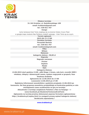 Miejsce turnieju 31-342 Kraków, ul. Radzikowskiego 109 email: [email protected] tel.: 530 821 707 Uwagi: korty tenisowe Krak Tenis znajdują się na terenie Hotelu Crown Piast w google.maps możecie Nas Państwo znaleźć wpisując : Krak Tenis sp.zo.o.sp.k. Termin zgłoszeń 2015-06-12 17:00 Dyrektor turnieju Parzyński Bartosz tel.: 530 821 707 email: [email protected] Piłka Wilson Wpisowe kategoria zielona : 50,00 zł Nagrody Nagrody rzeczowe Puchar Dyplom Medal Opis Kategoria Zielona: 13.06.2015 start godzina 13.00 , piłki Stage 1 Green, cały kort, roczniki 2005 i młodsze, chłopcy i dziewczynki razem, system rozgrywek w grupach, faza finałowa drabinka Zgłoszenia do 12.06.2015 do 17.00 Losowanie 12.06.2015 po 17.00 Będziemy informować zawodników o godzinie przyjazdu 12.06.2015 po losowaniu. Na fazę grupową zawodnicy przyjeżdżają na konkretną godzinę w celu zmniejszenia czasu oczekiwania na grę na turnieju. Aktualności o turnieju znajdziecie Państwo u Nas na fanpagu --> www.facebook.pl/AkademiaTenisowaKrakTenis Zgłoszenia na turniej prosimy dokonywać poprzez formularz zgłoszeniowy http://kraktenis.pl/zapisy.html (w uwagach proszę wpisać kategoria zielona) Serdecznie zapraszamy ! www.kraktenis.pl