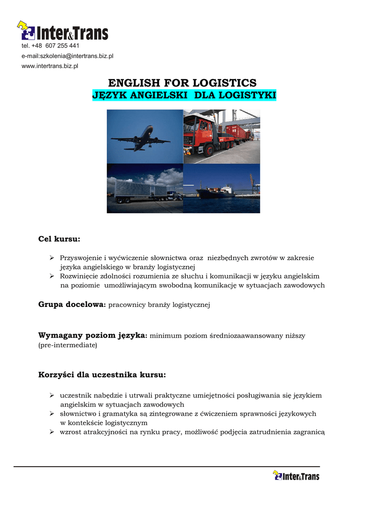 tel. +48 607 255 441 e-mail:[email protected] www.intertrans.biz.pl ENGLISH FOR LOGISTICS JĘZYK ANGIELSKI DLA LOGISTYKI Cel kursu: Przyswojenie i wyćwiczenie słownictwa oraz niezbędnych zwrotów w zakresie języka angielskiego w branży logistycznej Rozwinięcie zdolności rozumienia ze słuchu i komunikacji w języku angielskim na poziomie umożliwiającym swobodną komunikację w sytuacjach zawodowych Grupa docelowa: pracownicy branży logistycznej Wymagany poziom języka: minimum poziom średniozaawansowany niższy (pre-intermediate) Korzyści dla uczestnika kursu: uczestnik nabędzie i utrwali praktyczne umiejętności posługiwania się językiem angielskim w sytuacjach zawodowych słownictwo i gramatyka są zintegrowane z ćwiczeniem sprawności językowych w kontekście logistycznym wzrost atrakcyjności na rynku pracy, możliwość podjęcia zatrudnienia zagranicą Ramowa tematyka kursu: Jobs and regular activities in logistics (freight forwarder, carrier, haulage contractor, consignee, courier etc.) Logistics services (logistics acronyms, product ranges, 3PL providers, valueadded services) Inventory management, procurement and continuous replenishment Modes of transport (transport and handling equipment, container types, types of goods) Planning and arranging transport (transport options, measurements, quotations) Shipping goods ( markings, loading, advice of shipment, shipping instructions) Warehousing and storage (handling equipment, warehouse areas, warehousing today) Documentation and finance (documents in foreign trade, import instructions, payment methods) The supply chain (the importance of an efficient supply chain, using the supply chain to increase sales, the global supply chain) Relations with suppliers (the importance of good supplier relationships, minimising risks with suppliers, managing unexpected events and disasters) Global sourcing and manufacturing (development, outsourcing production to China, ethical sourcing) Transport and distribution (transporting fresh produce, the impact of higher energy costs, a new distribution model) Inventory management (managing changes in demand, fast-response logistics for retailing, using RFID for managing stock) ‘Greening’ the supply chain (reducing a company’s carbon footprint, moving beyond logistics) Business correspondence (formal and informal e-mails, giving news, internal messages, a customer-supplier sequence, inquiries and orders, arranging meetings, discussing and agreeing terms, asking for payment, describing business trends etc.) Szczegółowy materiał leksykalno–gramatyczny zależy od poziomu grupy. Czas trwania kursu: standardowy kurs składa się ze 120 godzin lekcyjnych. Zajęcia odbywają się 2x w tygodniu, każdorazowo po 90 minut. Istnieje również możliwość zwiększenia/zmniejszenia ilości godzin, w zależności od potrzeb grupy. Metodyka kursu: metoda klasyczna połączona z metodą komunikatywną, kładącą nacisk na rozwijanie sprawności mówienia i rozumienia ze słuchu. Zajęcia prowadzone przez mgr filologii angielskiej Uniwersytetu Warszawskiego, nauczyciela z 7-letnim doświadczeniem dydaktycznym, w tym 3-letnim doświadczeniem w branży biznesowej jako lektor prowadzący kursy specjalistyczne. Inter & Trans Daj sobie przetłumaczyć – języki nie są nam obce!