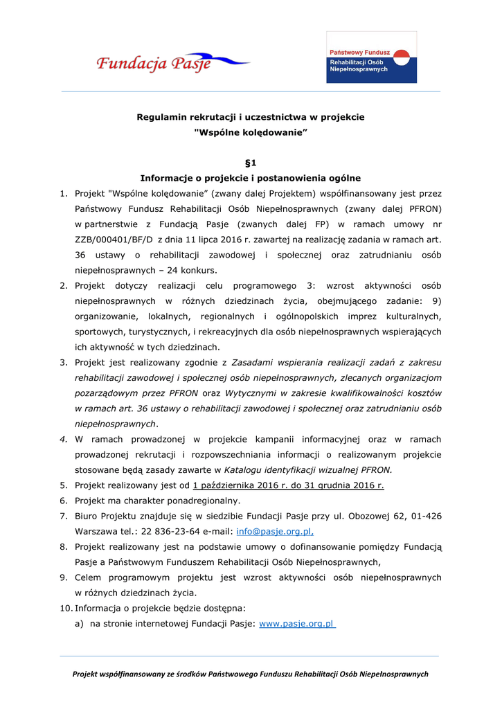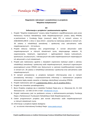 Regulamin rekrutacji i uczestnictwa w projekcie "Wspólne kolędowanie” §1 Informacje o projekcie i postanowienia ogólne 1. Projekt "Wspólne kolędowanie” (zwany dalej Projektem) współfinansowany jest przez Państwowy Fundusz Rehabilitacji Osób Niepełnosprawnych (zwany dalej PFRON) w partnerstwie z Fundacją Pasje (zwanych dalej FP) w ramach umowy nr ZZB/000401/BF/D z dnia 11 lipca 2016 r. zawartej na realizację zadania w ramach art. 36 ustawy o rehabilitacji zawodowej i społecznej oraz zatrudnianiu osób wzrost aktywności osób niepełnosprawnych – 24 konkurs. 2. Projekt dotyczy realizacji niepełnosprawnych organizowanie, w celu różnych lokalnych, programowego dziedzinach regionalnych i 3: życia, obejmującego ogólnopolskich imprez zadanie: 9) kulturalnych, sportowych, turystycznych, i rekreacyjnych dla osób niepełnosprawnych wspierających ich aktywność w tych dziedzinach. 3. Projekt jest realizowany zgodnie z Zasadami wspierania realizacji zadań z zakresu rehabilitacji zawodowej i społecznej osób niepełnosprawnych, zlecanych organizacjom pozarządowym przez PFRON oraz Wytycznymi w zakresie kwalifikowalności kosztów w ramach art. 36 ustawy o rehabilitacji zawodowej i społecznej oraz zatrudnianiu osób niepełnosprawnych. 4. W ramach prowadzonej w projekcie kampanii informacyjnej oraz w ramach prowadzonej rekrutacji i rozpowszechniania informacji o realizowanym projekcie stosowane będą zasady zawarte w Katalogu identyfikacji wizualnej PFRON. 5. Projekt realizowany jest od 1 października 2016 r. do 31 grudnia 2016 r. 6. Projekt ma charakter ponadregionalny. 7. Biuro Projektu znajduje się w siedzibie Fundacji Pasje przy ul. Obozowej 62, 01-426 Warszawa tel.: 22 836-23-64 e-mail: [email protected], 8. Projekt realizowany jest na podstawie umowy o dofinansowanie pomiędzy Fundacją Pasje a Państwowym Funduszem Rehabilitacji Osób Niepełnosprawnych, 9. Celem programowym projektu jest wzrost aktywności osób niepełnosprawnych w różnych dziedzinach życia. 10. Informacja o projekcie będzie dostępna: a) na stronie internetowej Fundacji Pasje: www.pasje.org.pl Projekt współfinansowany ze środków Państwowego Funduszu Rehabilitacji Osób Niepełnosprawnych b) w instytucjach i urzędach świadczących usługi dla osób niepełnosprawnych, oraz na ich stronach internetowych. 11. Niniejszy Regulamin określa zasady rekrutacji, w tym naboru i doboru osób niepełnosprawnych i osób z ich otoczenia do udziału w projekcie. §2 Zasady rekrutacji do Projektu 1. Rekrutacja prowadzona będzie na terenie woj. mazowieckiego, zachodniopomorskiego i warmińsko-mazurskiego. 2. W procesie rekrutacji będzie stosowana polityka równości płci. Nabór do Projektu będzie miał charakter otwarty, o przyjęciu do niego będzie decydowała kolejność zgłoszeń w każdym województwie, sytuacja kandydata w tym zakres aktywności życiowej oraz posiadanie dokumentu stwierdzającego zakwalifikowanie do grupy osób niepełnosprawnych oraz deklaracja uczestnictwa ich opiekunów oraz osób z ich otoczenia, najbliższej rodziny. Aby zapewnić realizację celów dotyczących udziałów danej ilości osób niepełnosprawnych w tym dorosłych i dzieci oraz osób z ich rodzin, będzie prowadzona papierowa ewidencja zgłoszeń wszystkich osób. 3. Podczas rekrutacji stosowana będzie zasada równości płci i równości szans - zgodnie z kryteriami przewidzianymi w projekcie. 4. Procedura rekrutacyjna uwzględnia i zobowiązuje osoby odpowiedzialne za realizację Projektu do przestrzegania kwestii ochrony danych osobowych. 5. Bieżący monitoring nad procesem rekrutacji uczestników/czek Projektu prowadzi Koordynator Projektu oraz Specjalista ds. organizacji spotkań. 6. Za przeprowadzenie rekrutacji osób do uczestnictwa w Projekcie odpowiedzialny jest Koordynator Projektu i wolontariusz: Specjalista ds. organizacji spotkań. 7. Specjalista ds. organizacji spotkań zobowiązany jest do prowadzenia kompletnej dokumentacji rekrutacyjnej oraz przygotowania raportu podsumowującego proces rekrutacji z zachowaniem polityki bezpieczeństwa. 8. Przystąpienie Kandydata/tki do procesu rekrutacji jest równoznaczne z zaakceptowaniem niniejszego Regulaminu. 9. Kompletne i poprawne formularze zgłoszeniowe, zawierające również oświadczenia wprowadzane i rejestrowane będą według daty ich wpływu. Zostanie też stworzona lista rezerwowa dla każdego województwa, oddzielna dla mazowieckiego, warmińskomazurskiego i zachodniopomorskiego, obejmująca osoby niezakwalifikowane z powodu braku miejsc w pierwszym etapie projektu. 10. Procedura rekrutacyjna składa się z następujących etapów: Projekt współfinansowany ze środków Państwowego Funduszu Rehabilitacji Osób Niepełnosprawnych a) przyjmowanie dokumentów rekrutacyjnych od osób zainteresowanych udziałem w Projekcie – formularz zgłoszeniowy i oświadczenie dot. przetwarzania danych osobowych Uczestnika/czki oraz oświadczenie o wykorzystaniu wizerunku, b) weryfikowanie dokumentów zgłoszeniowych, wybór osób, które zostaną zakwalifikowane do udziału w Projekcie, c) potwierdzenie spełnienia warunków uczestnictwa w Projekcie przez osobę rekrutującą (ostatnia strona formularza zgłoszeniowego), d) złożenie deklaracji uczestnictwa w Projekcie, e) sporządzenie listy Uczestników/czek zakwalifikowanych do Projektu, f) sporządzenie rezerwowej listy Uczestników/czek. §3 Warunki uczestnictwa w Projekcie 1. Uczestnikami/czkami są: Dorosłe osoby niepełnosprawne w wieku od 18 lat w liczbie 99 oraz niepełnosprawne dzieci w liczbie 18 osób, posiadające orzeczenie o stopniu niepełnosprawności lub inne równoważne zaświadczenie potwierdzające niepełnosprawność, a także osoby z otoczenia niepełnosprawnych, osoby z ich rodzin w liczbie 153 osoby. 2. Rekrutacja uczestników jest prowadzona na terenie 3 województw natomiast wieczory wigilijne zostaną zorganizowanie w: Warszawie - 90 osób Orzyszu - 90 os