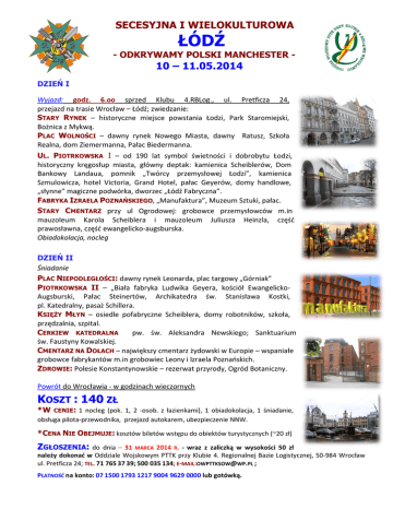 SECESYJNA I WIELOKULTUROWA ŁÓDŹ ` - ODKRYWAMY POLSKI MANCHESTER - 10 – 11.05.2014 DZIEŃ I Wyjazd: godz. 6.oo sprzed Klubu 4.RBLog., ul. Pretficza 24, przejazd na trasie Wrocław – Łódź; zwiedzanie: STARY RYNEK – historyczne miejsce powstania Łodzi, Park Staromiejski, Bożnica z Mykwą. PLAC WOLNOŚCI – dawny rynek Nowego Miasta, dawny Ratusz, Szkoła Realna, dom Ziemermanna, Pałac Biedermanna. UL. PIOTRKOWSKA I – od 190 lat symbol świetności i dobrobytu Łodzi, historyczny kręgosłup miasta, główny deptak: kamienica Scheiblerów, Dom Bankowy Landaua, pomnik „Twórcy przemysłowej Łodzi”, kamienica Szmulowicza, hotel Victoria, Grand Hotel, pałac Geyerów, domy handlowe, „słynne” magiczne podwórka, dworzec „Łódź Fabryczna”. FABRYKA IZRAELA POZNAŃSKIEGO, „Manufaktura”, Muzeum Sztuki, pałac. STARY CMENTARZ przy ul Ogrodowej: grobowce przemysłowców m.in mauzoleum Karola Scheiblera i mauzoleum Juliusza Heinzla, część prawosławna, część ewangelicko-augsburska. Obiadokolacja, nocleg DZIEŃ II Śniadanie PLAC NIEPODLEGŁOŚCI: dawny rynek Leonarda, plac targowy „Górniak” PIOTRKOWSKA II – „Biała fabryka Ludwika Geyera, kościół EwangelickoAugsburski, Pałac Steinertów, Archikatedra św. Stanisława Kostki, pl. Katedralny, pasaż Schillera. KSIĘŻY MŁYN – osiedle pofabryczne Scheiblera, domy robotników, szkoła, przędzalnia, szpital. CERKIEW KATEDRALNA pw. św. Aleksandra Newskiego; Sanktuarium św. Faustyny Kowalskiej. CMENTARZ NA DOŁACH – największy cmentarz żydowski w Europie – wspaniałe grobowce fabrykantów m.in grobowiec Leony i Izraela Poznańskich. ZDROWIE: Polesie Konstantynowskie – rezerwat przyrody, Ogród Botaniczny. Powrót do Wrocławia - w godzinach wieczornych KOSZT : 140 ZŁ *W CENIE: 1 nocleg (pok. 1, 2 -osob. z łazienkami), 1 obiadokolacja, 1 śniadanie, obsługa pilota-przewodnika, przejazd autokarem, ubezpieczenie NNW. *CENA NIE OBEJMUJE: kosztów biletów wstępu do obiektów turystycznych (~20 zł) ZGŁOSZENIA: do dnia – 31 MARCA 2014 R. - wraz z zaliczką w wysokości 50 zł należy dokonać w Oddziale Wojskowym PTTK przy Klubie 4. Regionalnej Bazie Logistycznej, 50-984 Wrocław ul. Pretficza 24; TEL. 71 765 37 39; 500 035 134; E-MAIL:[email protected] ; PŁATNOŚĆ na konto: 07 1500 1793 1217 9004 9629 0000 lub gotówką.