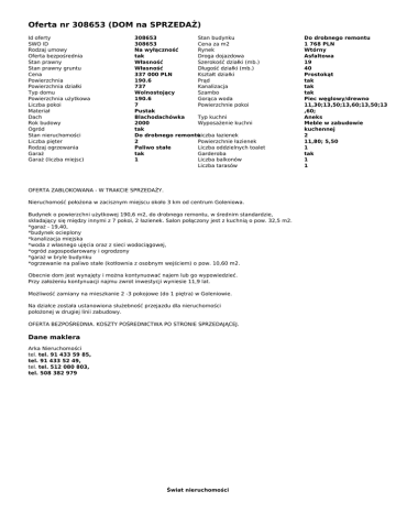 Oferta nr 308653 (DOM na SPRZEDAŻ) Id oferty SWO ID Rodzaj umowy Oferta bezpośrednia Stan prawny Stan prawny gruntu Cena Powierzchnia Powierzchnia działki Typ domu Powierzchnia użytkowa Liczba pokoi Materiał Dach Rok budowy Ogród Stan nieruchomości Liczba pięter Rodzaj ogrzewania Garaż Garaż (liczba miejsc) 308653 Stan budynku 308653 Cena za m2 Na wyłączność Rynek tak Droga dojazdowa Własność Szerokość działki (mb.) Własność Długość działki (mb.) 337 000 PLN Kształt działki 190.6 Prąd 737 Kanalizacja Wolnostojący Szambo 190.6 Gorąca woda 7 Powierzchnie pokoi Pustak Blachodachówka Typ kuchni 2000 Wyposażenie kuchni tak Do drobnego remontu Liczba łazienek 2 Powierzchnie łazienek Paliwo stałe Liczba oddzielnych toalet tak Garderoba 1 Liczba balkonów Liczba tarasów OFERTA ZABLOKOWANA - W TRAKCIE SPRZEDAŻY. Nieruchomość położona w zacisznym miejscu około 3 km od centrum Goleniowa. Budynek o powierzchni użytkowej 190,6 m2, do drobnego remontu, w średnim standardzie, składający się między innymi z 7 pokoi, 2 łazienek. Salon połączony jest z kuchnią o pow. 32,5 m2. *garaż - 19,40, *budynek ocieplony *kanalizacja miejska *woda z własnego ujęcia oraz z sieci wodociągowej, *ogród zagospodarowany i ogrodzony *garaż w bryle budynku *ogrzewanie na paliwo stałe (kotłownia z osobnym wejściem) o pow. 10,60 m2. Obecnie dom jest wynajęty i można kontynuować najem lub go wypowiedzieć. Przy założeniu kontynuacji najmu zwrot inwestycji wyniesie 11,9 lat. Możliwość zamiany na mieszkanie 2 -3 pokojowe (do 1 piętra) w Goleniowie. Na działce została ustanowiona służebność przejazdu dla nieruchomości położonej w drugiej linii zabudowy. OFERTA BEZPOŚREDNIA. KOSZTY POŚREDNICTWA PO STRONIE SPRZEDAJĄCEJ. Dane maklera Arka Nieruchomości tel. tel. 91 433 59 85, tel. 91 433 52 49, tel. tel. 512 080 803, tel. 508 382 979 Świat nieruchomości Powered by TCPDF (www.tcpdf.org) Do drobnego remontu 1 768 PLN Wtórny Asfaltowa 19 40 Prostokąt tak tak tak Piec węglowy/drewno 11,30;13,50;13,60;13,50;13 ,60; Aneks Meble w zabudowie kuchennej 2 11,80; 5,50 1 tak 1 1